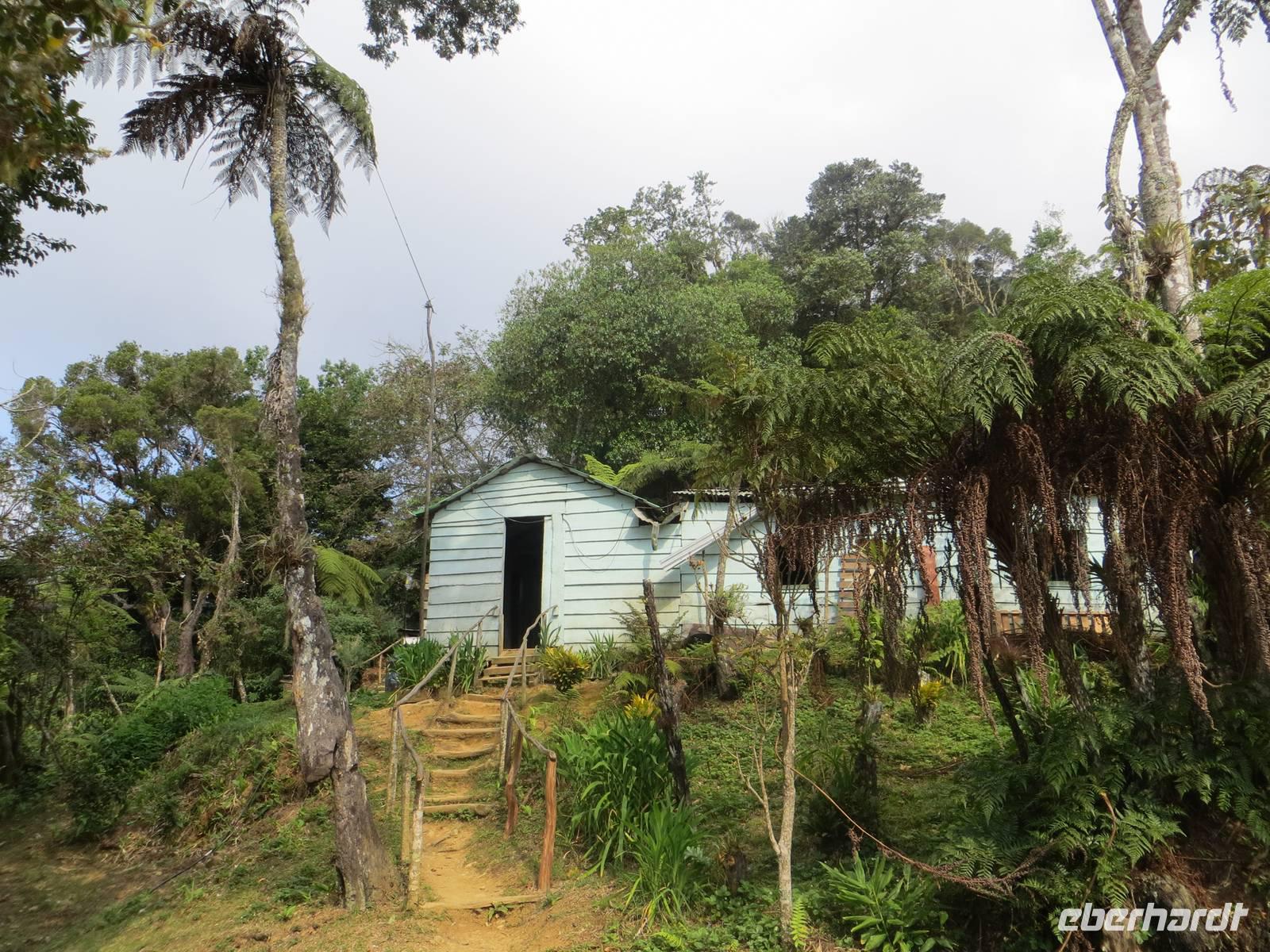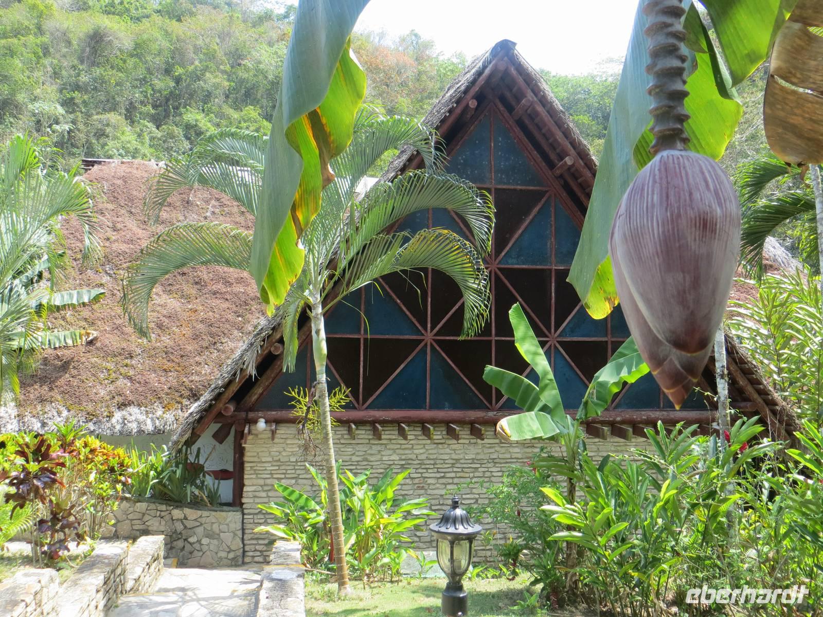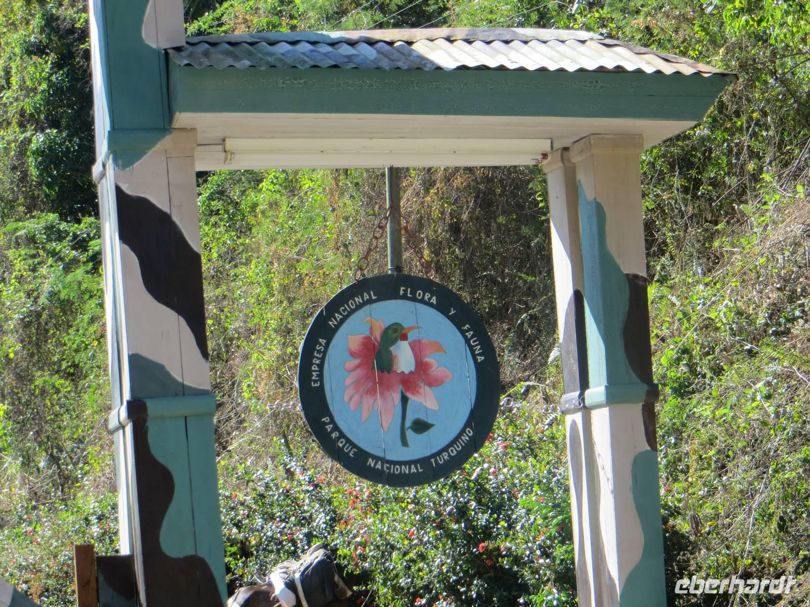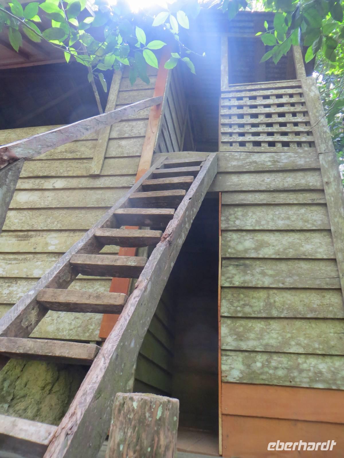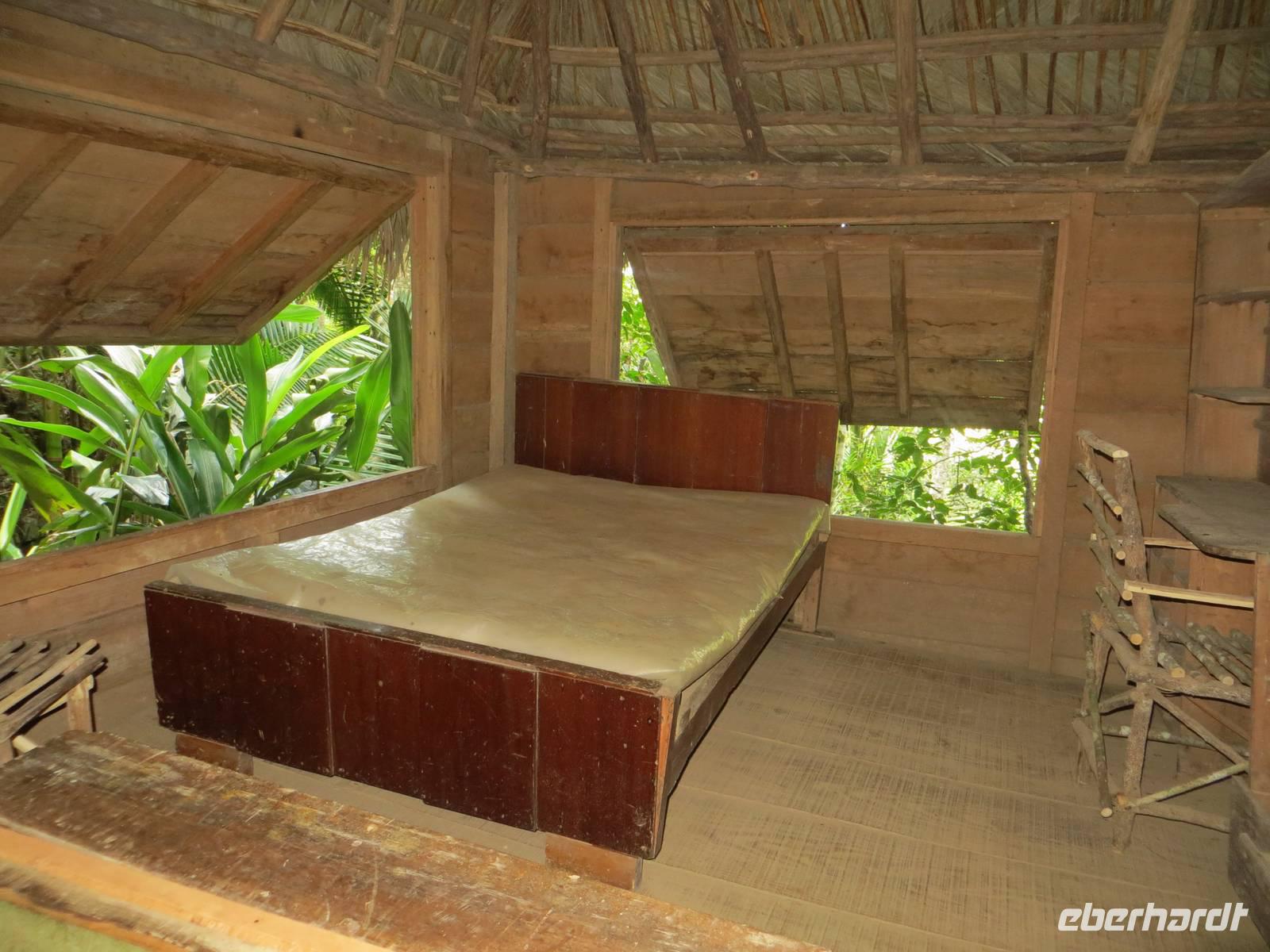 Der erste Teil des Weges ist angenehm zu gehen. Nur ein paar Meter hinter der Passhöhe Alto de Naranjo wird er anspruchsvoller, die Anstiege wesentlich steiler und der Wald undurchdringlich. Die Wege sind steil und nicht breiter als ein Esel. Wir schlängeln uns durch ein Labyrinth aus Palmen, Riesenbambus, Farnen und Wurzeln und klettern über umgestürzte Bäume. Es ist heiß, denn durch den dichten Dschungel weht kaum ein Wind. Man hat das Gefühl, er saugt die Geräusche auf wie ein Schwamm. Nur das Waten der Füße im Morast und Zwitschern der Vögel sind zu hören. Am Abend zuvor haben wir unseren Trinkproviant aufgestockt. Das ist bei 30 °C und 80 % Luftfeuchtigkeit sehr wichtig - auch wenn wir eine Menge zu tragen hatten, war es gut nicht am Wasser gespart zu haben! Es sind nur acht Kilometer über 400 Höhenmetern, doch irgendwie auch die längsten acht Kilometer, die wir bisher kennen. Wir haben das Gefühl, die Höhenmeter vielmals erneut hoch und runter zu wandern. Unser lokaler Wanderführer und Alien, die zur Hochsaison bis zu 6 Mal die Woche den Berg hinaufsteigen, scheinen den Berg mühelos hochzugleiten, während wir total aus der Puste sind und ganz schön ins Schwitzen kommen. Doch die wundervoll unberührter Natur und die herrlichen Ausblicke, die wir in den vielen kurzen Verschnaufpausen genießen, sind jede Mühe wert! Stufe für Stufe mühen wir uns den Berg hinauf bis zur Waldstation Aguada de Joaquin auf knapp 1.400 Metern. Wir sehen zwei Hütten: eine mit mehreren Doppelstockbetten, wo wir unsere Nacht verbringen werden und eine andere, mit Küche, Wohn- und Esszimmer der Ranger. Die Hütten und sanitären Einrichtungen sind sehr, sehr einfach. Per Funkgerät hat man Verbindung ins Tal. Es gibt sogar Solarpanels - diese sind für den Betrieb des obligatorischen Fernsehers wichtig.