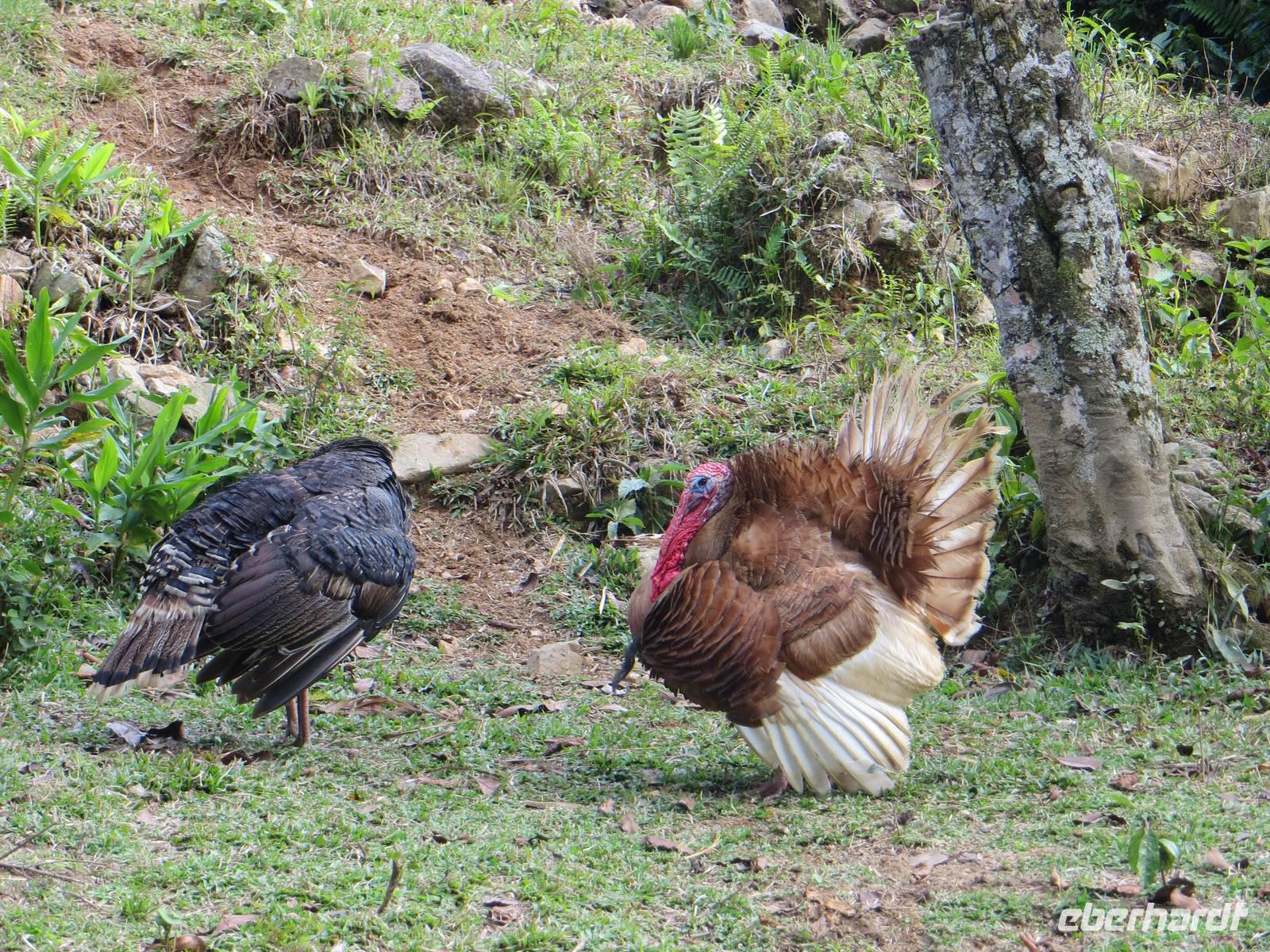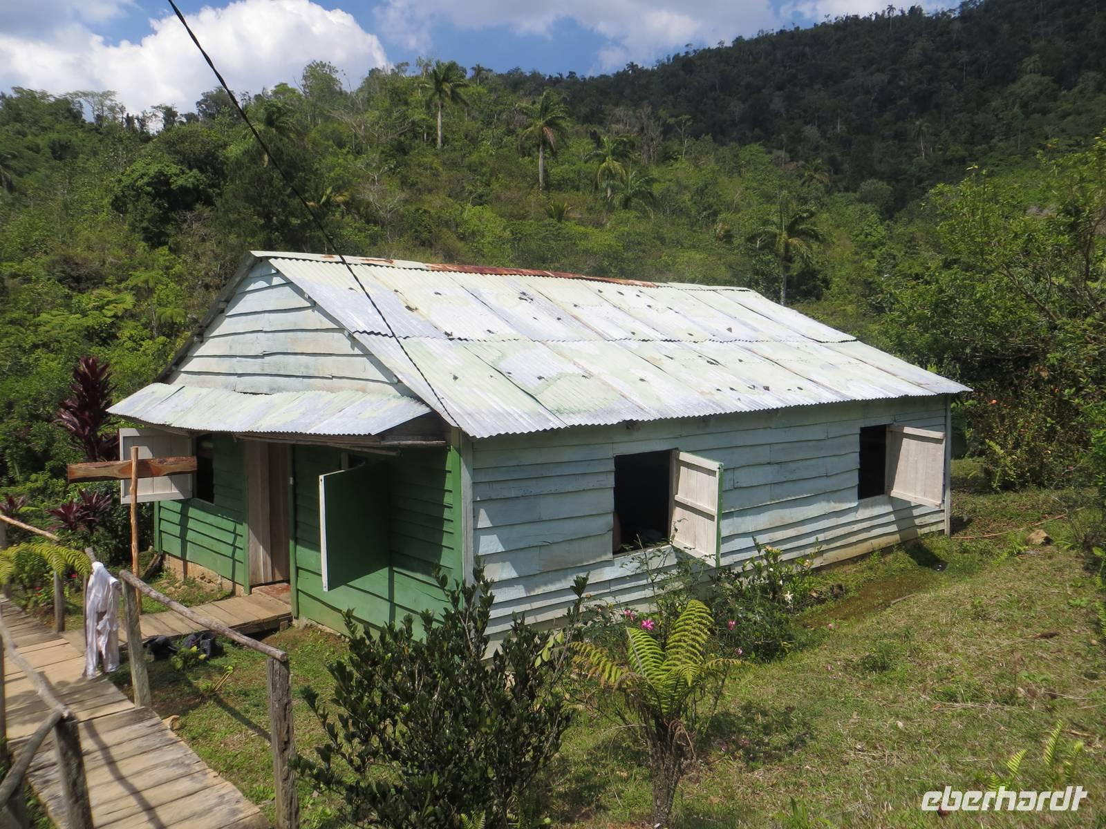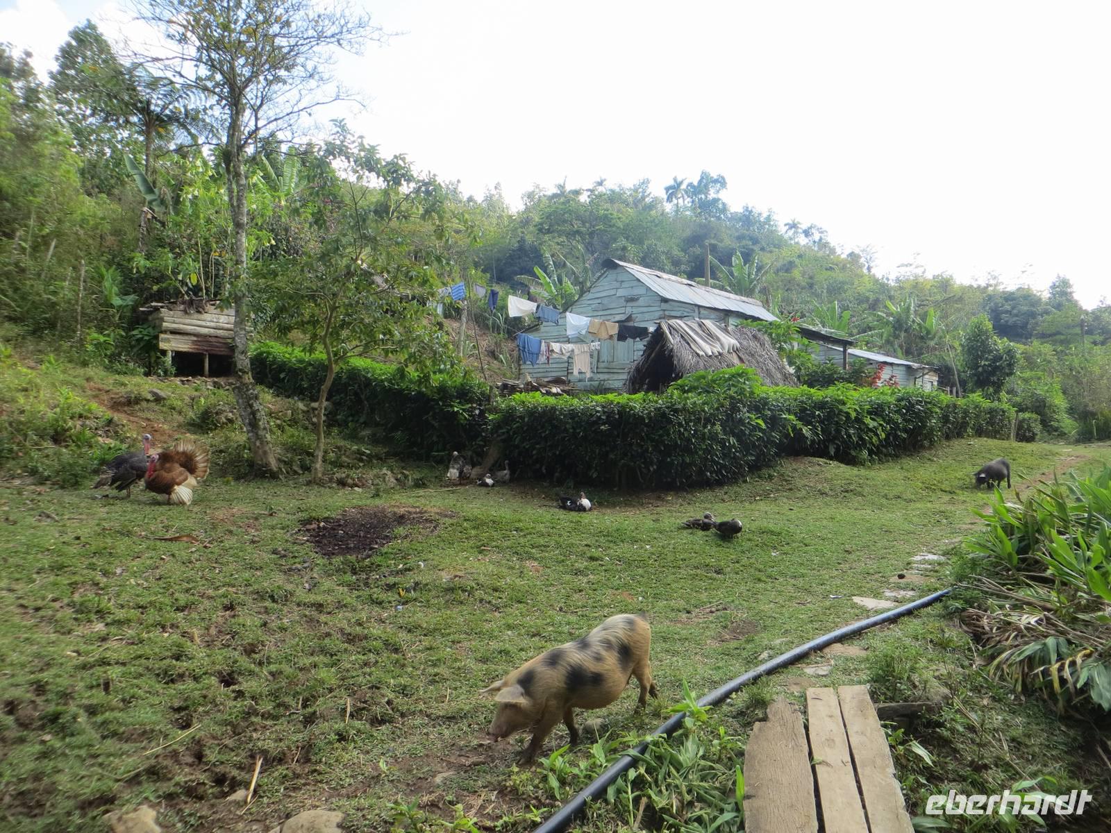 Die jüngere deutsche Gruppe steht bereits um 06:00 Uhr auf, um nach dem Frühstück noch in den Morgenstunden auf den Gipfel des Pico Turquino zu gelangen. Wir entscheiden uns, den Tag gemütlicher zu gestalten und schlafen noch ein wenig länger. Später bewundern wir die Spitze des Turquinos nur von Weitem von unserer Hütte aus und halten den tollen Anblick mit der Fotokamera fest. Nun bringt uns Alien wieder den Berg herab. Erneut wandern wir durch dichten Dschungel, vorbei an Limetten- und Zitronenbäumen sowie verschiedenen Wildkräutern. Unterwegs begenen wir einigen bunten Schmetterlingen, Kolibris und Vögel. Bereits am frühen Nachmittag erreichen wir das kleine Dorf La Platica auf ca. 900 Meter Höhe, die zweite Übernachtungsstätte unserer dreitägigen Wanderungs. Die Terrasse weit oben auf dem Berghang, auf der wir zu Mittag und Abend essen, bietet ein wundervolles Panorama über das Tal und die umliegenden Berge. Wir bekommen die Außmaße und Schönheit der Berghänge vor Augen zu sehen. Im Tal sollen genau 39 Einwohner in 9 Häusern leben. Bei einem kleinen Spaziergang durch das winzige Dorf bestaunen wir die schönen Gärten vor den Hütten, machen Fotos von den Trutänen und Schweinen auf den Höfen sowie von lachenden Kindern, die noch nicht dem Internet- und digitalen Spielwahn verfallen sind.