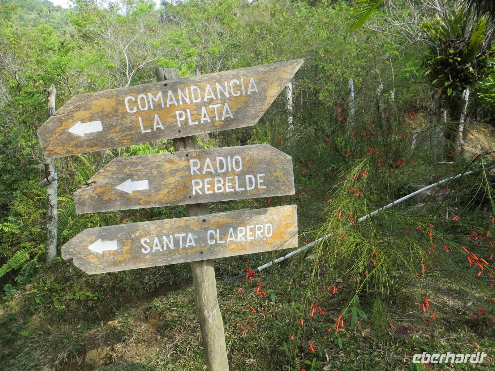 Dieser Tag steht ganz im Zeichen der Revolutionäre Fidel und Ché. Versteckt in den Bergen hielten sich die Revolutionäre um Fidel Castro nach ihrer Landung aus Mexiko auf, um die Revolution vorzubereiten. Hier also ist der Ort, an dem vor 50 Jahren mit dem Generalkommando der Rebellenarmee unter der Führung Fidel Castro die kubanische Revolution ihren Ausgang nahm. Wir besichtigten die Kommandantur mit einigen Häusern, darunter das Feldlazarett, in dem Ché (Ernesto Guevara de la Serna) Verwundete verarztete und die Casa Comandante von Fidel Castro. In der Hütte des Revolutionsführers sind bis heute Originale der geschichtsträchtigen Zeit erhalten geblieben. Im schier dicht bewachsenen Dschungel, fast undurchdringbar, gewährte dieser Ort den perfekten Schutz für die Rebellen. Von hier aus startete das "Ejército rebelde" seinen Siegeszug. Es gelang dem Diktator Fulgencio Batista nicht, die Rebellen trotz unaufhörlicher Suche, Verrat und Bombenattacken ausfindig zu machen. Aus der Sierra Maestra starteten die Rebellen ihre Eroberungszüge, bis sie Batista 1959 stürzten und zwei Jahre später auf der Karibikinsel den sozialistischen Staat gründeten. Auf der kleinen Wanderung von sechs Kilometern folgen wir ihren Spuren. Zurück am Ausgangspunkt bringen uns die Jeeps wieder zur Villa Santo Domingo. Direkt am Fluss genießen wir das Mittagessen und freuen uns, die nächsten Tage die Füße hochlegen zu dürfen. Nach nur zwei Stunden Fahrt erreichen wir wieder Bayamo. Unser Hotel verfügt über eine großen Pool, in dem einige noch Planschen können.