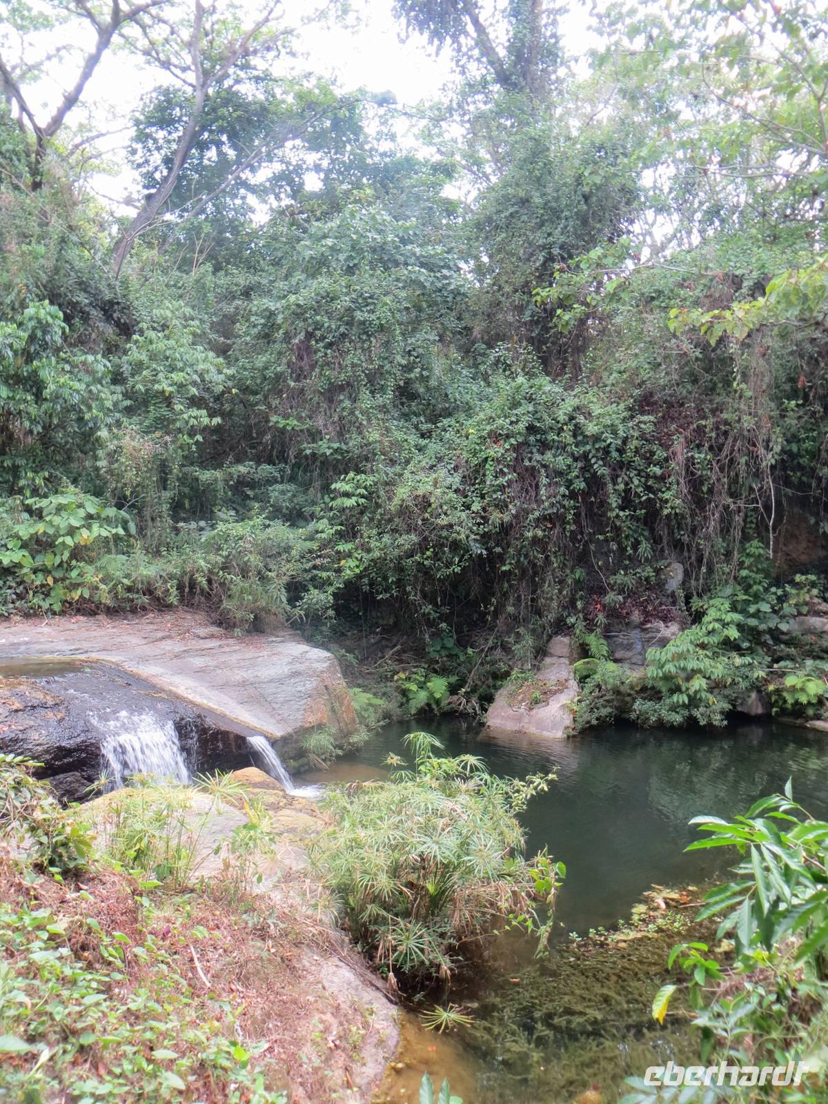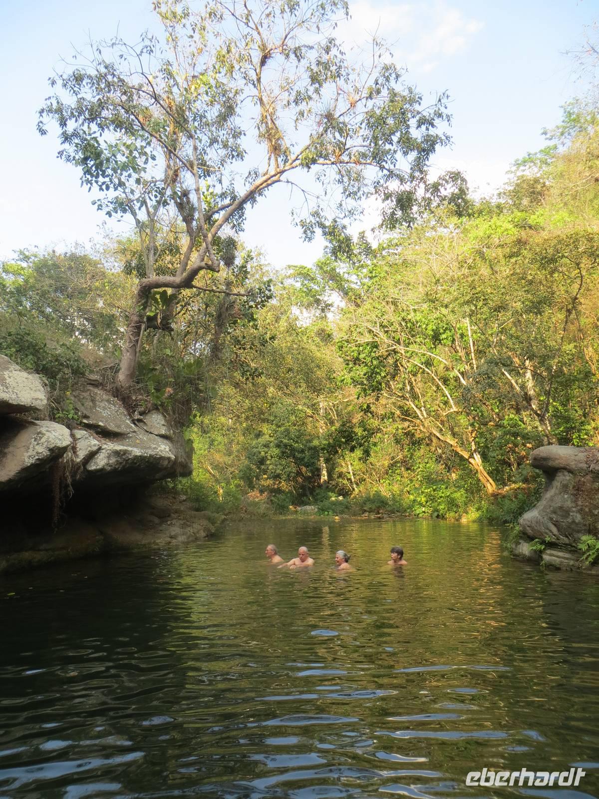 El Saltón bedeutet großes Wassergebiet oder Wasserfall. Don erzählt, dass es in der Regenzeit heftig regnet wie ein Wasserfall und es gäbe sogar einen, der in der Regenzeit 30 Meter die Tiefe stürzt und von drei natürlichen Schwimmbecken aufgefangen wird. In der Trockenzeit allerdings ist nichts von jenem Wasserfall zu sehen. Dennoch kommen wir an einem natürlichen Becken vorbei, in dem man sich die wohlverdiente Erfrischung genehmigen kann. Ein unbeschreibliches Gefühl!