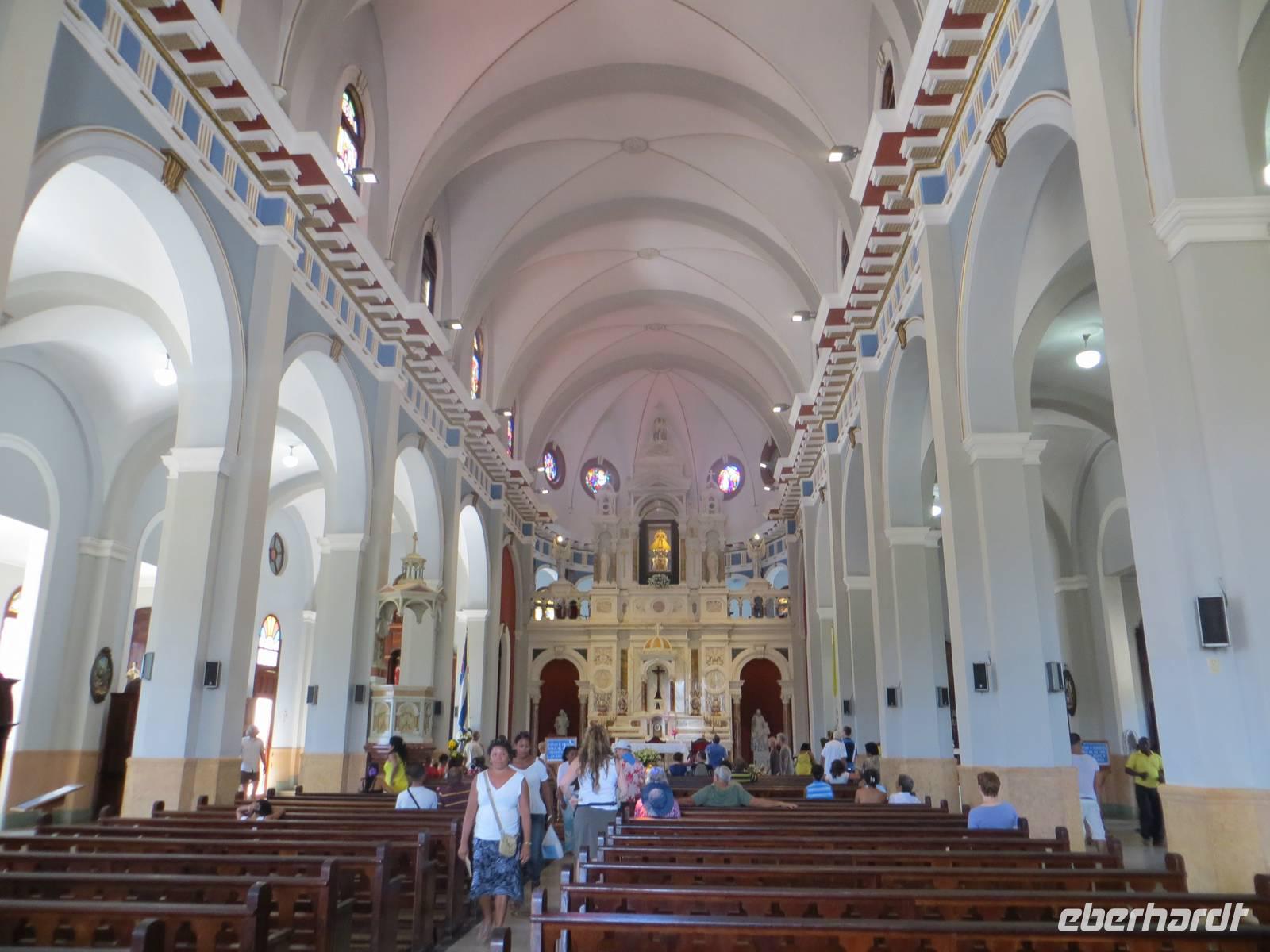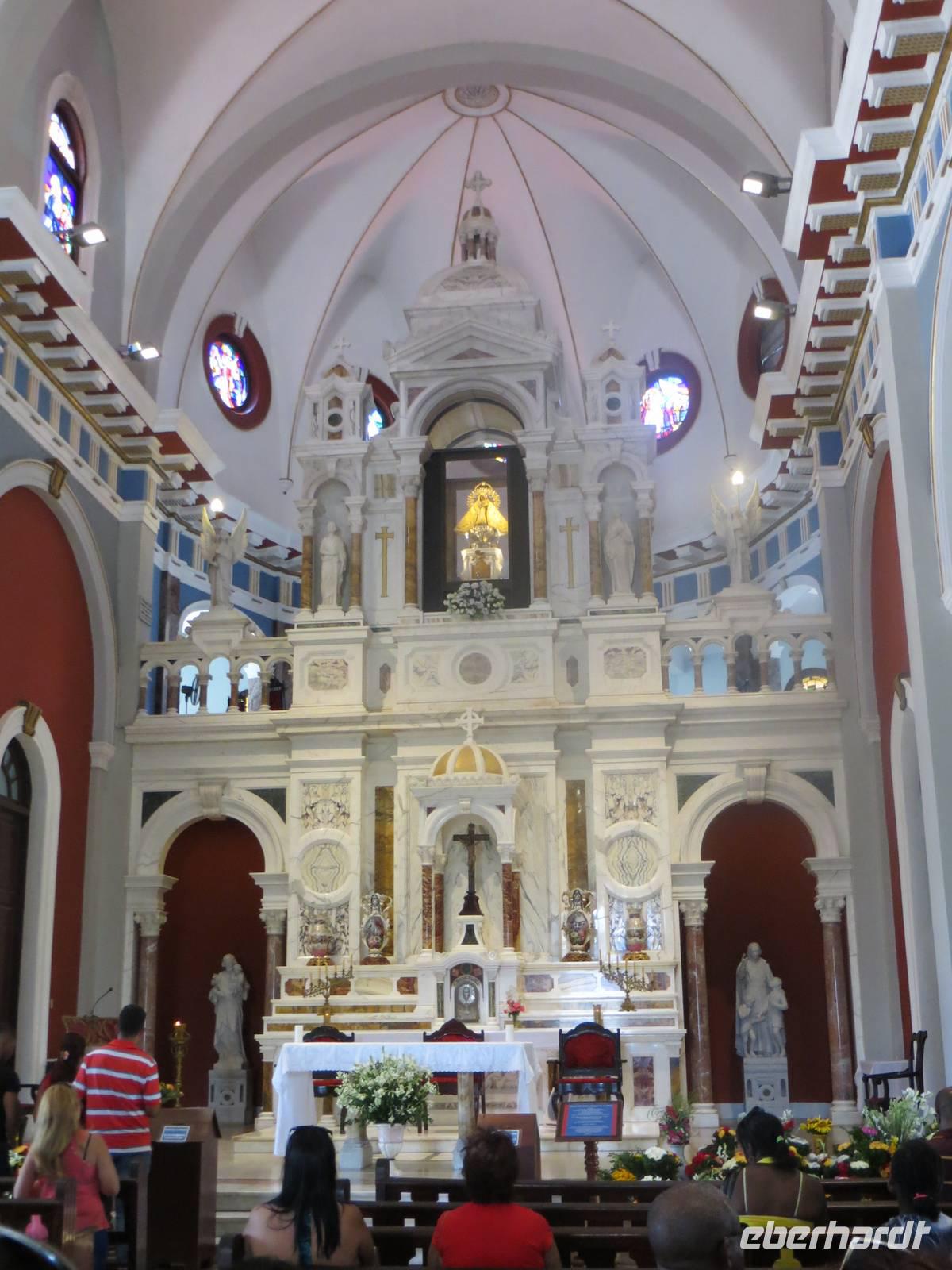 Heute wollen wir die berühmte Wallfahrtskirche El Cobre besichtigen. Im Jahre 1606 sollen hier drei Fischer von der heiligen Maria vor dem Ertrinken gerettet worden sein. Diese Fischer haben zum Dank eine Kapelle erbauen lassen. Der Name El Cobre (Das Kupfer) ist auf die nahegelegene Kupfermine zurückzuführen. Die damals hier arbeitenden Sklaven verehrten die Jungfrau von El Cobre besonders stark.