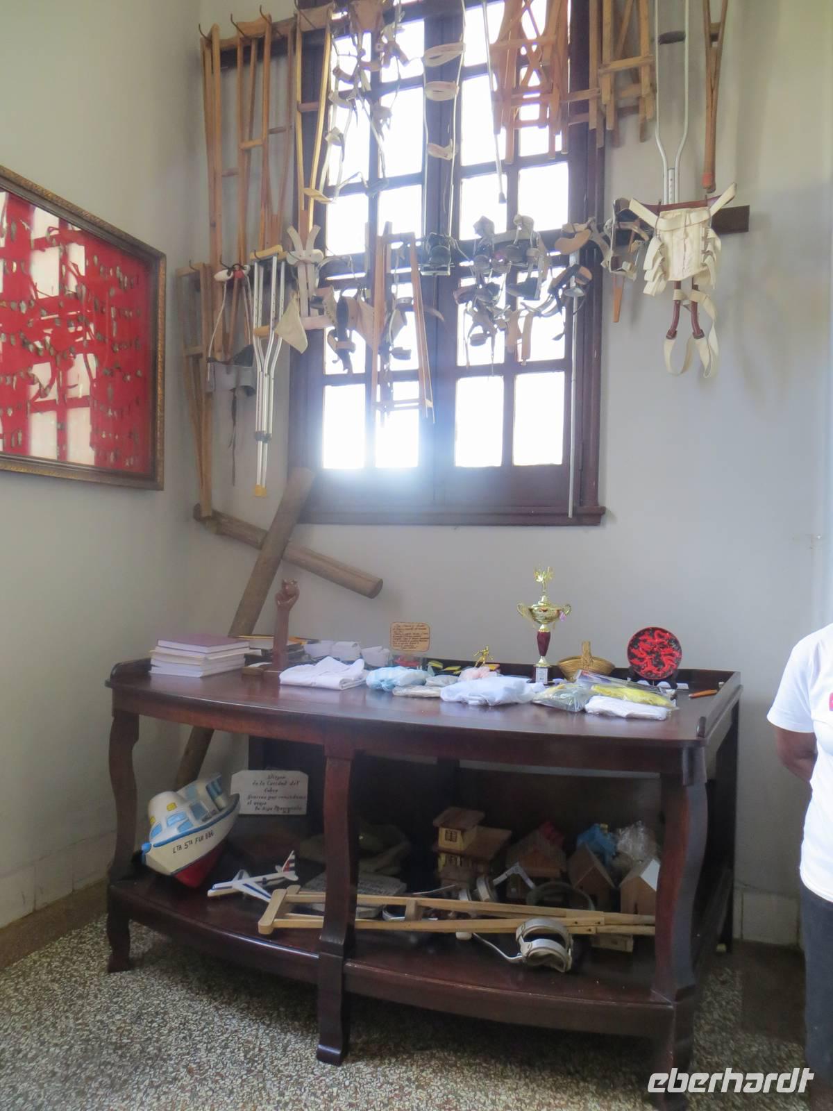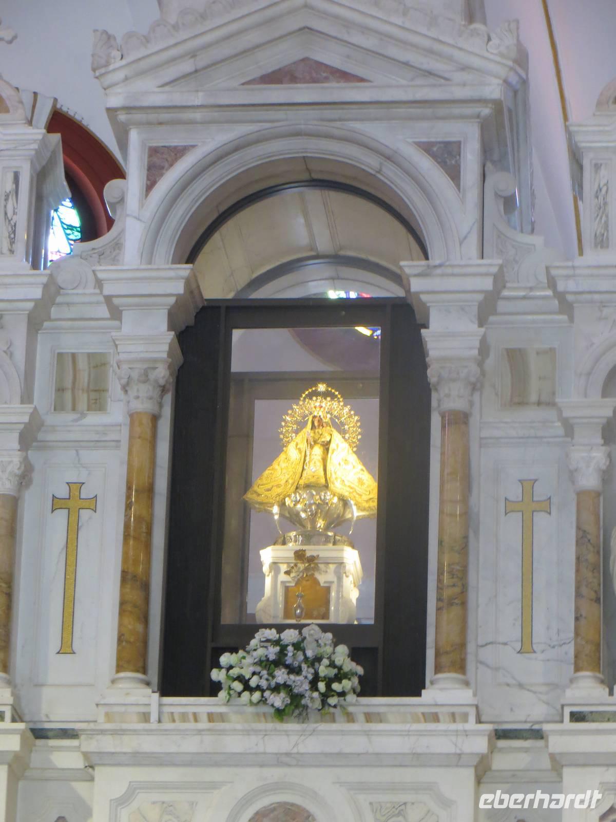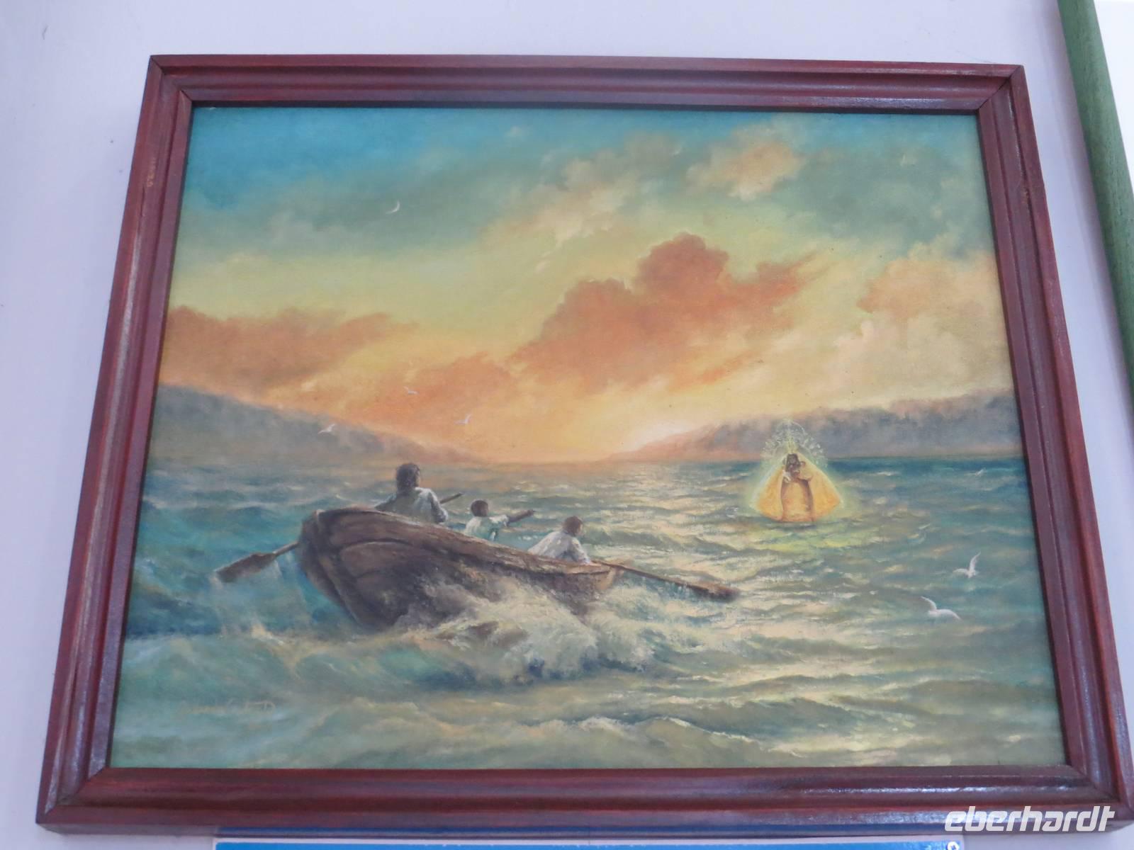 Vor uns vor den grünen Hängen der Sierra Maestra erhebt sich die schöne Kirche der Virgen de la Caridad (die Jungfrau der Hilfsbereitschaft) mit den drei gelben Türmen. Die Straßen sind voll von kubanischen Händlern, die entweder Marienstatuen oder gelbe Sonnenblumensträuße kaufen. Nach der Tradition der afrokubanischen Kultur wird jede Sonnenblumenblüte mit Honig beschmiert. Die Blumensträuße, die man auf Kuba den Heiligen bringt, verfügen immer über eine ungerade Anzahl an Blütenköpfen, wieder afrokubanischer Brauch. Schon erreichen wir den Wallfahrtsort und besichtigen die imposante Kirche. In Vitrinen häufen sich Abzeichen, Urkunden, Medaillien von Danksagenden. Auch viele berühmte Sportler, Schriftsteller oder Musiker haben hier Ihre Abzeichen verewigt. Die Gebete dieser Menschen sind in Erfüllung gegangen.
