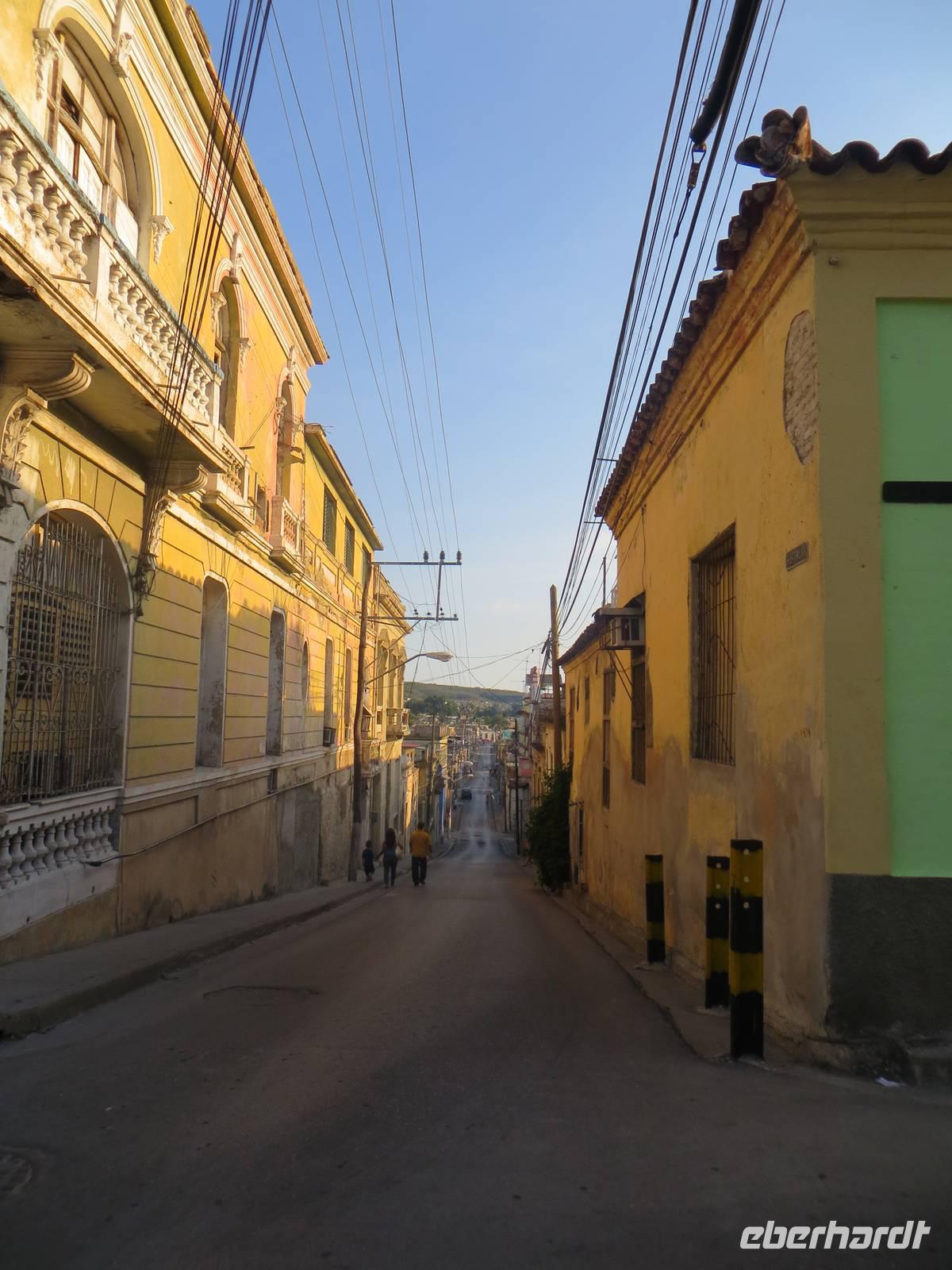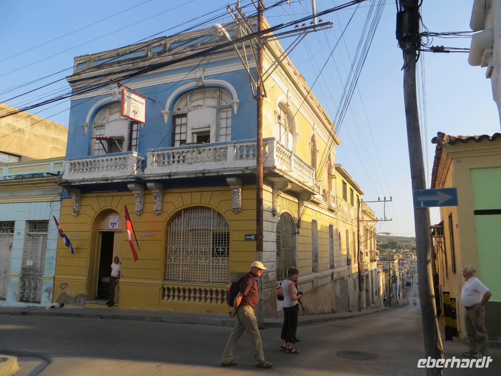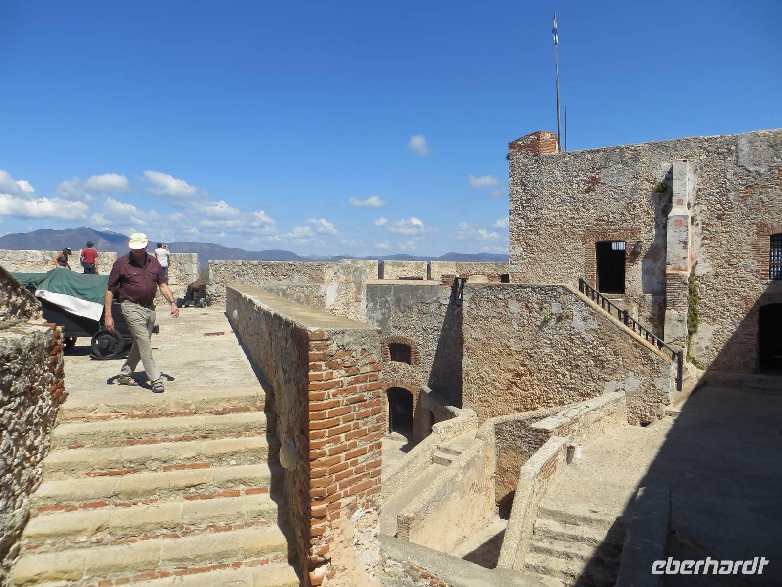 Vor dem Abendessen schlendern wir durch die Straßen und erfreuen uns an den frohen Gesichtern der kubanischen Jugend, wie sie Fußball auf dem Kirchhof spielen oder feiern, dass ihre Lieblingsmanschaft gerade ein Spiel gewonnen hat. Erstaunt sind wir aber auch über den Zustand der Häuser. An vielen laufen wir vorbei und denken, dass es fast zusammenbrechen könnte und sicher niemand drin wohnen kann. Doch dann entdecken wir aufgehangene frische Wäsche oder neugierig aus dem Fenster schauende Hausbewohner und staunen. Ein romantischer Sonnenuntergang über die Bucht von Santiago auf der Dachterrasse des Hotels und ein unwiderstehlicher Rum-Cocktail runden den ganzen herrlichenTag ab.