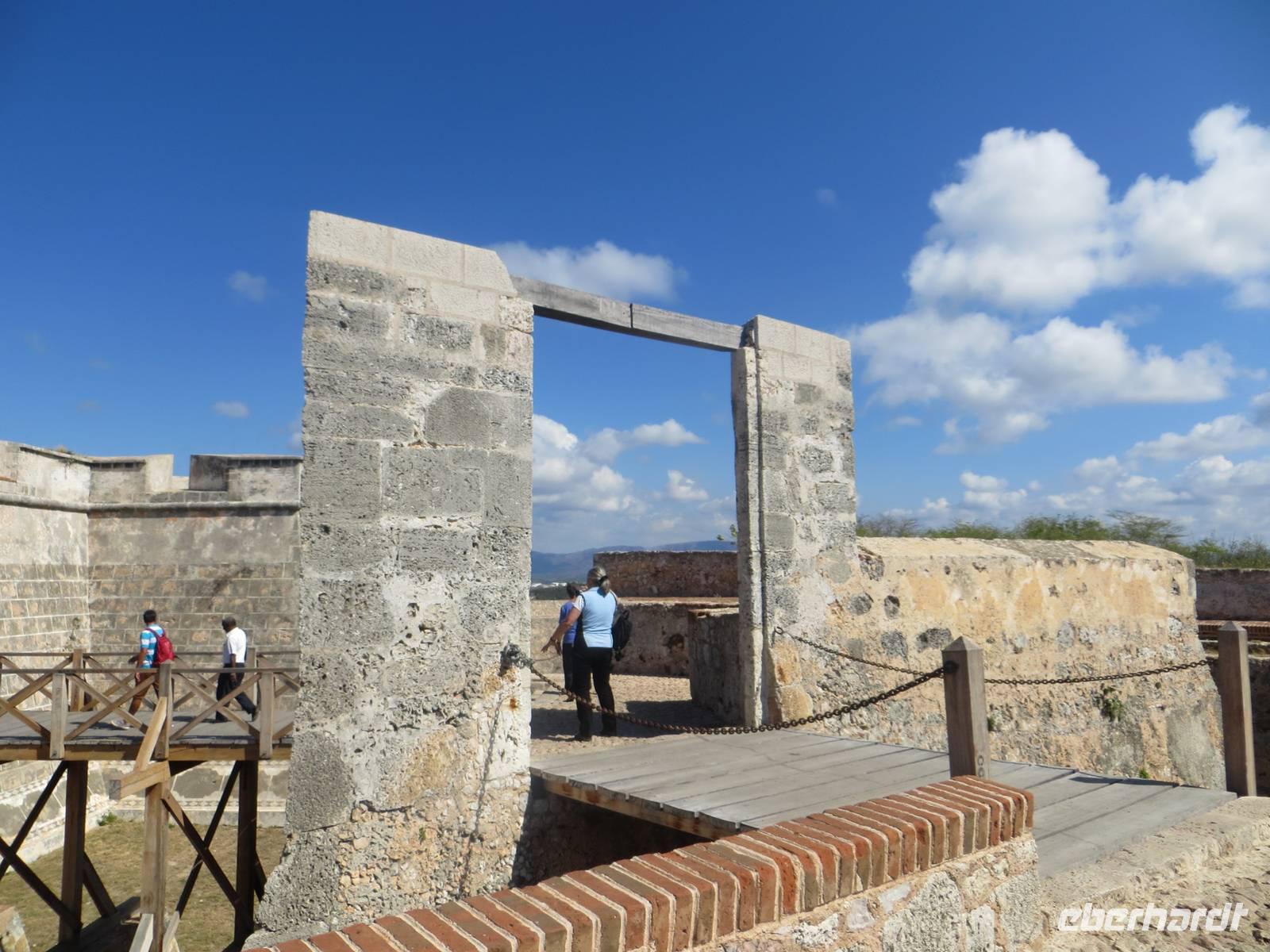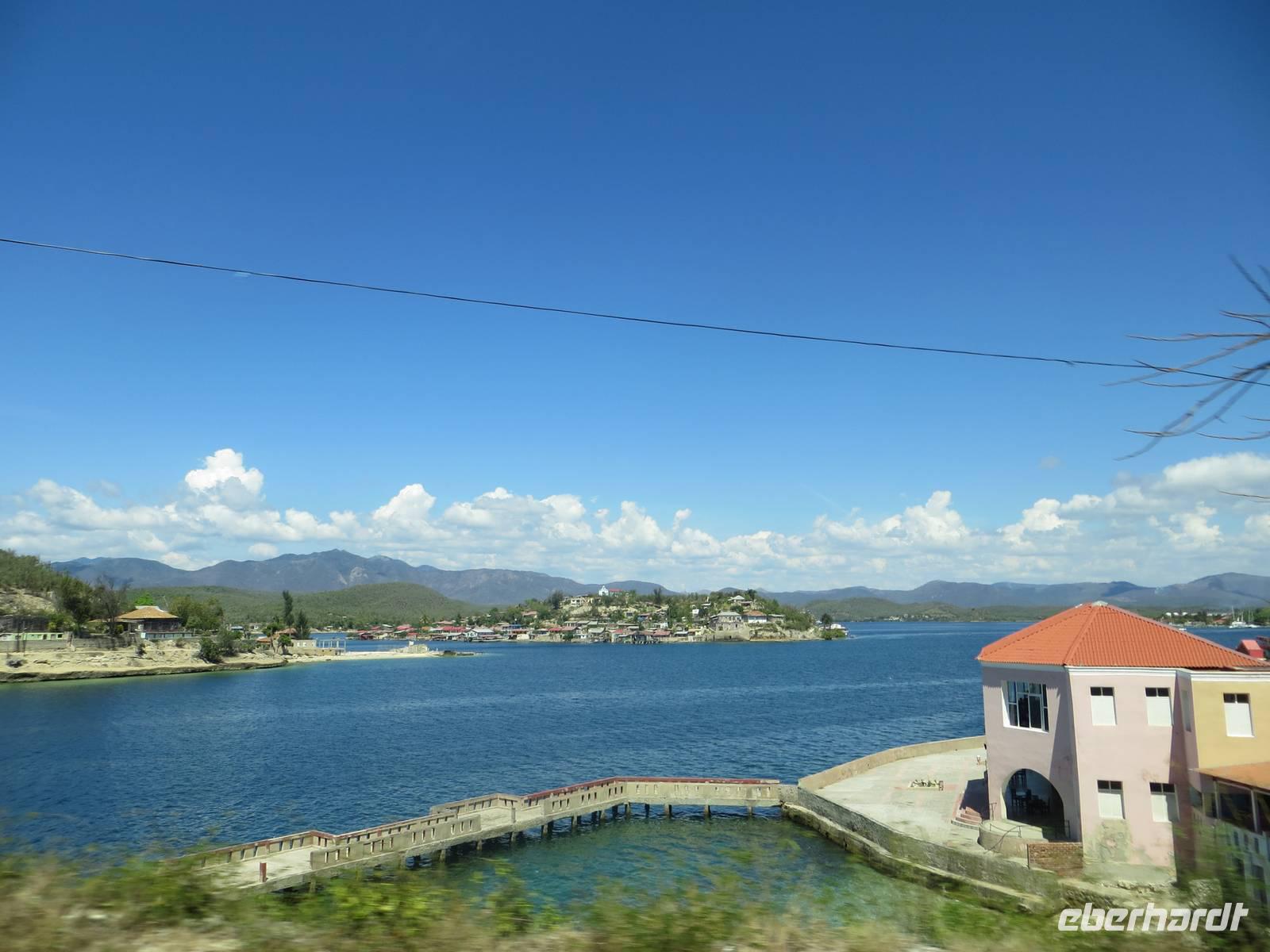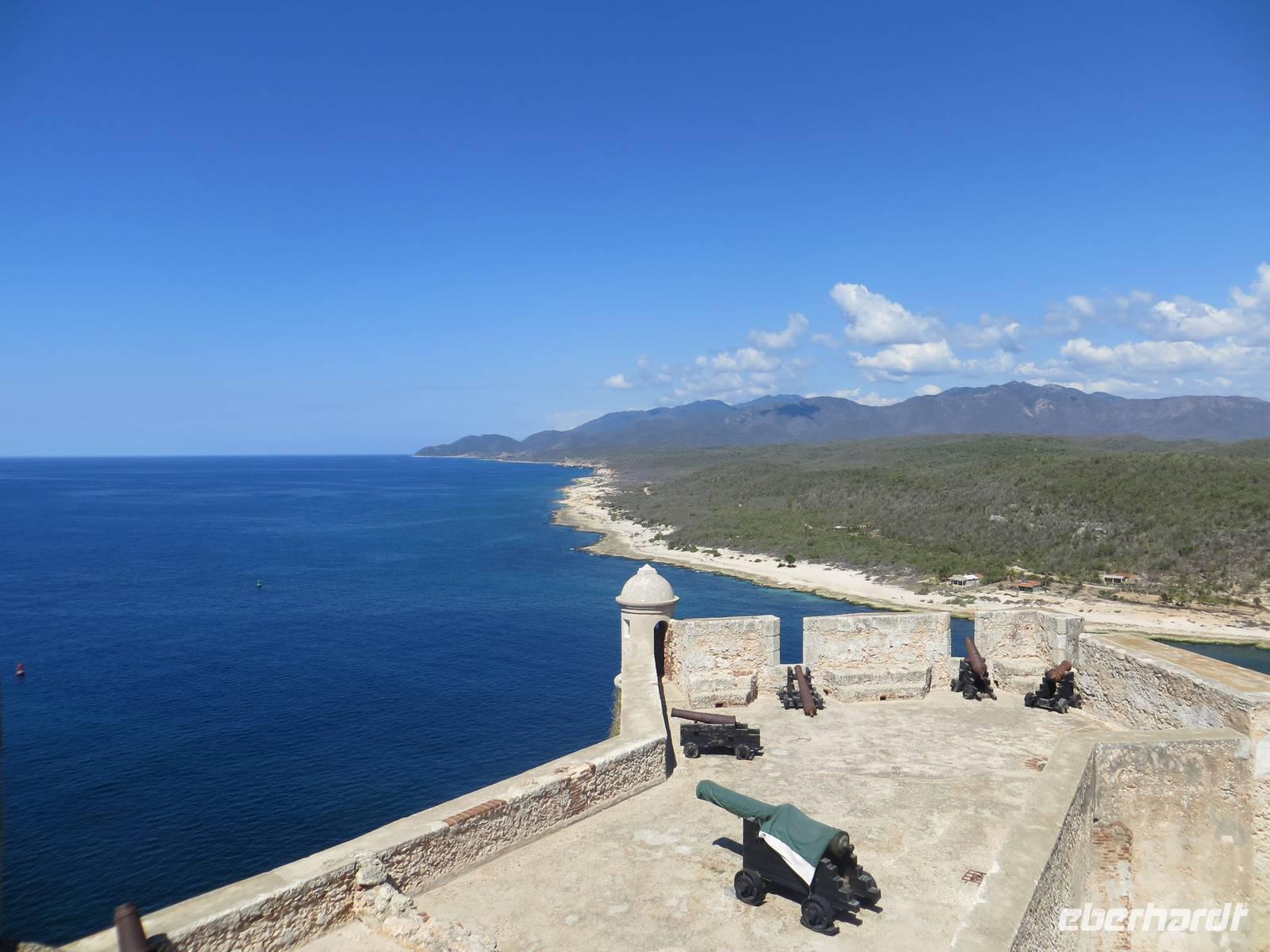 Gut gelaunt und gespannt auf die nächste Destination reisen wir weiter nach Santiago de Cuba. In Santiago de Cuba sind wir erstaunt über die hier üblichen Busse: alte Lastwagen in allen Formen und Größen und immer bis zum letzten Zentimeter vollgestopft mit Kubanern. Auch die Straßen sind extrem eng, viele Einbahnstraßen, die trotz der geringen Breite auch mit Tribünen und Mopeds zugestellt werden... Am Baseballstadion (Nationalsport Kubas) vorbei, sehen wir das Revolutionsdenkmal sowie die Moncada Kaserne. An diesem Platz fand am 26.07.1953 die erste Revolution statt. Fidel Castro hat hier an jenem Tag mit dem Überfall des zweitgrößten Amreestützpunktes des Landes, ein Zeichen zum Beginn des bewaffneten Kampfes gegen die Diktatur gegeben. Heute dient die Kaserne als Schule. Wir fahren durch die Avenida Garzon, mit den prächtigen Kololnialhäusern und passieren auch das restaurierte Haus der Bacardi Familie, welches heute ein Museum ist. Auch in der Casa de la Trova, die berühmteste in ganz Kuba, sehen und hören wir, wie der Rhythmus der Musik bereits im Blut der termperamentvollen Kubaner steckt.