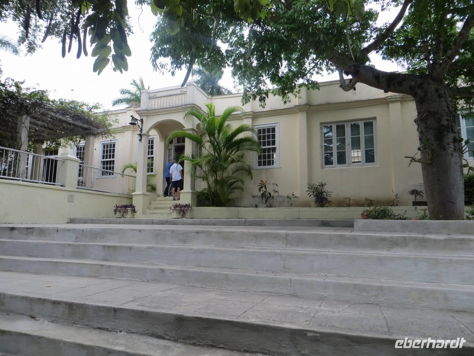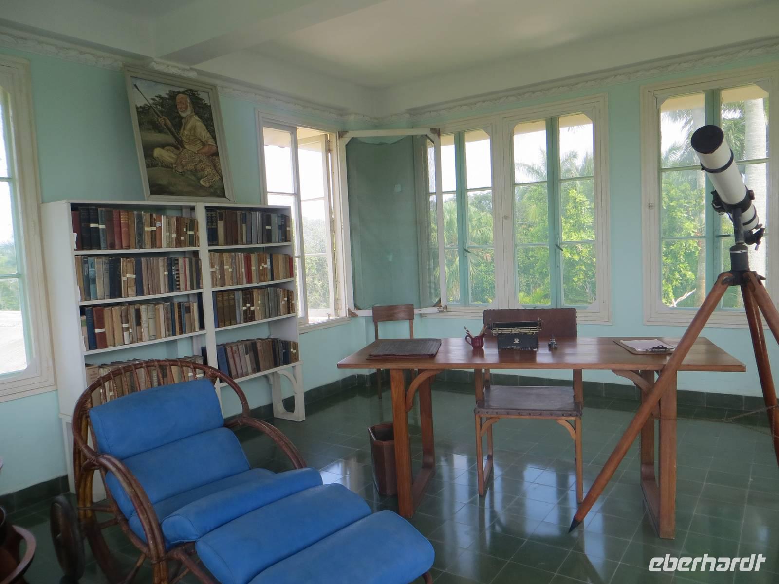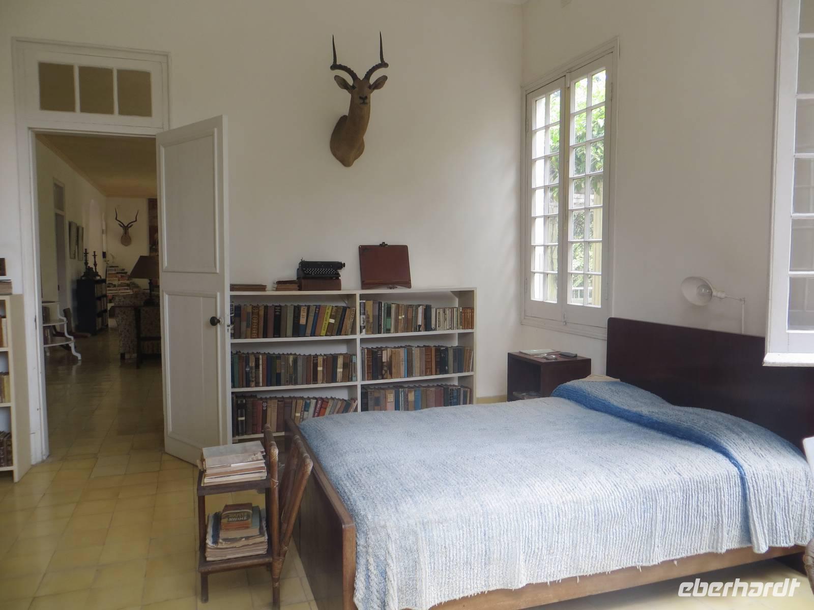 Der gesamte Nachmittag steht uns frei zur Verfügung. Auf Wunsch der Gäste organisieren Anh und Alien einen Ausflug nach San Francisco de Paula, wo das Haus vom berühmten Auto Hemmingway steht. Der Literaturnobelpreisträger verbrachte insgesamt 20 Jahre seines Lebens in Kuba. Mitte 1939 zog er von seinem Haus in Key West nach Kuba und lebte mit seiner vierten Frau Martha Gellhorn in der schönen Finca Vigia. Heute noch können wir seine Räumlichkeiten im originalen Zustand der Holzvilla sehen. Wir bewundern seine gigantischen Büchersammlung von etwa 9.000 Exemplaren, aber auch seine Jagdbeute sowie seine alte Schreibmaschine. Hier entstanden einige seiner wichtigsten Werke wie „Der alte Mann und das Meer", für die er den Nobelpreis ausgezeichnet wurde. In der riesigen Gartenanlage finden wir sein Boot und einige Grabsteine seiner ca. 60 Hunde und Katzen.