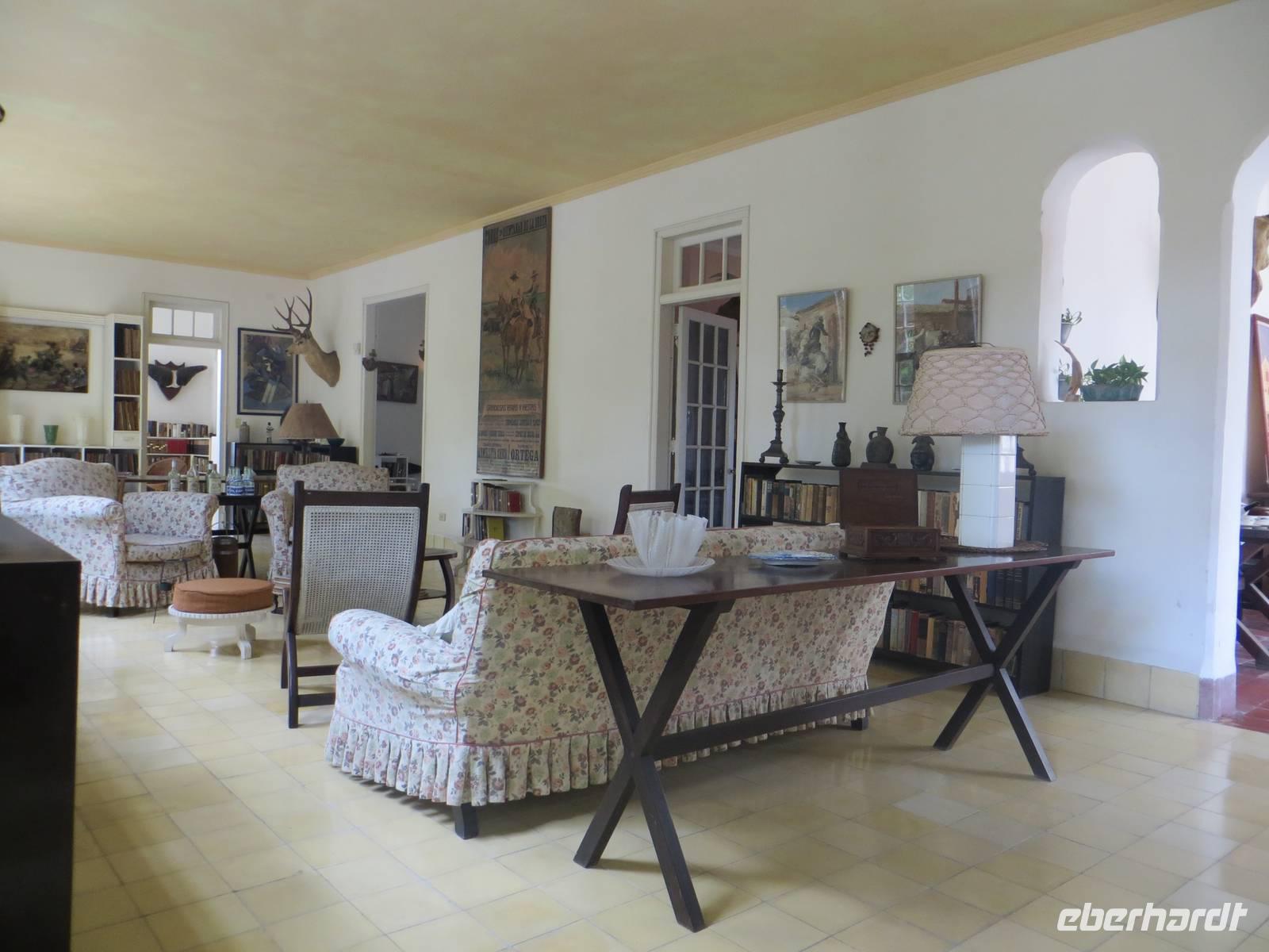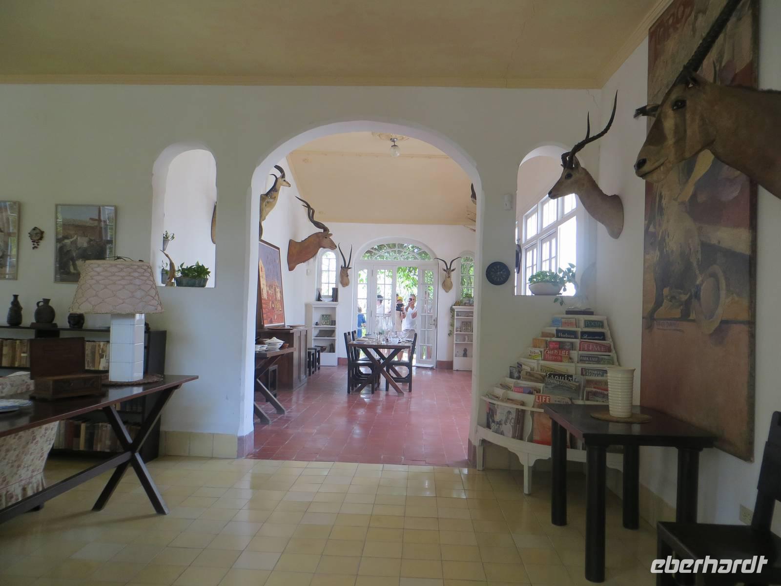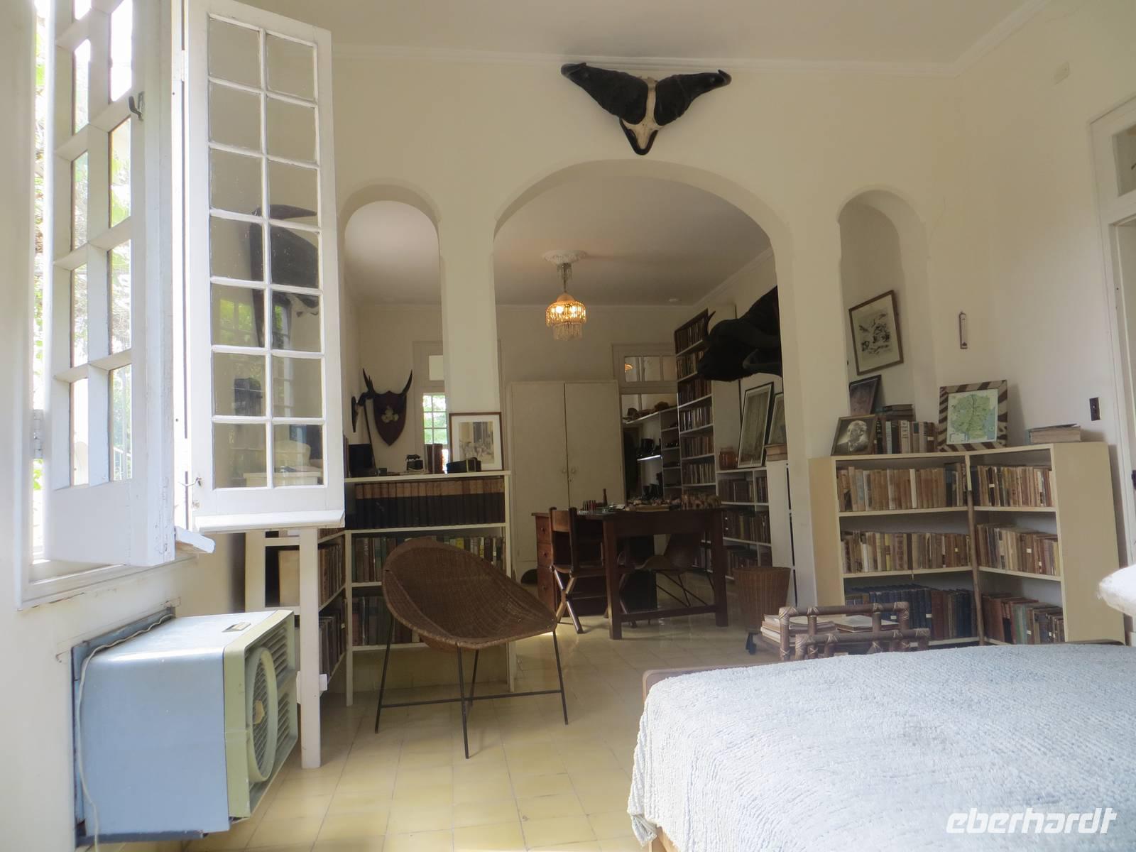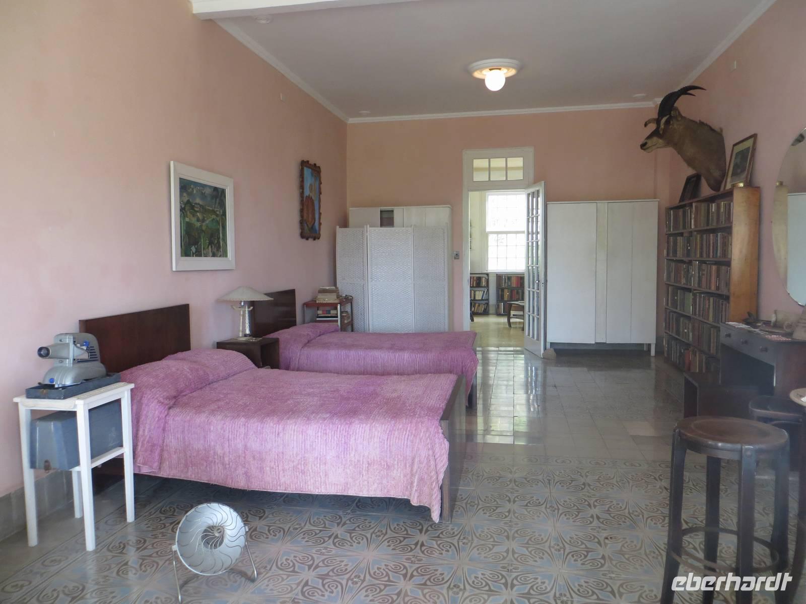 Der gesamte Nachmittag steht uns frei zur Verfügung. Auf Wunsch der Gäste organisieren Anh und Alien einen Ausflug nach San Francisco de Paula, wo das Haus vom berühmten Auto Hemmingway steht. Der Literaturnobelpreisträger verbrachte insgesamt 20 Jahre seines Lebens in Kuba. Mitte 1939 zog er von seinem Haus in Key West nach Kuba und lebte mit seiner vierten Frau Martha Gellhorn in der schönen Finca Vigia. Heute noch können wir seine Räumlichkeiten im originalen Zustand der Holzvilla sehen. Wir bewundern seine gigantischen Büchersammlung von etwa 9.000 Exemplaren, aber auch seine Jagdbeute sowie seine alte Schreibmaschine. Hier entstanden einige seiner wichtigsten Werke wie „Der alte Mann und das Meer", für die er den Nobelpreis ausgezeichnet wurde. In der riesigen Gartenanlage finden wir sein Boot und einige Grabsteine seiner ca. 60 Hunde und Katzen.