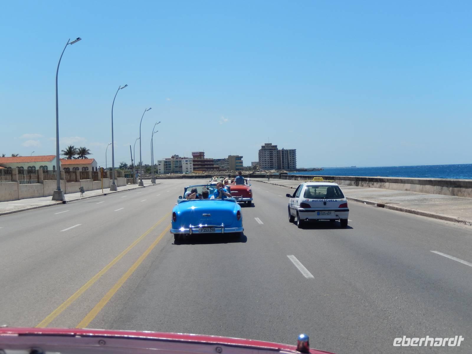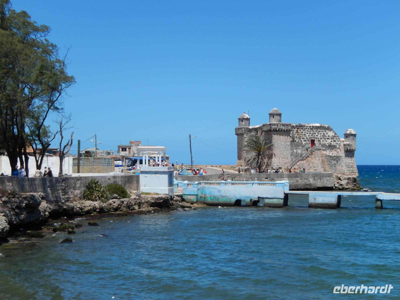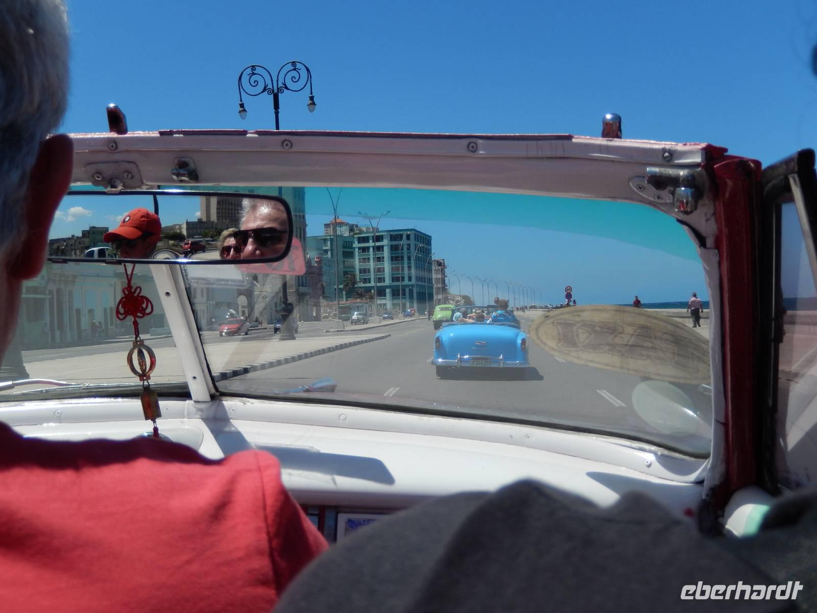 gelebt und gearbeitet hat. Im Garten befindet sich ein schöner Swimmingpool der leider leer war, die Gräber seiner vier Hunde und seine Yacht, die "El Pilar". Nach dem Rundgang gönnen sich die meisten Gäste noch einen leckeren Cocktail mit dazugehöriger Zuckerrohrstange oder einen Zuckerrohrsaft. Dann fahren wir zum Fischerdorf Cojímar, wo seinerzeit Hemingways Schiff lag. Zum Mittagessen im Restaurant "La Terraza", in dem auch Hemingway Stammgast war und welches zusammen mit der angrenzenden Bucht ihn zu dem Buch „Der alte Mann und das Meer" inspiriert hat werden wir mit einem blauen Begrüßungscocktail empfangen. Nach dem Essen zu Klängen kubanischer Musik schauen wir uns Denkmal und Festung zu Ehren Hemingways an. Nach der Rückfahrt nach Havanna steht unser Sinn nach Spannung und Abenteuer. Im Stadtcentrum besteigen wir vier coole Oldtimer und ließen uns durch Havanna und entlang der Uferstraße Malecon zum Hotel chauffieren.
