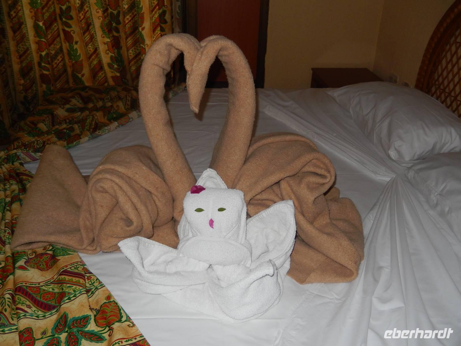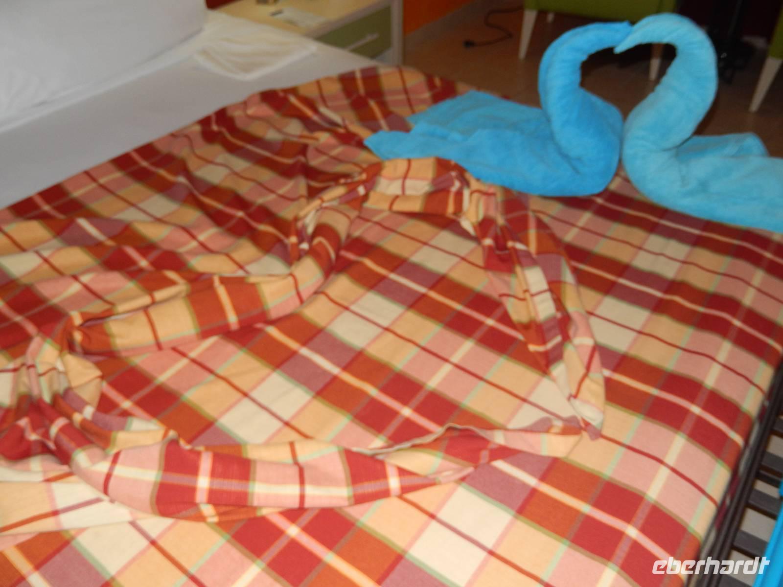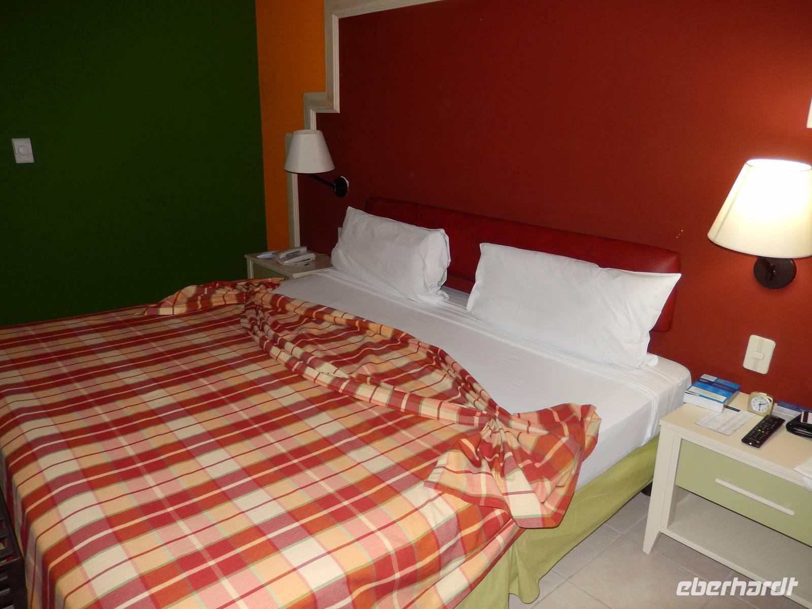 Die Zeit bis dahin nutzen wir zum Entspannen, einem ersten Bad im blauen Meer oder besichtigen die Hotelanlage. Als wir abends das Buffet-Restaurant betreten, sind wir zugleich begeistert und fassungslos von der Vielfalt und Angebot an Speisen. Einige Gäste eschrecken sich vielleicht auch vor der Dame, welche auf dem Süßspeisen-Buffet komplett mit Schokolade überzogen sitzt, wirklich eher kurios und befremdlich statt schön anzusehen. Nach dem leckersten Essen trinken einige leckere Cocktails an einer der vielen Bars der Anlage.