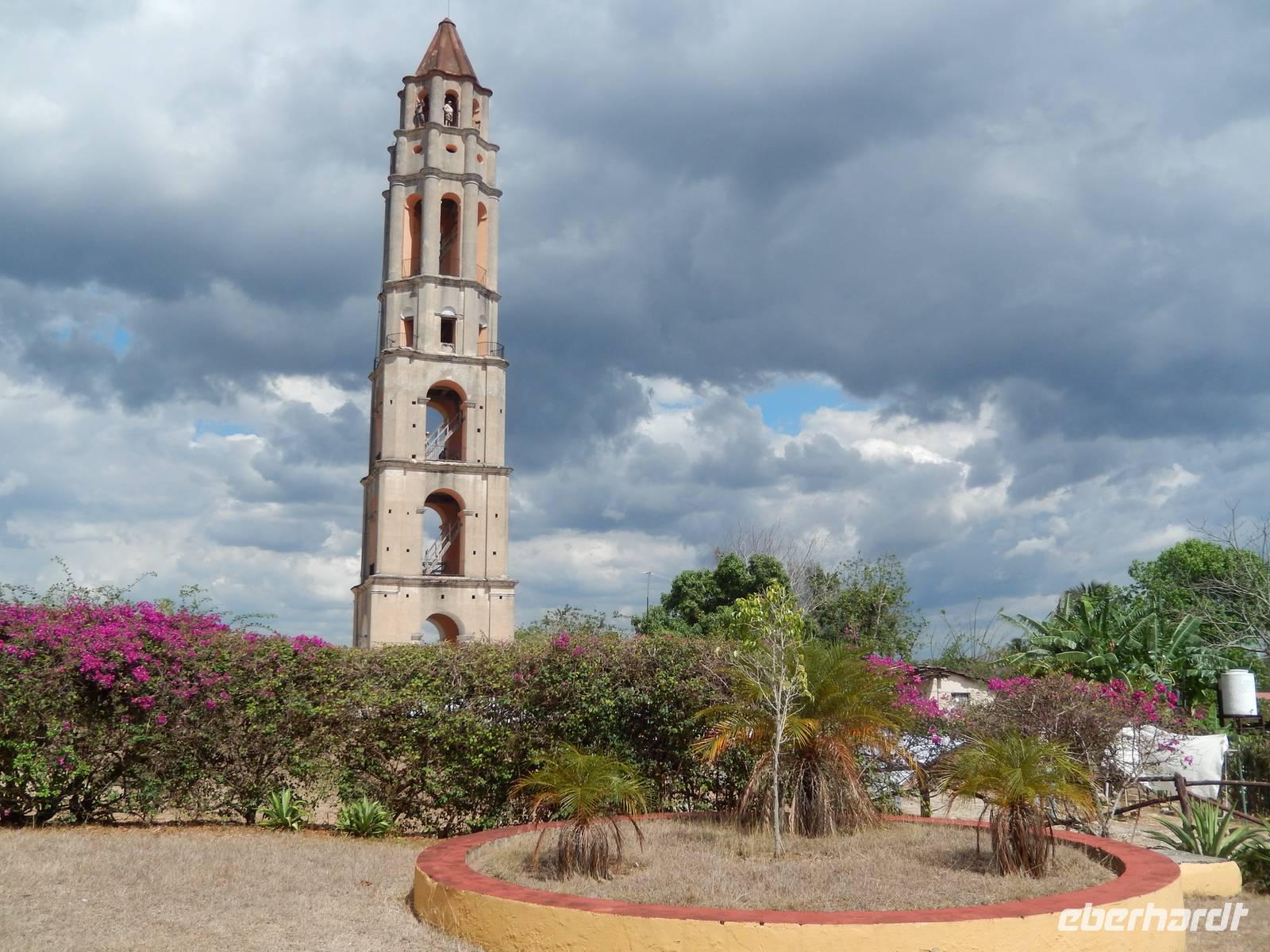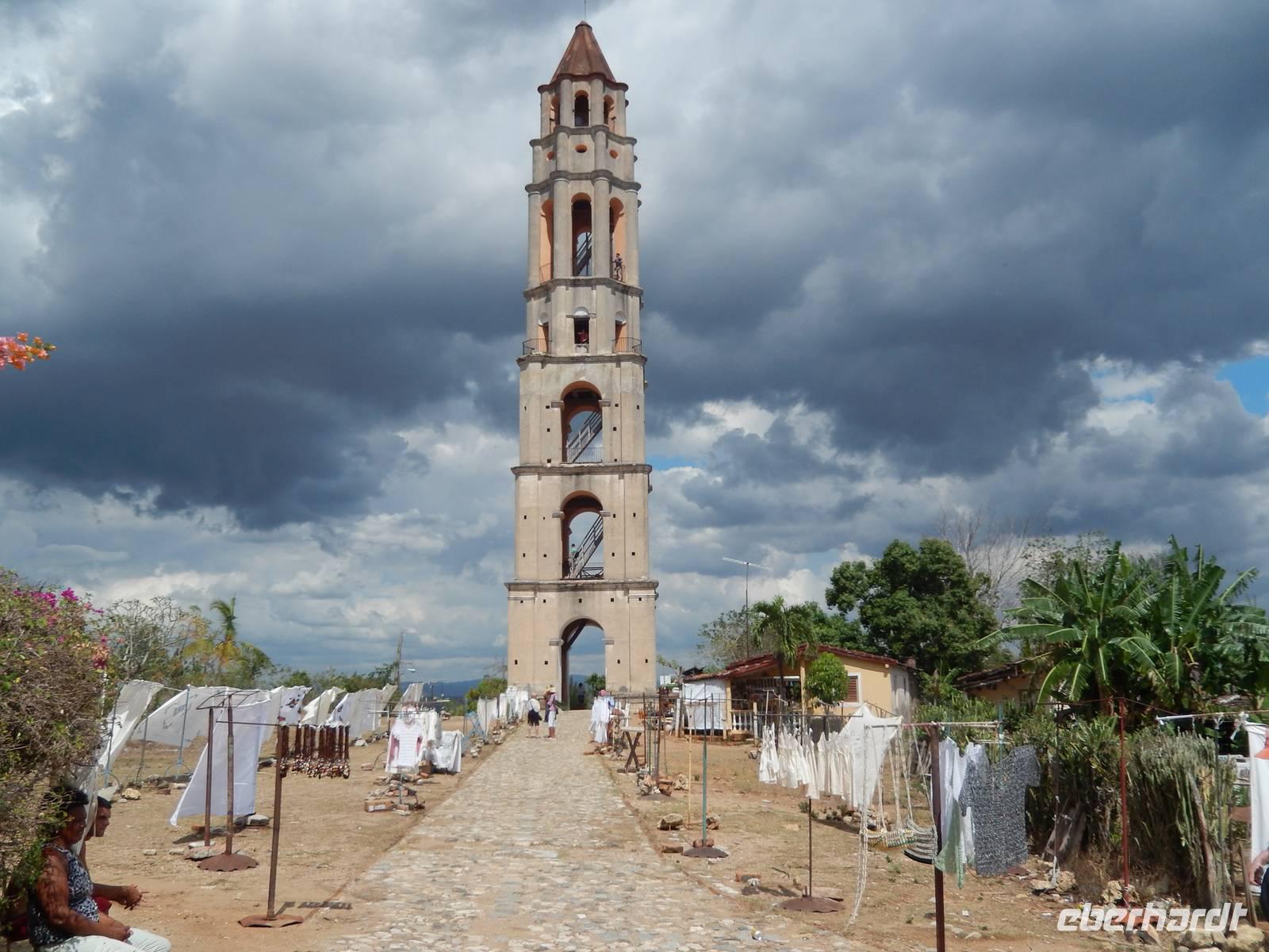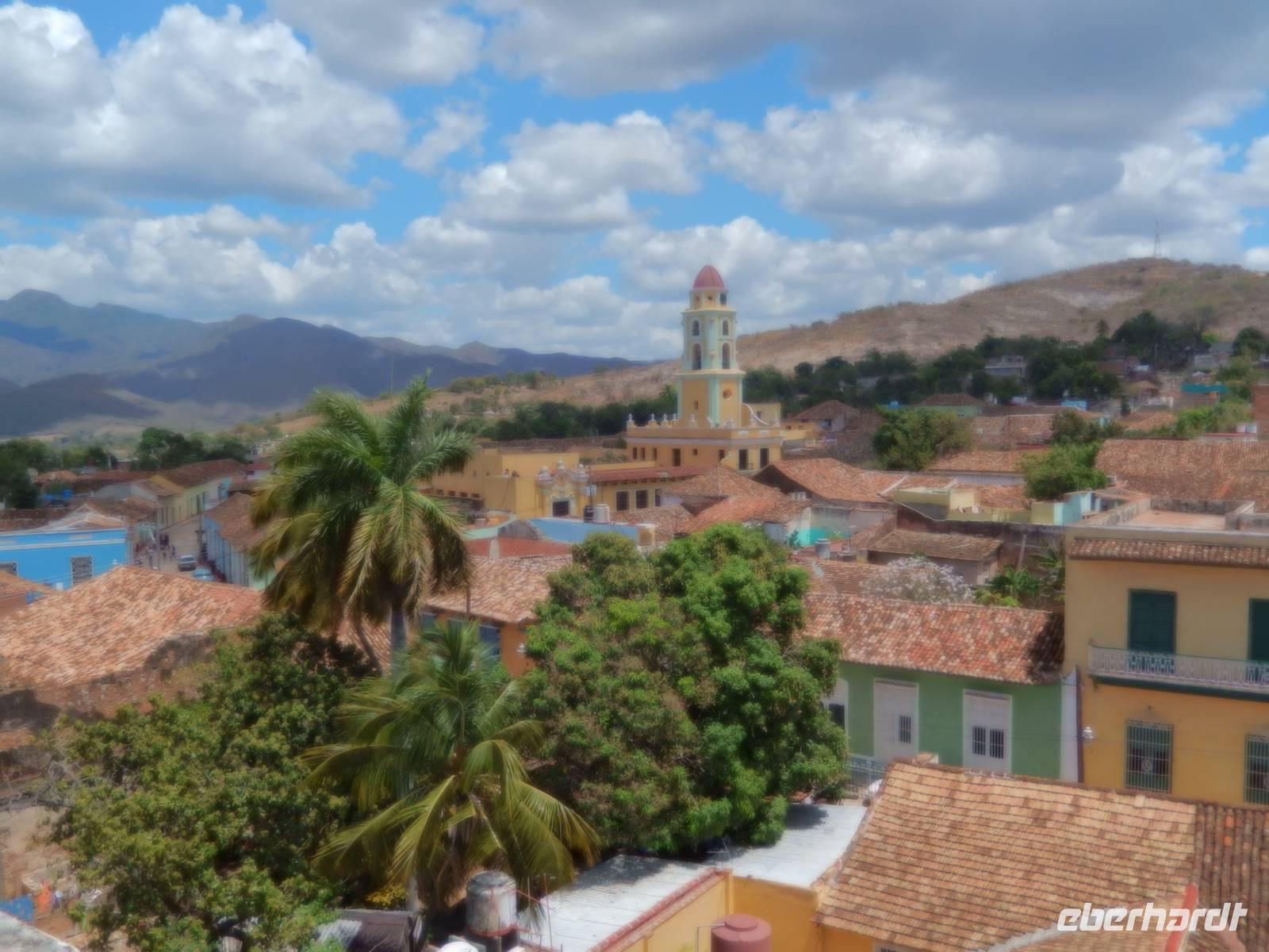 Wir beginnen gleich mit unserem Stadtrundgang durch alle wichtigen Straßen und Plätze. Unsere Führung endet in der Bar "La Canchánchara", wo wir auch den typischen Cocktail "Canchánchara" probieren, welches das traditionelle Getränk der "Mambises" ist, der kubanischen Kämpfer der Befreiungsarmee im 19. Jahrhundert. Dieser Cocktail setzt sich aus Honig, Zitrone, Schnaps, Eis und Mineralwasser zusammen. Danach laufen wir auch schon zum Mittagessen ins Restaurant "El Mesón del Regidor". Es stehen Fisch, Hühnchen oder Rindfleisch zur Auswahl. Das Essen ist abermals sehr lecker und es gibt auch gute musikalische Unterhaltung. Nach dem Essen haben wir Freizeit unter anderem für den Einkauf von Souvenirs oder die Besichtigung der Kirche Iglesia Parroquial Mayor de la Santísima Trinidad, also die Kirche der Heiligen Dreifaltigkeit. Einige Reisegäste genießen auch einen tollen Blick über die ganze Stadt vom Turm des Palacio de Cantaro, ein alter Palast eines Zuckerrohrbarons. Dann fahren wir weiter zur ehemaligen Hacienda Manaca Iznaga. Das Tal der Zuckermühlen "Valle de los Ingenios" östlich von Trinidad wurde ebenfalls 1988 zum UNESCO-Weltkulturerbe erklärt. Im Zentrum des Tales befindet sich der bekannte siebenstöckige Sklaventurm Torre de Iznaga, erbaut 1816 von der Familie Iznaga, um die Sklaven bei ihrer Arbeit auf den Zuckerrohrfeldern zu beaufsichtigen. Am frühen Nachmittag erreichen wir die Hacienda Manaca Iznaga mit dem 45 Meter hohen Iznaga-Turm. Um deren Turmspitze in Glockenform zu erreichen, sind 137 Stufen zu erklimmen. Außerdem befindet sich hier ein kleiner Touristenmarkt an dessen Souvenirständen wir entlang bummelten.