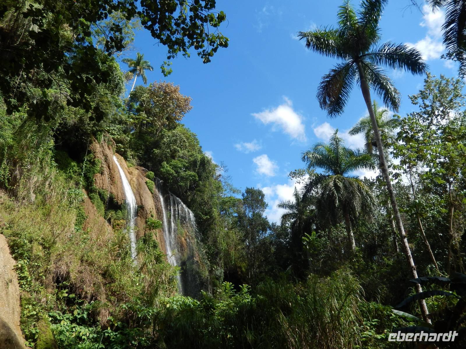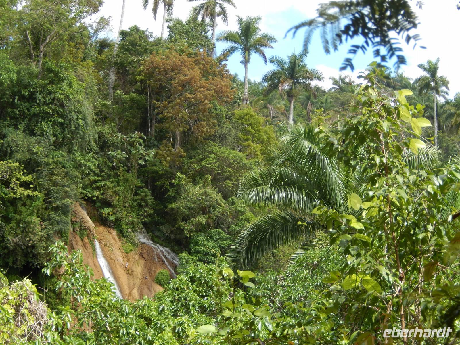 Zusammen mit Iran und unserer Wanderführerin Mercedes fahren wir im im russischen LKW zum Park Guanayara. Die Wanderung beginnt an einer Kaffeeplantage, wo wir einiges zu Anbau und Verarbeitung des Kaffees erfahren. Mit vielen weiteren Erklärungen zur Natur sowie verschiedenen Pflanzen und Bäumen wie afrikanischer Tulpenbaum "Spathodea campanulata", Obstbanane, Yucca Palme und Mamey sapote wandern wir weiter zum Wasserfall. Am rund 30 Meter hohen Wasserfall "El Rocio" legen wir eien Fotostopp ein und kosten einen leckeren Kolibri-Cocktail an der provisorischen Bar. Leider traut sich keiner ins erfrischende Wasser des Wasserfalls zu hüpfen. Nachdem wir ungefähr 1 Stunde durch die herrliche Natur gewandert sind erreichen wir das Restaurant "La Gellega", wo wir unser Mittagessen zu uns nehmen. Empfangen werden wir natürlich mit einem leckeren Begrüßungscocktail. Als Hauptgericht gibt es lecker gebratenes Huhn zur Auswahl mit verschiedenen Beilagen Am frühen Nachmittag fahren wir wieder zum Hotel zurück.
