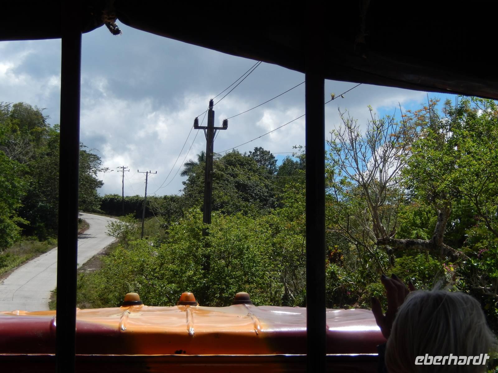 Im Anschluss fahren wir zum 3-Sterne-Hotel "Los Helechos" in Topes de Collantes. An der Weggabelung zum Escambray-Gebirge stiegen wir samt Koffern in einen LKW um, der uns die steilen und gewundenen Straßen leichter nach oben bringen sollte als unser leider altersschwache Bus. Ein abenteuerliches Erlebnis.