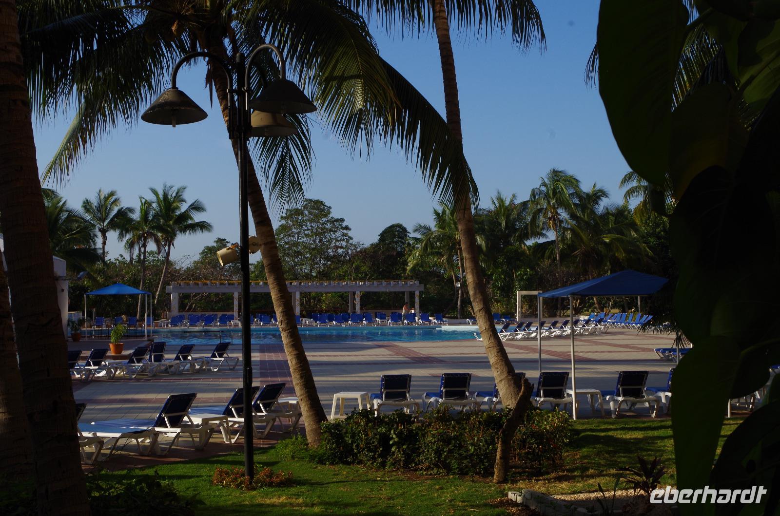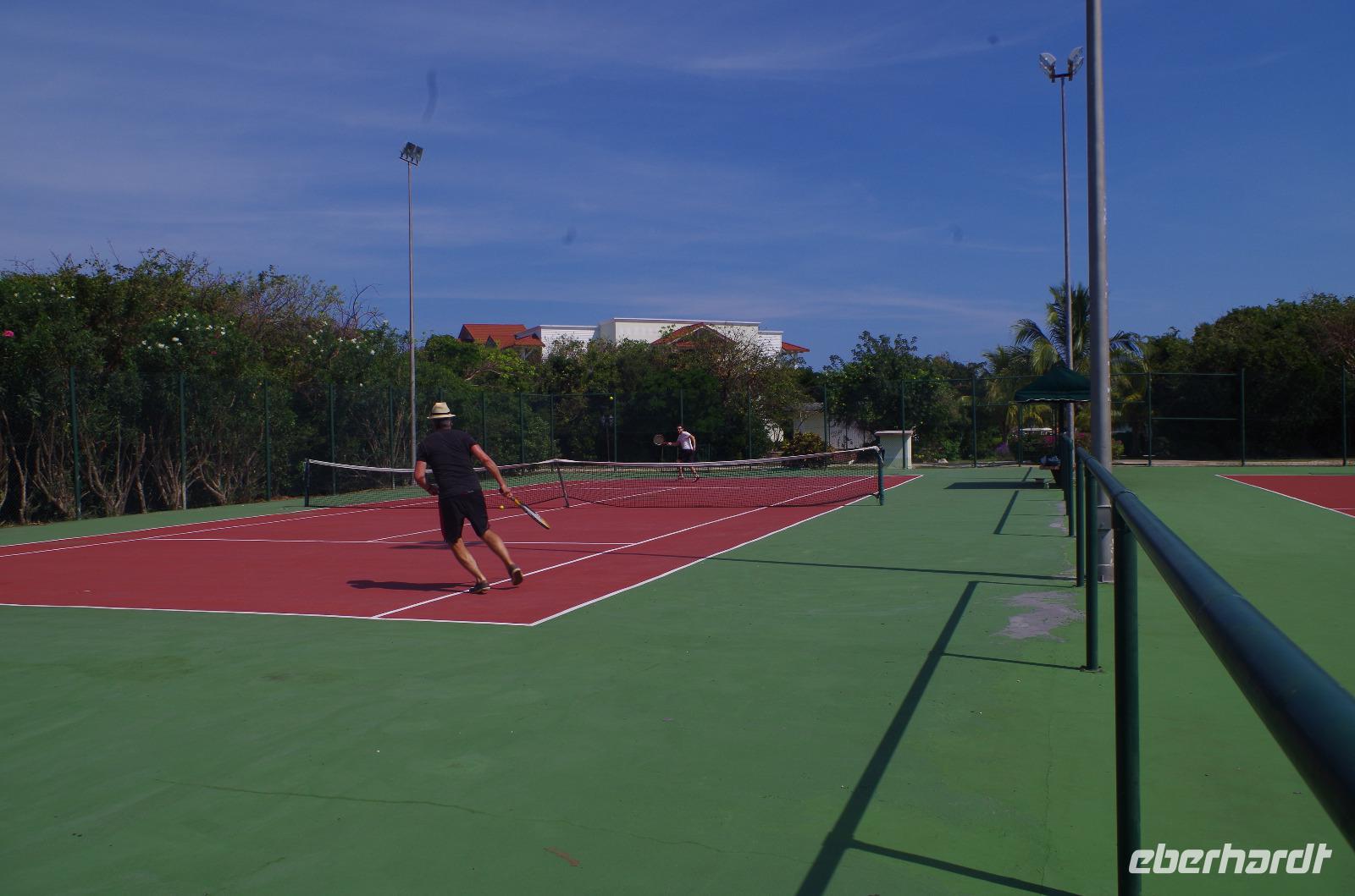 Da wir heute den Tennisplatz nutzen wollten, fragte ich gestern schon nach einer Reservierung. Vormerkungen gab es nicht und man sollte einfach am Pool Haus gegen 9 Uhr vorbeigehen und falls da jemand ist, könnte man das Equipment ausleihen. Da ich aus meinem spanischen Aufenthalt gelernt habe, dass um 9 Uhr nie 9 Uhr bedeutet, trafen wir uns 9:30 Uhr am Pool. Überraschenderweise war niemand anzutreffen. Die Reinigungskraft gab uns zu verstehen, dass vor um 10 Uhr sicher niemand kommen würde und sie uns auch nicht die Schläger und die Bälle raus geben kann. Im Endeffekt standen wir dann gegen 11 Uhr auf dem Platz und unsere schlaue Idee, frühzeitig spielen zu gehen, um der Mittagssonne aus dem Weg zu gehen, war dahin. Nun hieß es am Nachmittag den letzten Badetag genießen ehe es morgen früh zurück nach Havanna gehen sollte.
