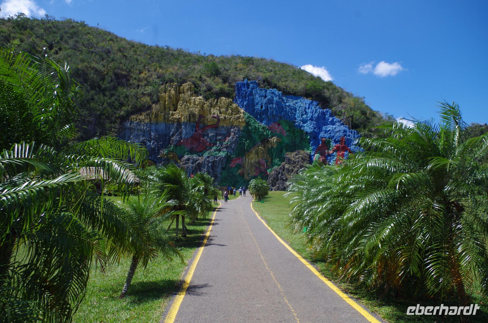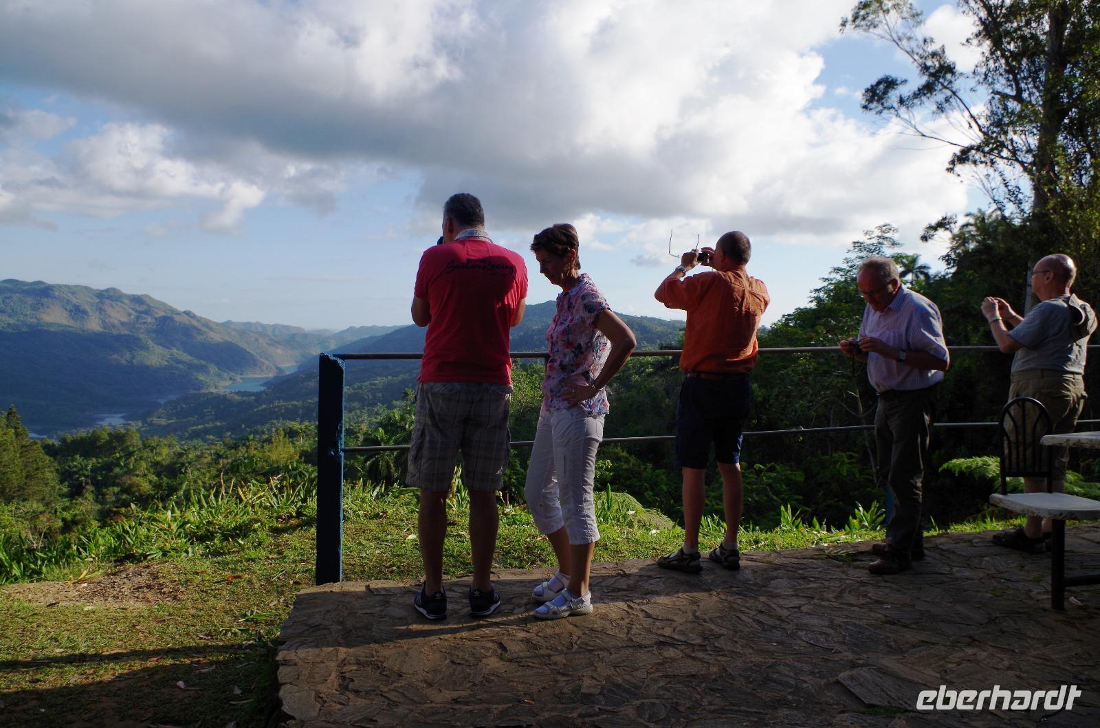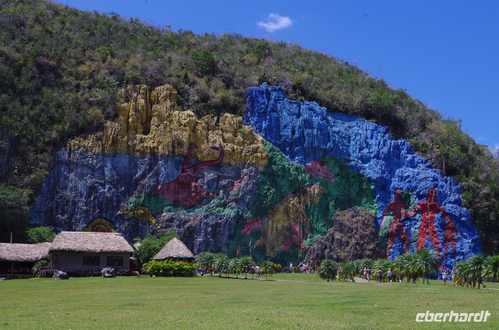 Das Mittagessen wurde heute im Freien serviert. Es gab als Vorspeise frisches Obst, Tomaten und Gurke mit Brot. Als Hauptspeise bekamen wir Reis mit Huhn und als Dessert etwas spezielles aus der Region: Käse mit Marmelade von der Guave. Da die Region nicht nur bekannt für ihre landschaftliche Schönheit ist, sondern auch für ihren Tabak, machten wir einen Stopp bei der Casa Veguero. Hier lernten wir etwas über die Herstellung des Tabaks und der Großteil der Gäste zog anschließend von der „Gemeinschafts-Zigarre". Auch das Gelände um die Tabakfarm war mit Höhepunkten gespickt und Antonio zeigte uns Sachen, wo wir Europäer vermutlich vorbeigelaufen wären. Ich hätte zumindest einen Großteil der Pflanzen nicht erkannt. Der vorletzte Stopp war heute die „Mural de la Prehistoria", welches eine riesige bemalte Wandmalerei ist. Sie zeigt die Evolution der Menschheit. Nachdem wir auch diese Sehenswürdigkeit gesehen hatten, machten wir einen letzten Stopp am Aussichtspunkt „Los Jazmines". Hier hatten wir einen tollen Panoramablick über die Stadt und die kubanische Band neben uns war nicht nur was für die Ohren. Am Abend ging es dann für die, die wollten, zum Buena Vista Abend.