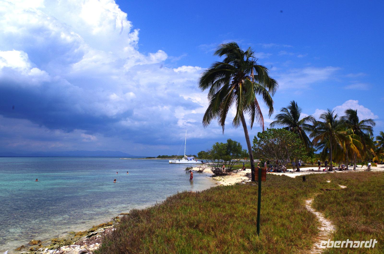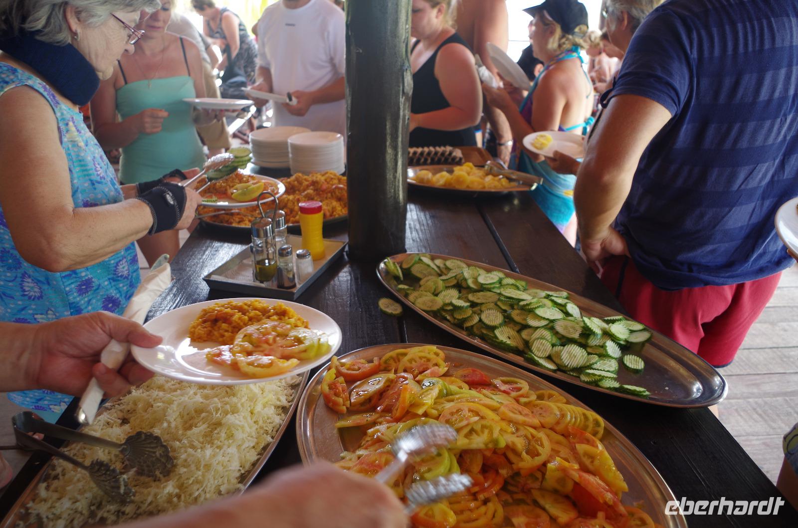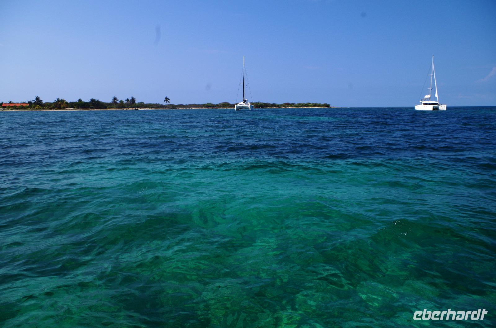 Hier bestiegen wir einen Katamaran, welcher uns in etwas mehr als einer Stunde auf die Insel Cayo Blanco brachte. Die Gäste, die nicht mit schnorcheln wollten, stiegen hier aus und der Rest fuhr mit dem Boot einmal um die Insel herum und erforschte hier die Unterwasserwelt. Nach 45 Minuten intensiver Expedition ging es zurück auf die Hauptinsel, wo uns Paella und Salat gereicht wurde. Anschließend hatten wir noch etwas Zeit, die Insel zu erkunden oder uns an dem schönen Strand niederzulassen und das Farbspektakel im Meer zu beobachten.