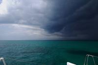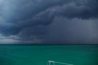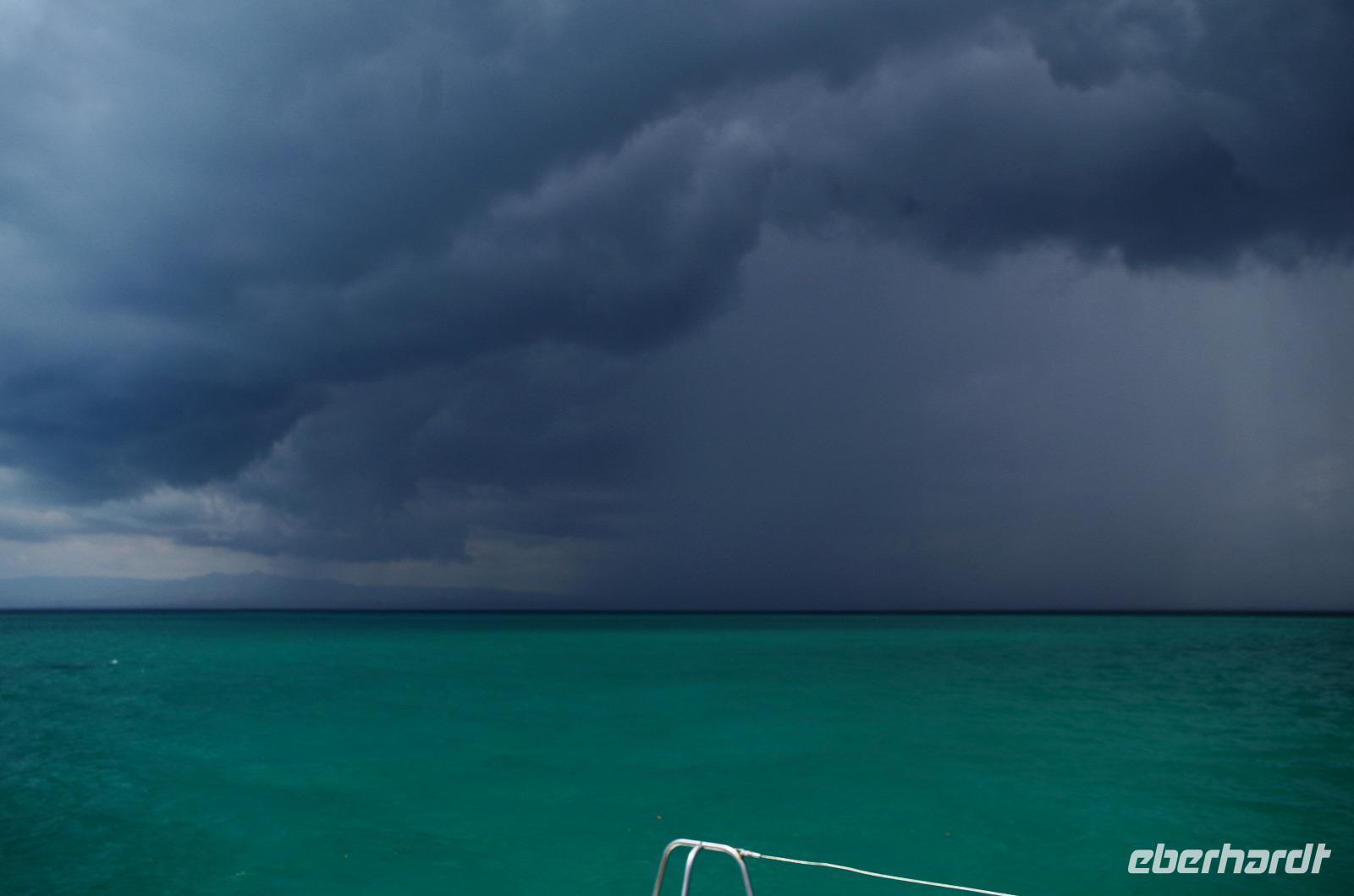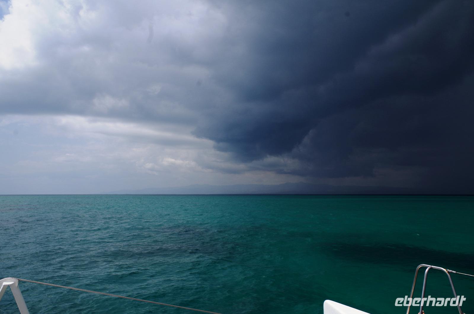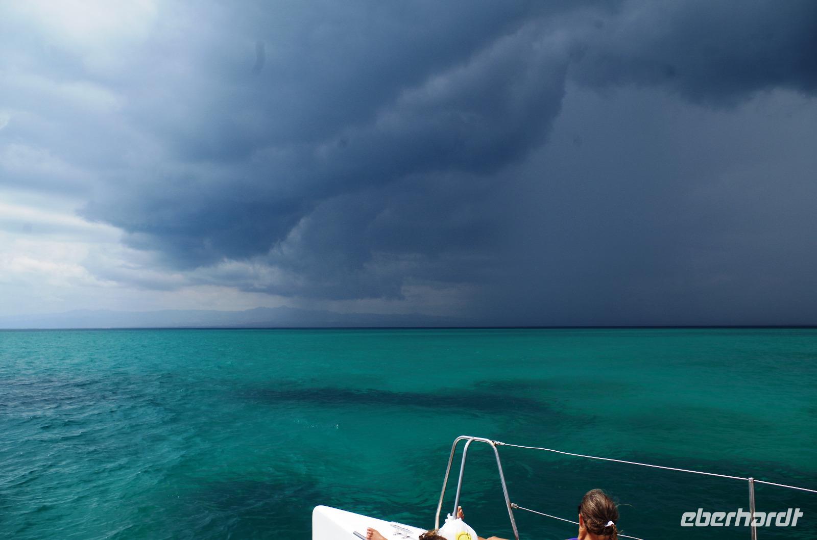 Die Zeit verging leider viel zu schnell und so waren wir wenig später schon wieder auf dem Katamaran. Nicht nur die Paella und die Getränke auf der Insel waren im Preis inbegriffen, auch die Getränke an Bord. Da wir unseren Sport für heute mit schnorcheln und baden erfüllt hatten, kosteten wir uns durch die Karte. Der Himmel hatte heute den ganzen Tag schon eine Mischung aus blau/grau/schwarz, aber jetzt dominierte definitiv schwarz. Aber es war ein herrlicher Anblick, das smaragdgrüne Wasser und der schwarze bedrohliche Himmel sahen umwerfend aus. Gegen den kleinen Regenguss gab es eine Plane und zwei Gäste hatten sogar den Regenschirm aus dem Hotel mitgenommen. Dieser sollte vermutlich aber eher gegen die Sonne schützen...