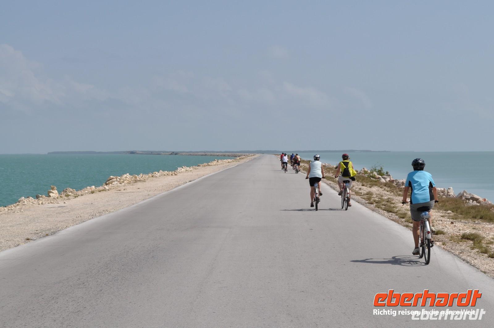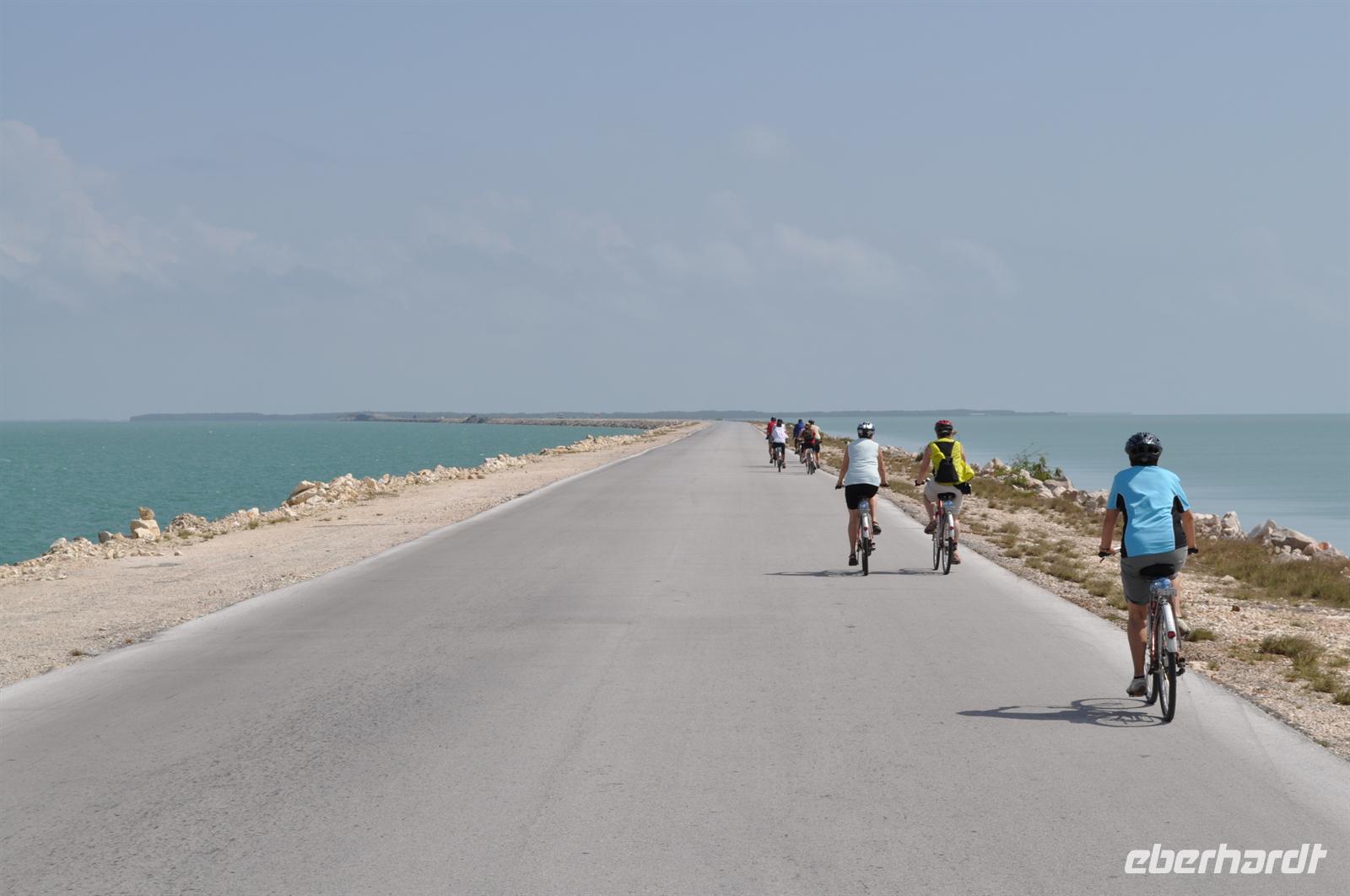Heute werden wir das Ende unserer Radtour ansteuern. Nach dem Frühstück besuchen wir eine Zigarrenfabrik in Santa Clara und reisen anschließend mit dem Bus von Santa Clara nach Caibarien und weiter zu einem 45 km langen Damm, der die Insel Kuba mit einer Inselgruppe verbindet. Über „Cayos de la Herradura“ gelangen wir zur Insel „Cayo Las Brujas“, wo wir an einem schattigen Ort eine Pause einlegen. Die letzte Etappe unserer Radreise führt uns zur nördlichsten Insel dieses Archipels „Cayo Santa Maria“ wo wir unser Quartier für die nächsten 3 Nächte beziehen.