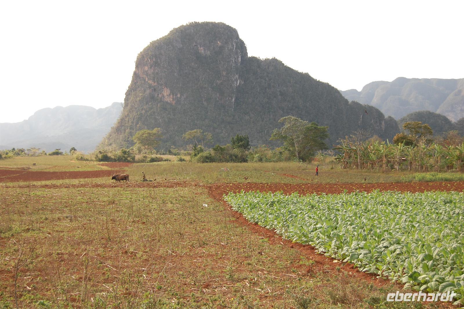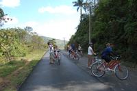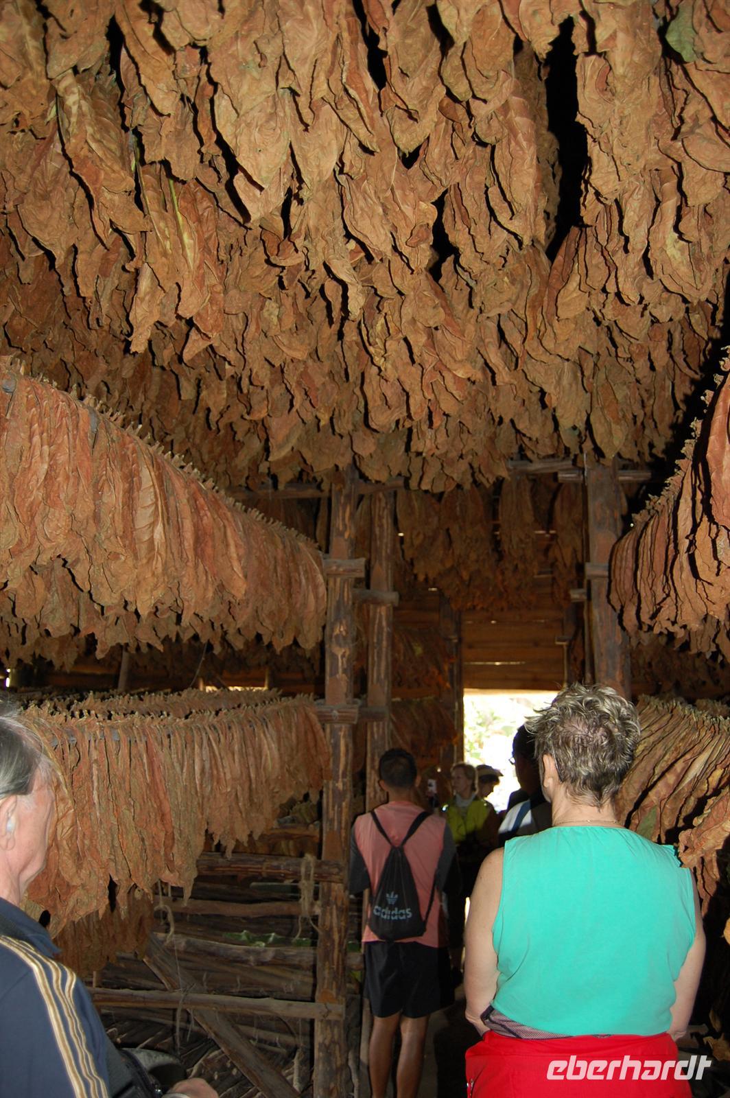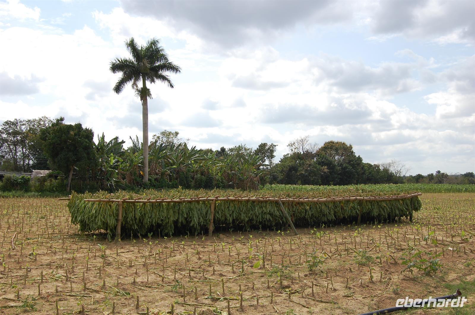 Nach dem gemeinsamen Frühstück verlassen wir Havanna mit dem Reisebus und fahren über die Autopista nach Süd-West in die Provinz Pinar del Rio. Kurz vor der gleichnamigen Stadt verlassen wir die Autobahn und fahren auf einer kleinen Nebenstraße nach Norden. Endlich ist es so weit, wir können nun unsere Radreise beginnen. Dazu laden wir die robusten 28“ Trekking-Räder aus dem Bus. Nach einigen Abstimmungen der Räder auf die jeweiligen Radler steigen wir in die Sattel. Nach einigen Minuten Fahrt erreichen wir eine Finca eines Tabakbauern, wo wir uns alles über den Anbau und der Verarbeitung der Tabakpflanzen anschauen. In der Provinz Pinar del Rio wird der beste Tabak angebaut, der für die Herstellung der legendären „Havanna“ die Rohstoffe liefert.
