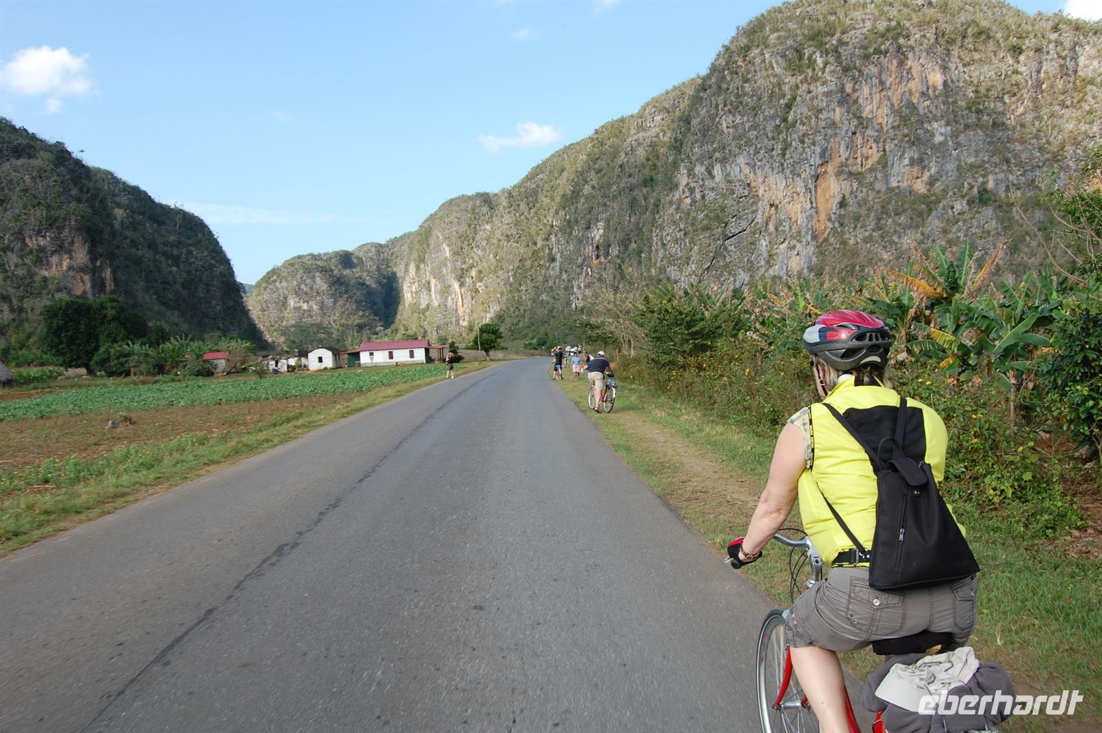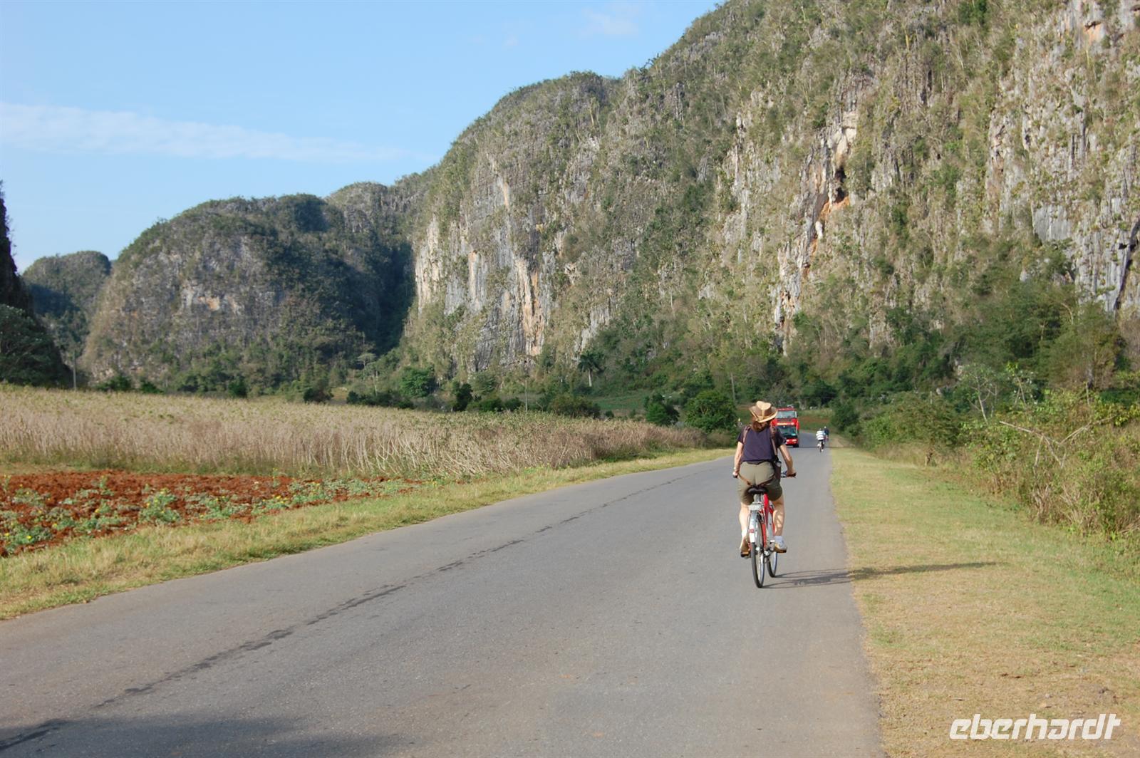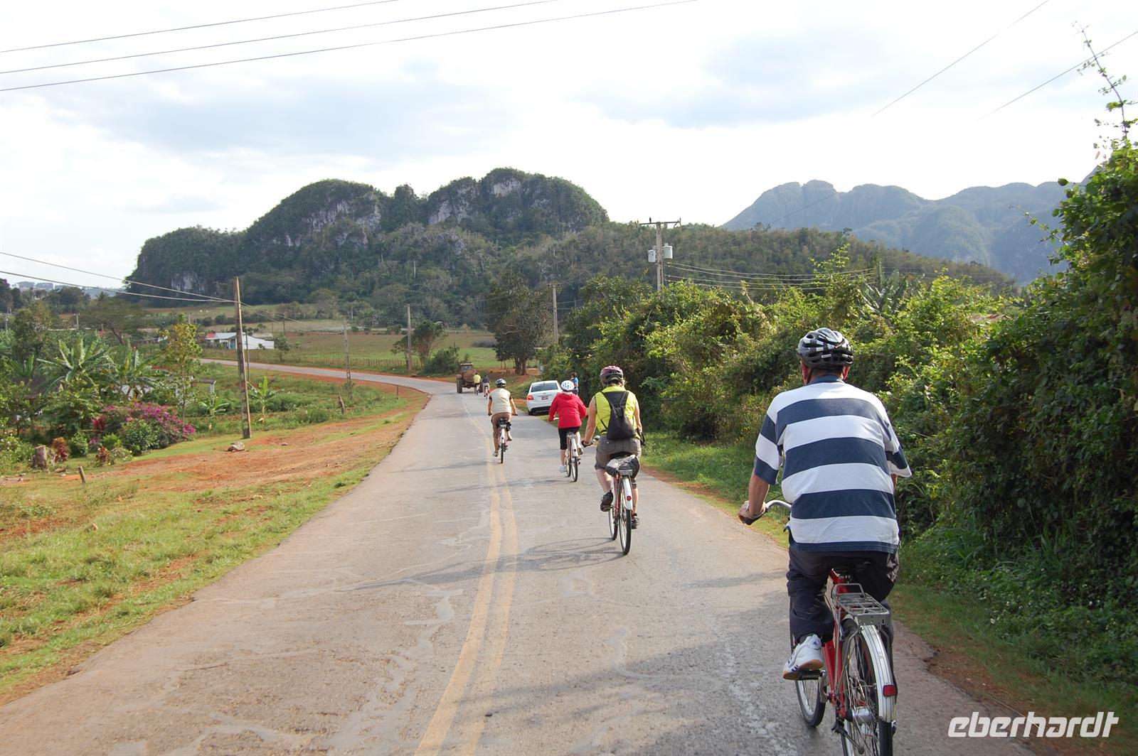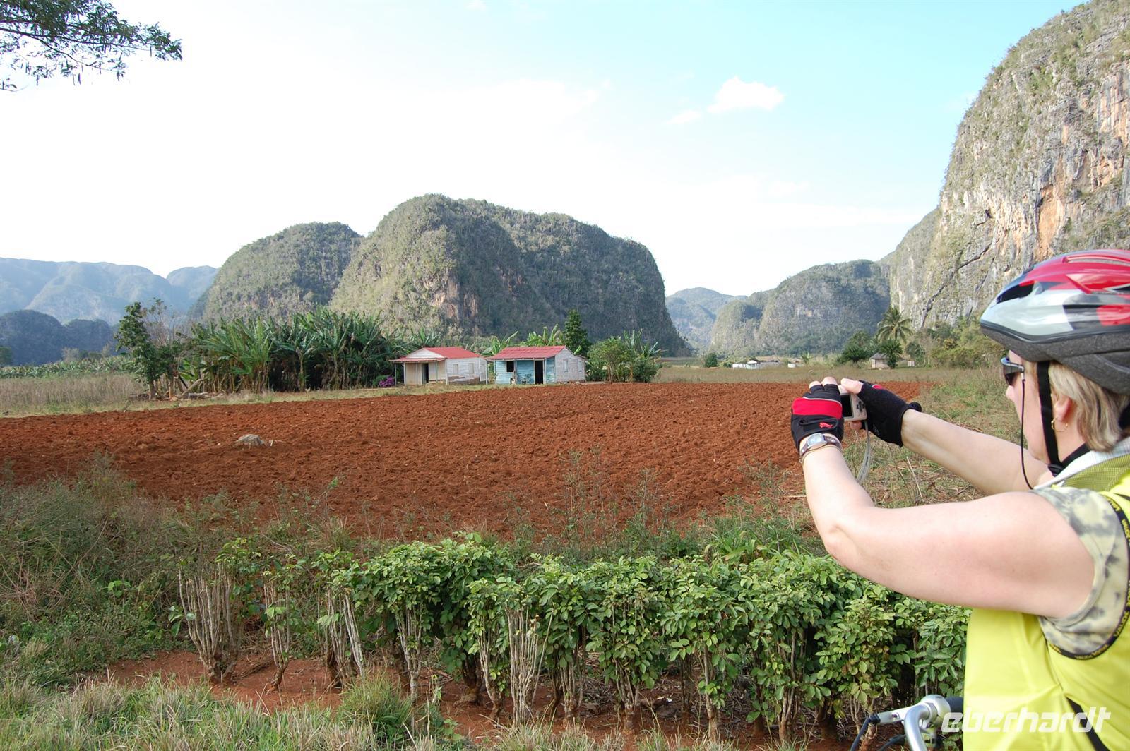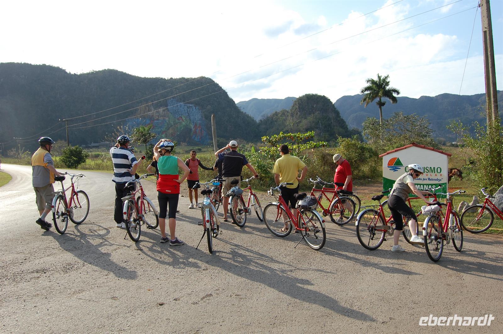 Weiter geht es durch kleine Ortschaften mit dem Rad bis wir an eine Steigung kommen, an der wir die Räder verladen. Mit dem Bus erreichen wir das Vinales-Tal, einen Nationalpark mit hohen Karstfelsen (Mogoten) und Höhlen. Der Reisebus bringt uns zu einer nahe gelegenen Freiluftgaststätte. Nach der schmackhaften Mahlzeit bei kubanischer Musik radeln wir durch die schmucke Gemeinde Vinales und gelangen schließlich zu den „Dos Hermanas“ - den zwei Töchtern, mit einer Wandmalerei zur Entstehungsgeschichte des Menschen „Mural de la Prehistoria“. Anschließend besuchen wir nun das Städtchen Vinales, wo wir die Gelegenheit zu einem Bummel nutzen. Eingebettet in die sagenhafte Landschaft des gleichnamigen Tales, ist Vinales eine quirliger Pilgerstätte aller Kuba-Touristen. Um so mehr freut es uns, dass die kleine Kirche am Markt, nun neu saniert, ein wahres Schmuckstück geworden ist. Nach nur wenigen Kilometern mit dem „Drahtesel“ durch diese schöne Landschaft gelangen wir zu unserer Herberge für die nächsten zwei Nächte, die „Rancho San Vicente“, einer Ferienanlage mit Pool und kleinen Ferienhäusern, die auf dem Ressort verstreut angeordnet sind. Nachdem sich jeder nach der Dusche sehnt, treffen wir uns später zum Abendessen, dass im Gegensatz zur Dusche warm und reichlich ausfällt. Ja, der Kuba-Tourismus übers Land ist immer für Überraschungen gut. Mal sind diese positiv, mal negativ, aber ändern kann und will man daran kaum etwas. Wer das Land mit der Geschichte kennt, versteht auch manches Problemchen und lächelt.