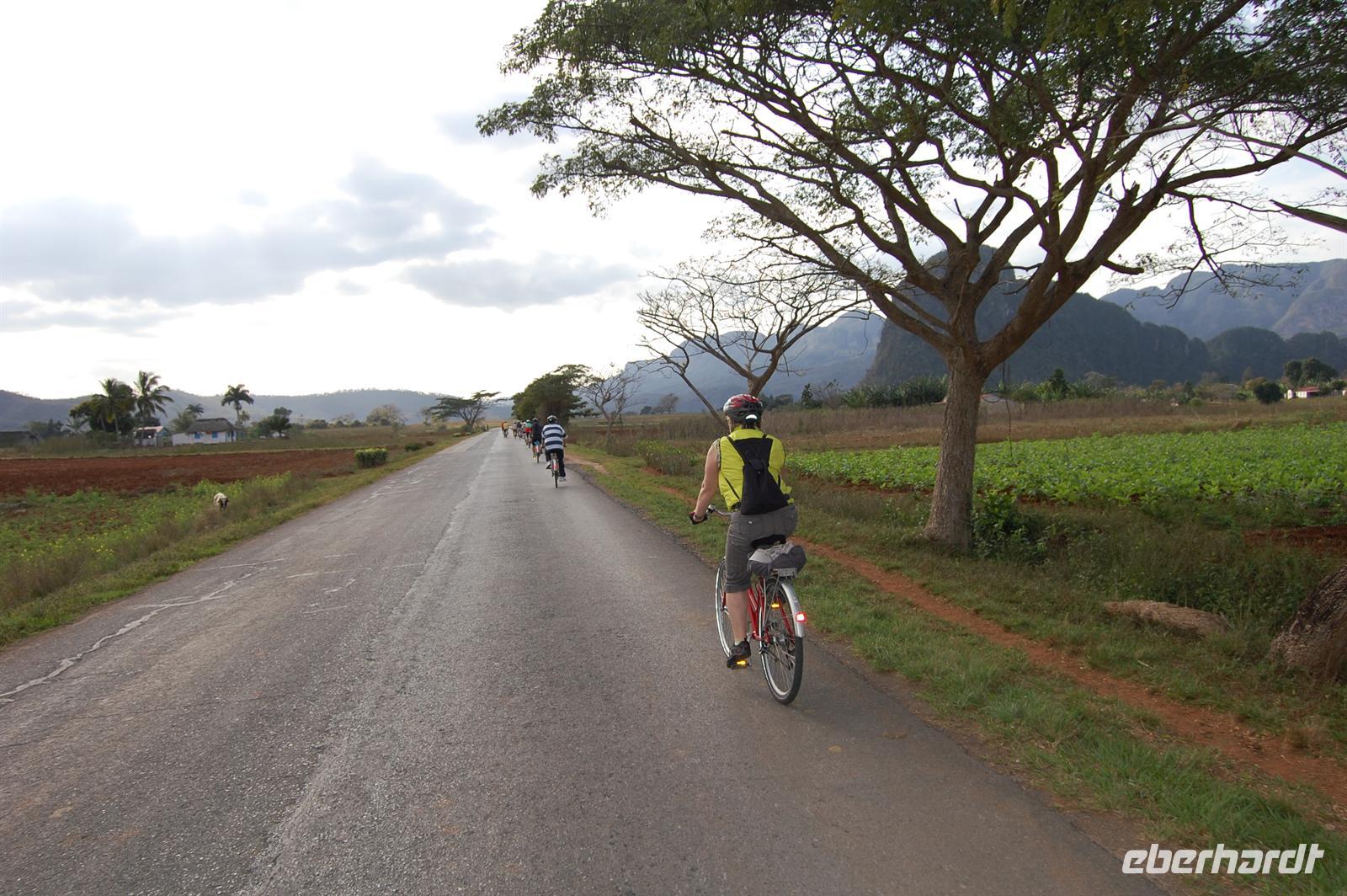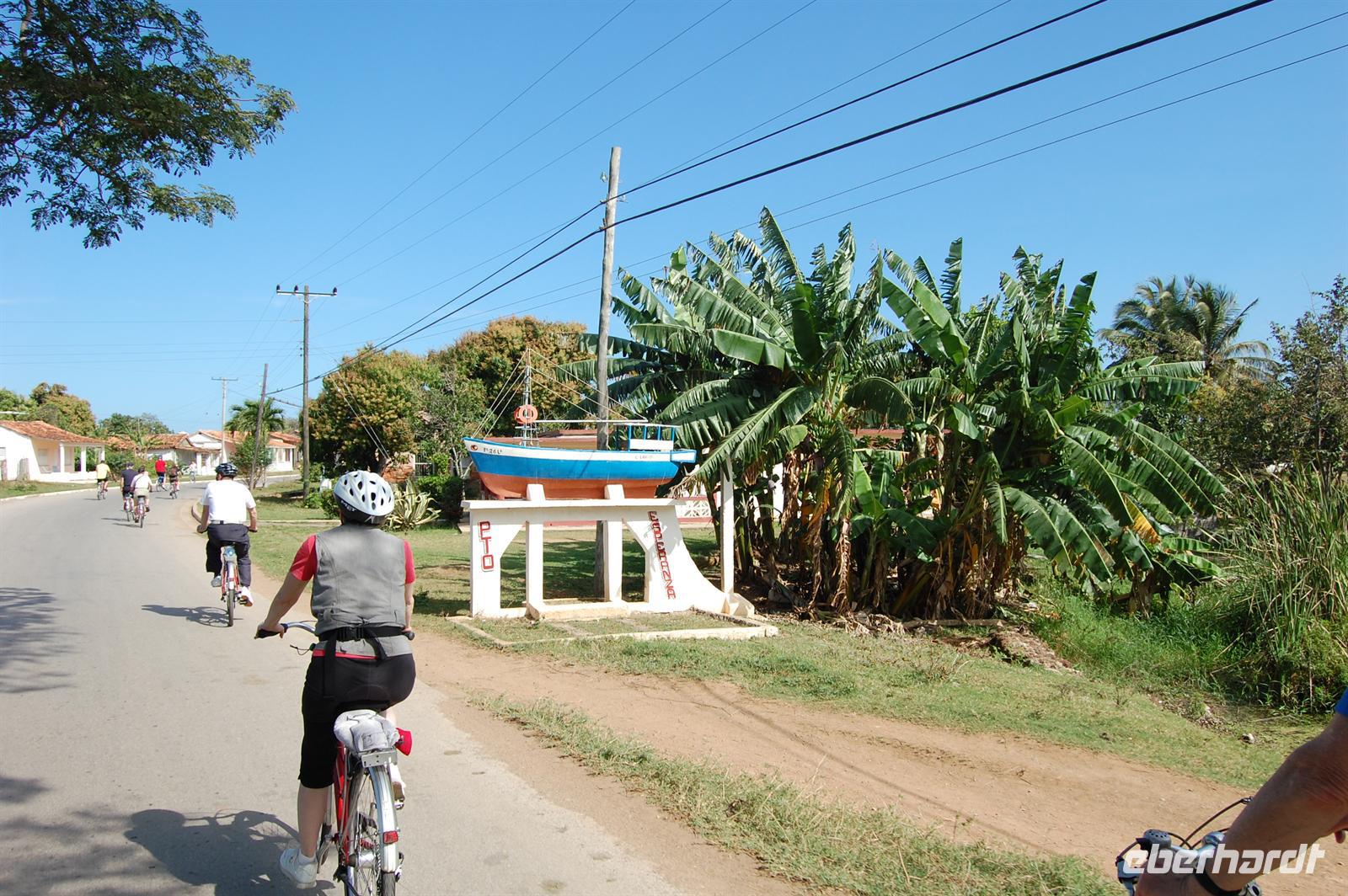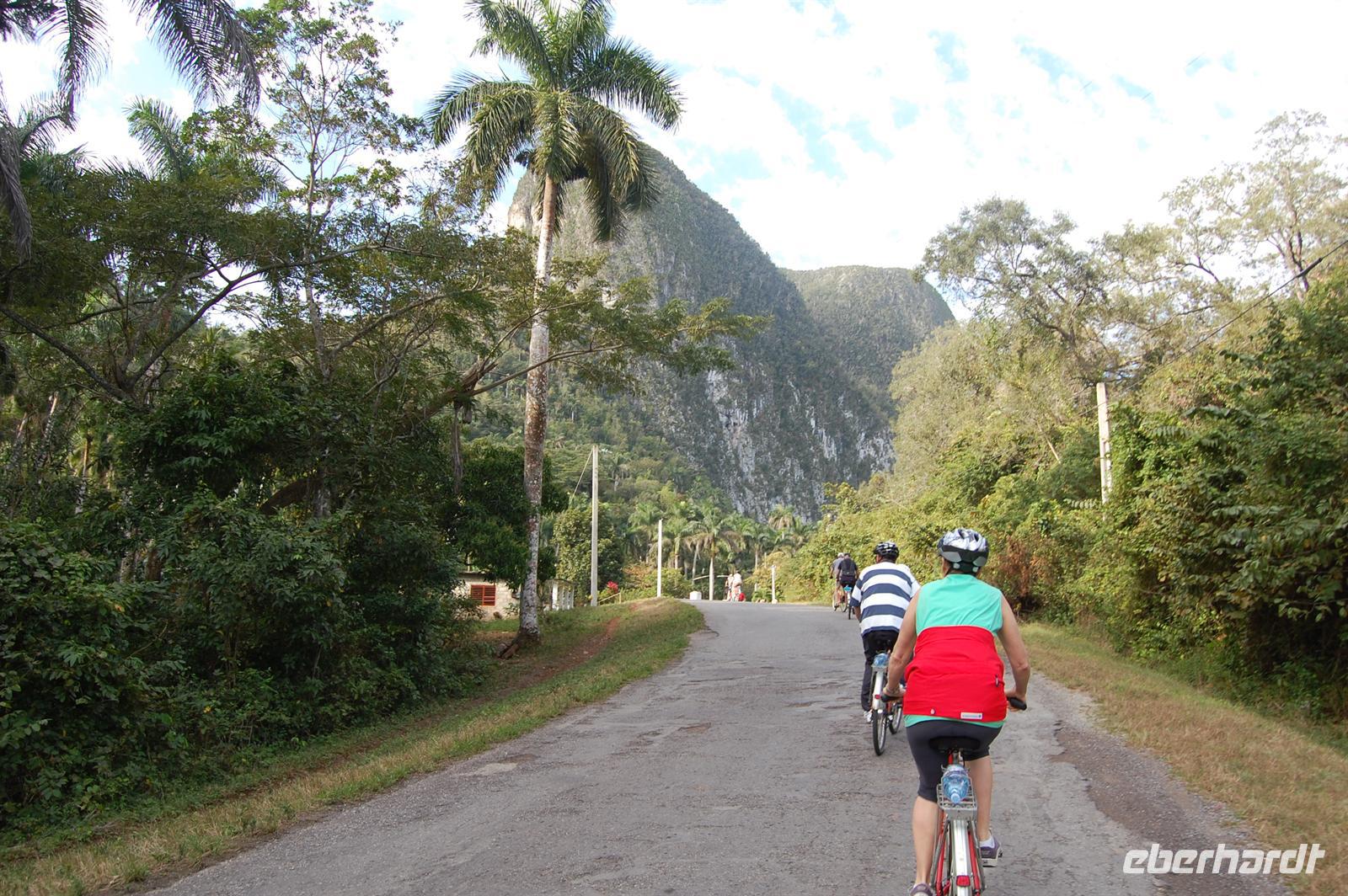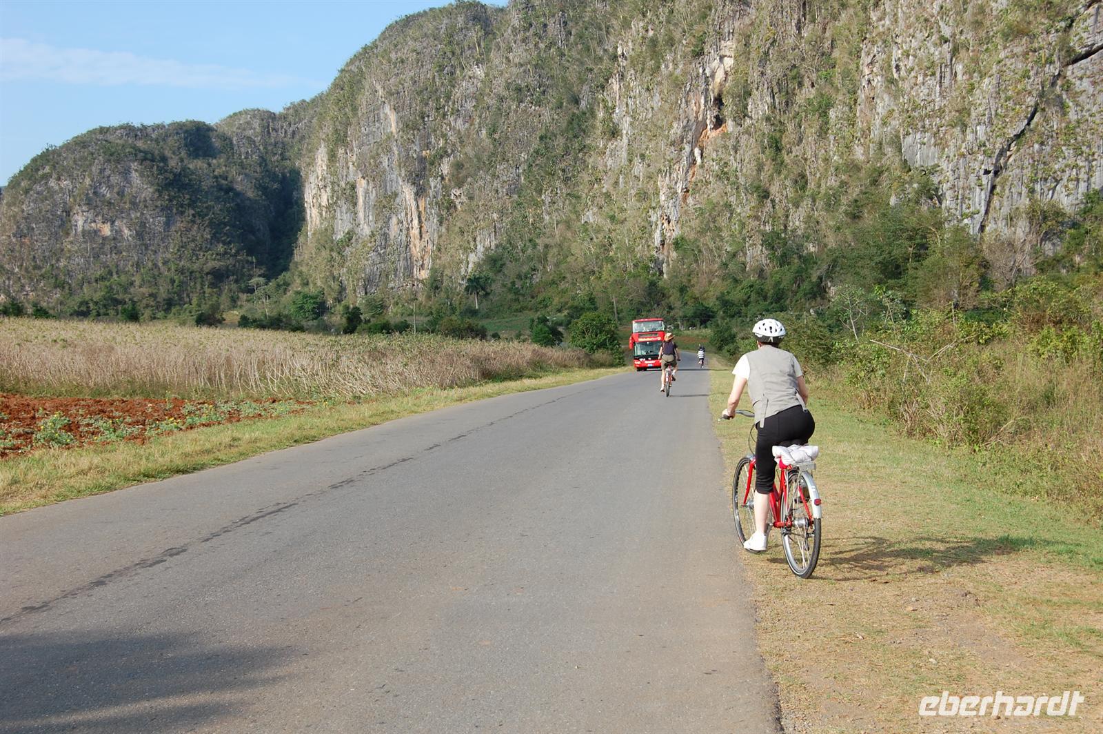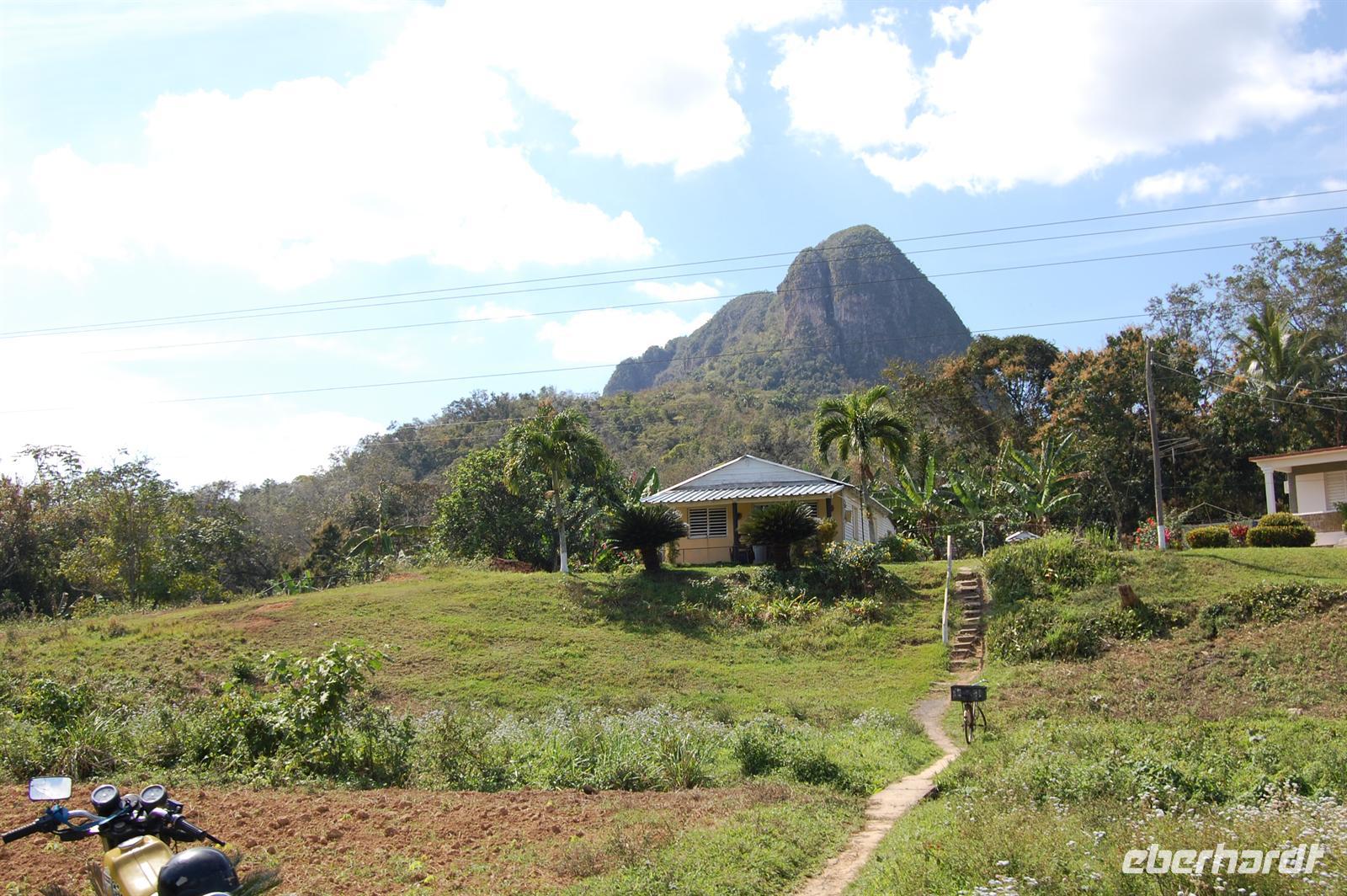 Weiter geht es durch kleine Ortschaften mit dem Rad bis wir an eine Steigung kommen, an der wir die Räder verladen. Mit dem Bus erreichen wir das Vinales-Tal, einen Nationalpark mit hohen Karstfelsen (Mogoten) und Höhlen. Der Reisebus bringt uns zu einer nahe gelegenen Freiluftgaststätte. Nach der schmackhaften Mahlzeit bei kubanischer Musik radeln wir durch die schmucke Gemeinde Vinales und gelangen schließlich zu den „Dos Hermanas“ - den zwei Töchtern, mit einer Wandmalerei zur Entstehungsgeschichte des Menschen „Mural de la Prehistoria“. Anschließend besuchen wir nun das Städtchen Vinales, wo wir die Gelegenheit zu einem Bummel nutzen. Eingebettet in die sagenhafte Landschaft des gleichnamigen Tales, ist Vinales eine quirliger Pilgerstätte aller Kuba-Touristen. Um so mehr freut es uns, dass die kleine Kirche am Markt, nun neu saniert, ein wahres Schmuckstück geworden ist. Nach nur wenigen Kilometern mit dem „Drahtesel“ durch diese schöne Landschaft gelangen wir zu unserer Herberge für die nächsten zwei Nächte, die „Rancho San Vicente“, einer Ferienanlage mit Pool und kleinen Ferienhäusern, die auf dem Ressort verstreut angeordnet sind. Nachdem sich jeder nach der Dusche sehnt, treffen wir uns später zum Abendessen, dass im Gegensatz zur Dusche warm und reichlich ausfällt. Ja, der Kuba-Tourismus übers Land ist immer für Überraschungen gut. Mal sind diese positiv, mal negativ, aber ändern kann und will man daran kaum etwas. Wer das Land mit der Geschichte kennt, versteht auch manches Problemchen und lächelt.