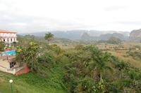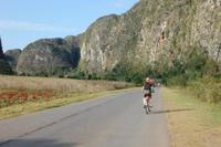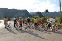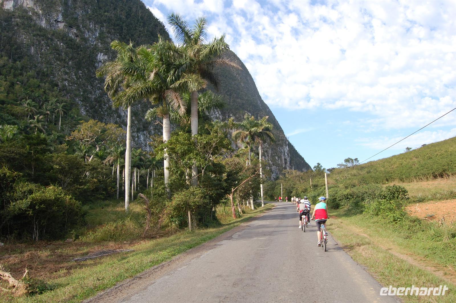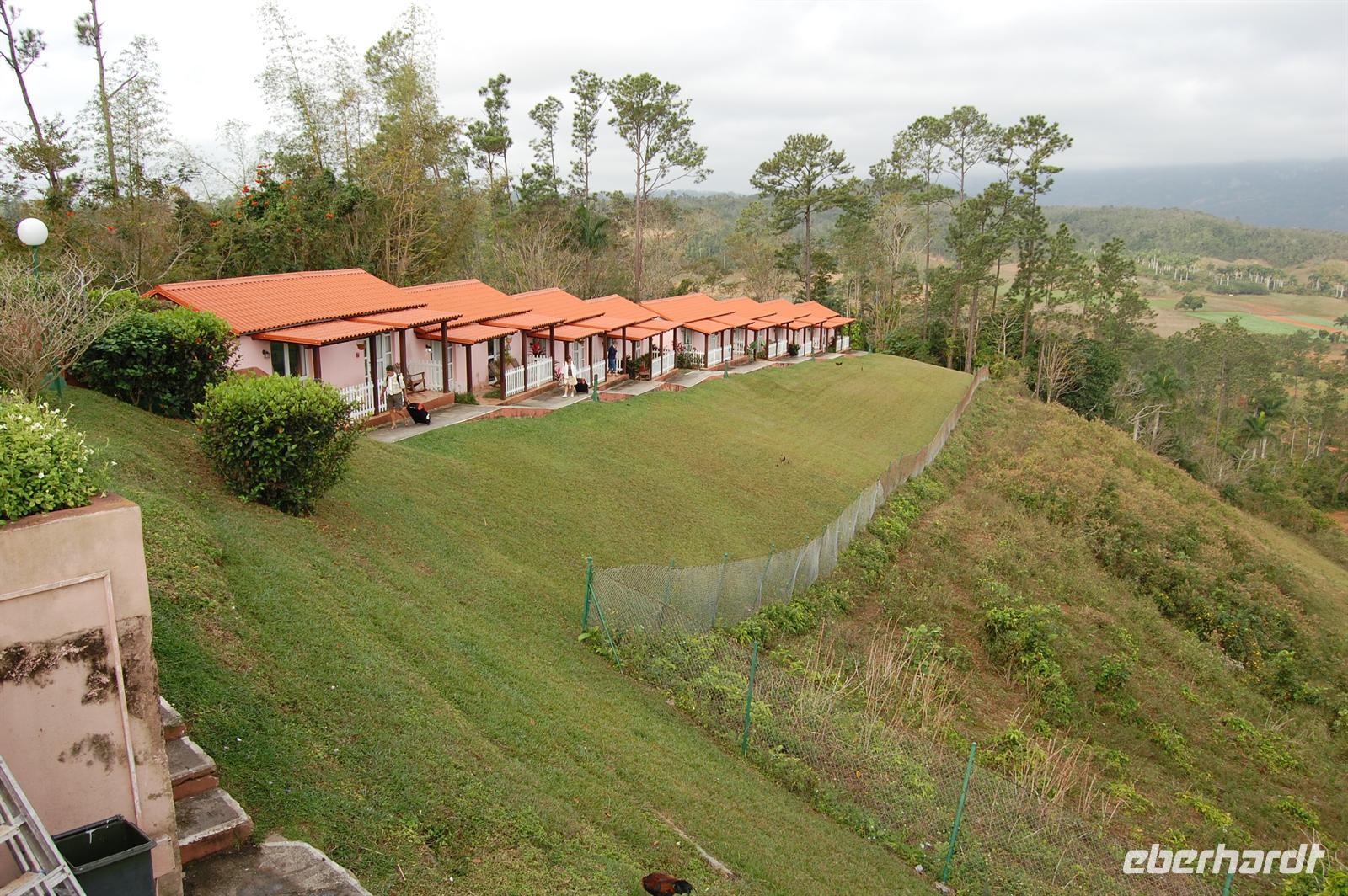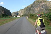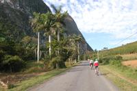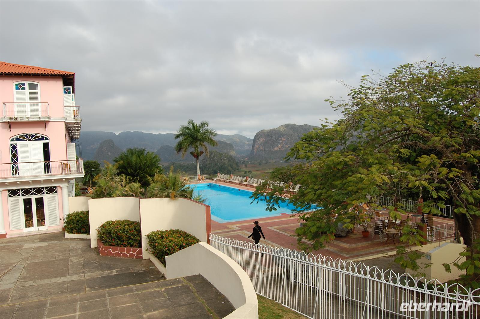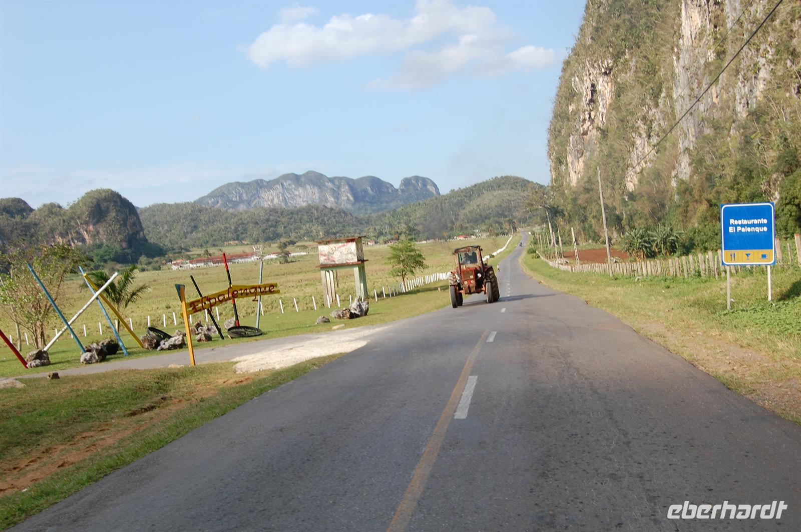 Weiter geht es durch kleine Ortschaften mit dem Rad bis wir an eine Steigung kommen, an der wir die Räder verladen. Mit dem Bus erreichen wir das Vinales-Tal, einen Nationalpark mit hohen Karstfelsen (Mogoten) und Höhlen. Der Reisebus bringt uns zu einer nahe gelegenen Freiluftgaststätte. Nach der schmackhaften Mahlzeit bei kubanischer Musik radeln wir durch die schmucke Gemeinde Vinales und gelangen schließlich zu den „Dos Hermanas“ - den zwei Töchtern, mit einer Wandmalerei zur Entstehungsgeschichte des Menschen „Mural de la Prehistoria“. Anschließend besuchen wir nun das Städtchen Vinales, wo wir die Gelegenheit zu einem Bummel nutzen. Eingebettet in die sagenhafte Landschaft des gleichnamigen Tales, ist Vinales eine quirliger Pilgerstätte aller Kuba-Touristen. Um so mehr freut es uns, dass die kleine Kirche am Markt, nun neu saniert, ein wahres Schmuckstück geworden ist. Nach nur wenigen Kilometern mit dem „Drahtesel“ durch diese schöne Landschaft gelangen wir zu unserer Herberge für die nächsten zwei Nächte, die „Rancho San Vicente“, einer Ferienanlage mit Pool und kleinen Ferienhäusern, die auf dem Ressort verstreut angeordnet sind. Nachdem sich jeder nach der Dusche sehnt, treffen wir uns später zum Abendessen, dass im Gegensatz zur Dusche warm und reichlich ausfällt. Ja, der Kuba-Tourismus übers Land ist immer für Überraschungen gut. Mal sind diese positiv, mal negativ, aber ändern kann und will man daran kaum etwas. Wer das Land mit der Geschichte kennt, versteht auch manches Problemchen und lächelt.