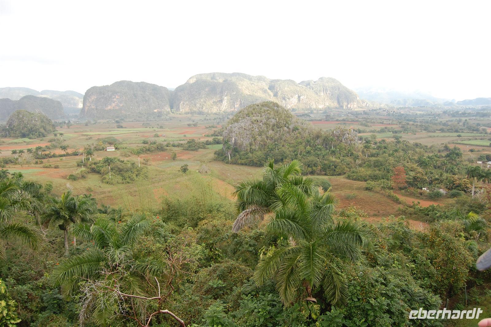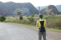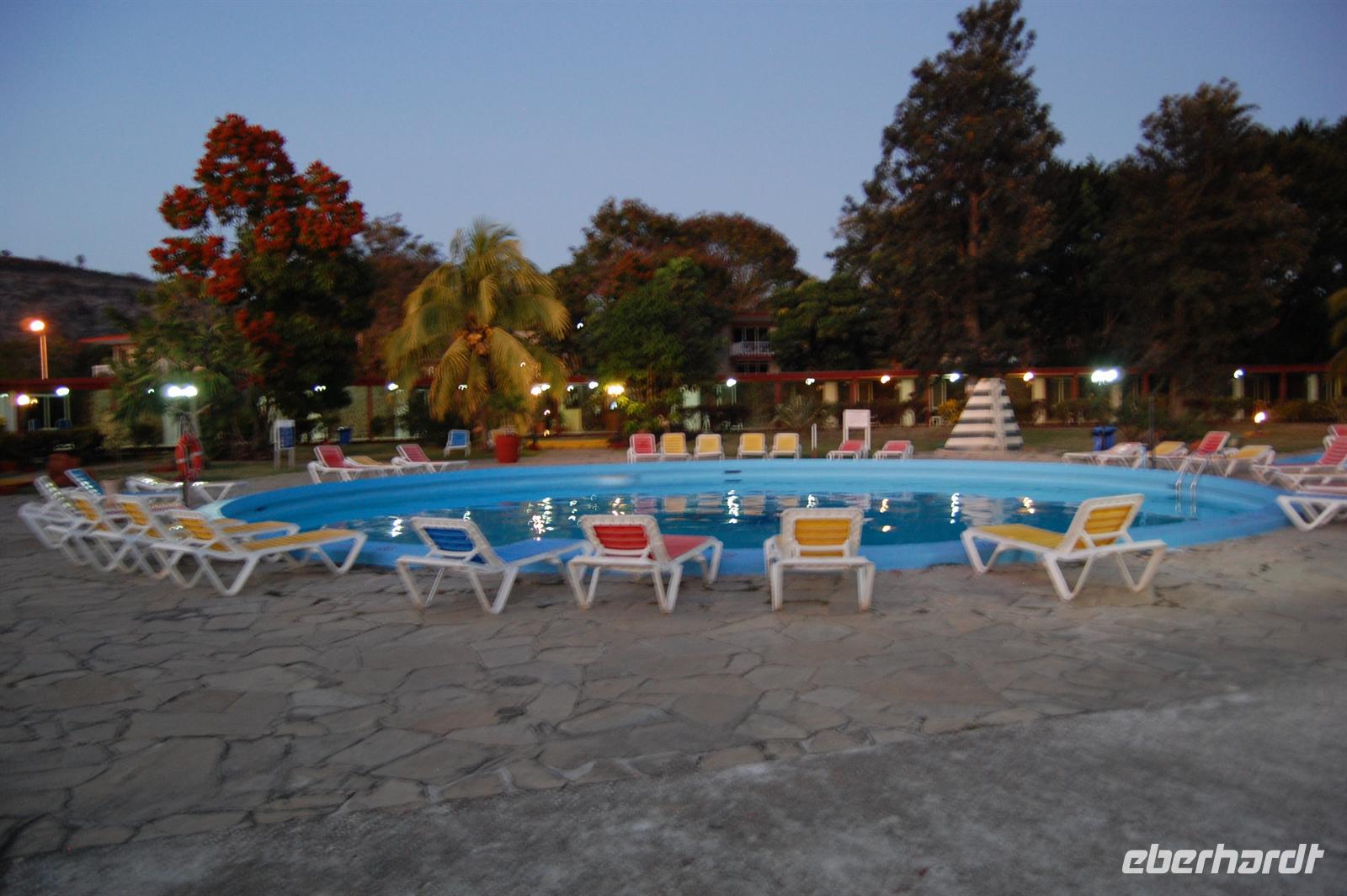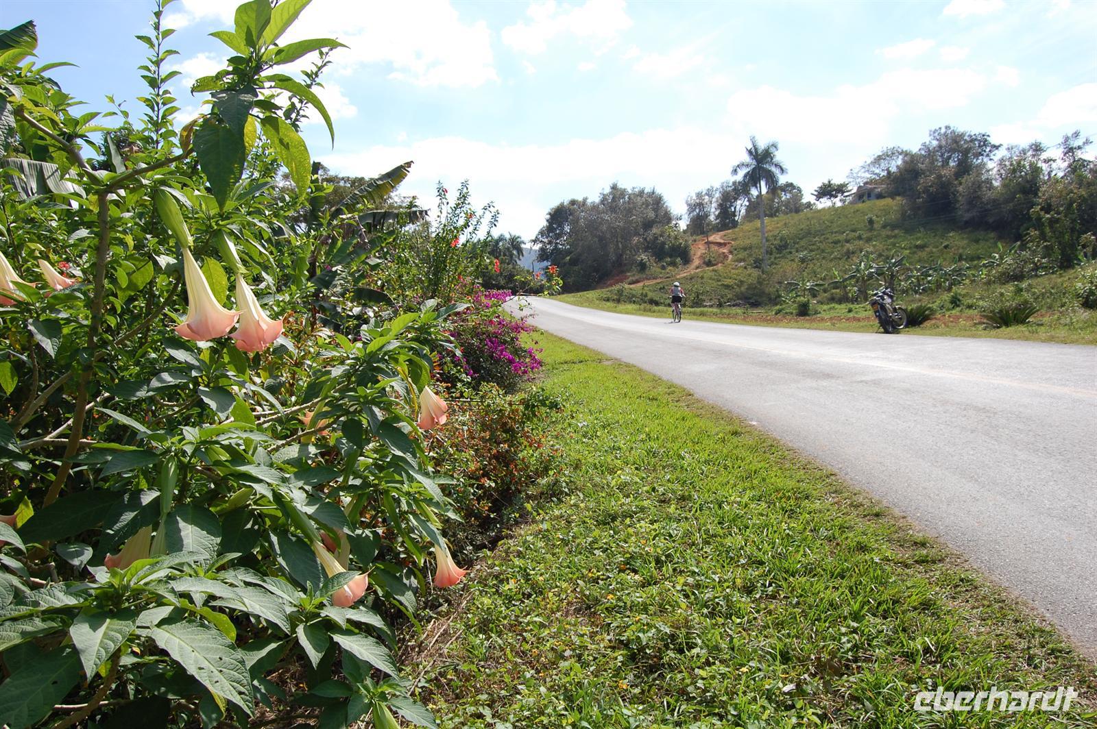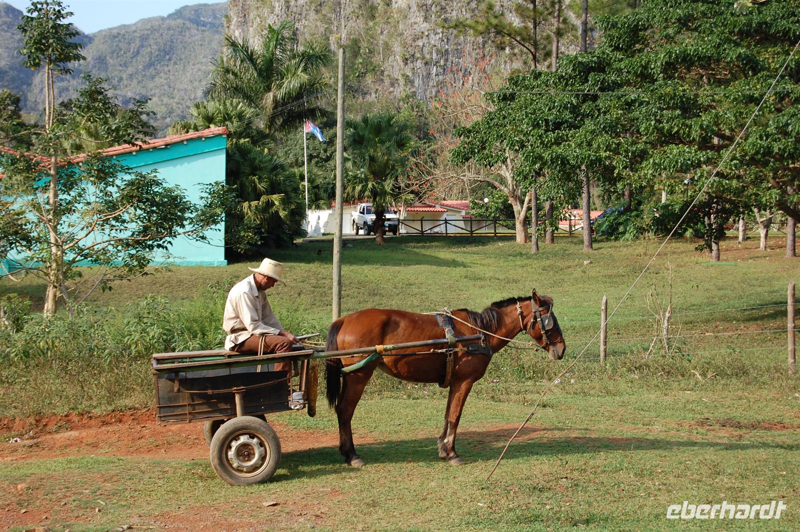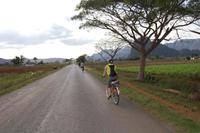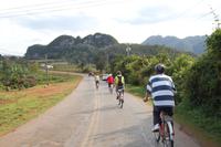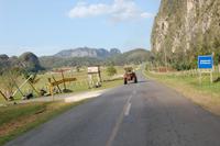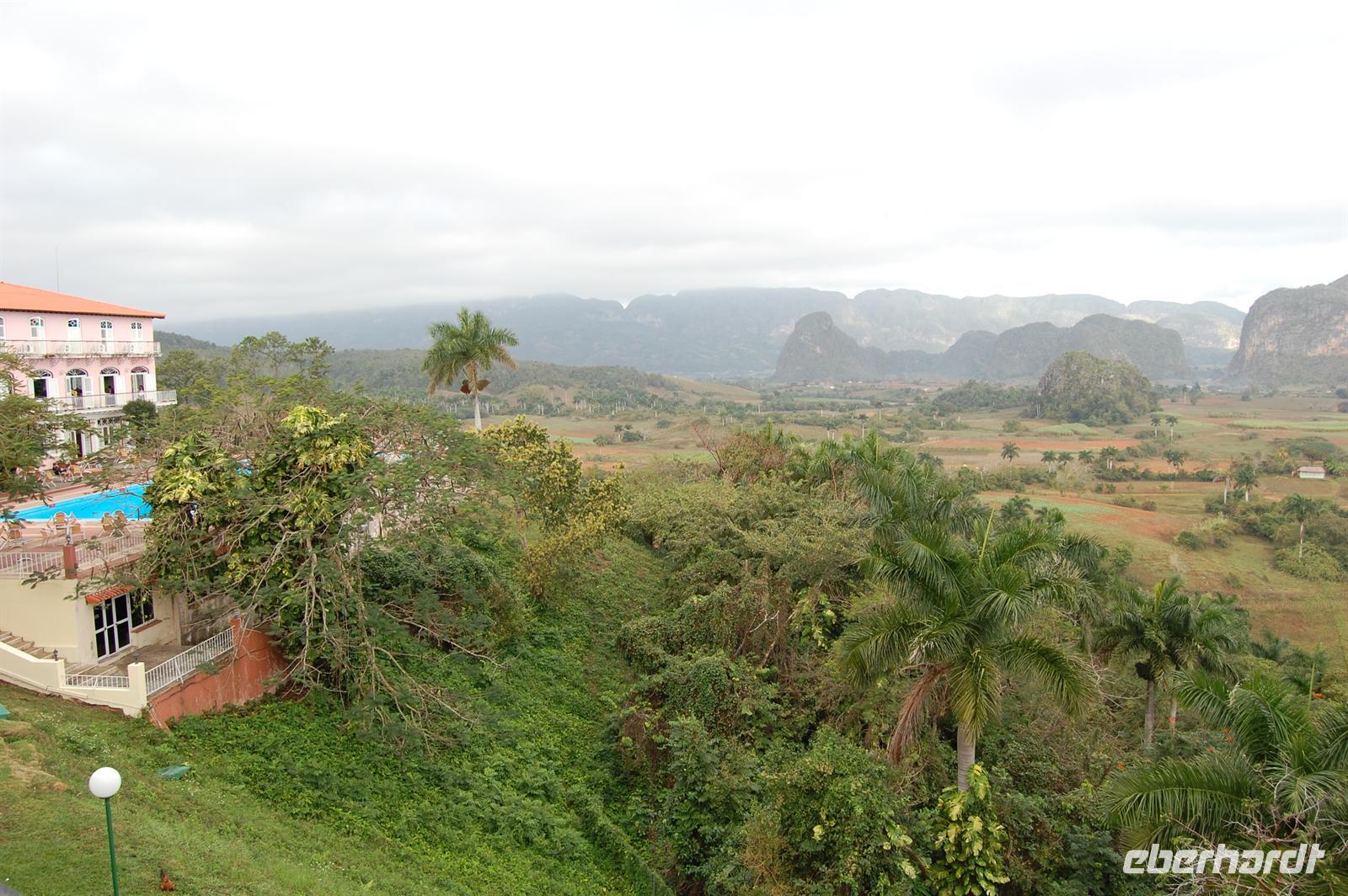 Weiter geht es durch kleine Ortschaften mit dem Rad bis wir an eine Steigung kommen, an der wir die Räder verladen. Mit dem Bus erreichen wir das Vinales-Tal, einen Nationalpark mit hohen Karstfelsen (Mogoten) und Höhlen. Der Reisebus bringt uns zu einer nahe gelegenen Freiluftgaststätte. Nach der schmackhaften Mahlzeit bei kubanischer Musik radeln wir durch die schmucke Gemeinde Vinales und gelangen schließlich zu den „Dos Hermanas“ - den zwei Töchtern, mit einer Wandmalerei zur Entstehungsgeschichte des Menschen „Mural de la Prehistoria“. Anschließend besuchen wir nun das Städtchen Vinales, wo wir die Gelegenheit zu einem Bummel nutzen. Eingebettet in die sagenhafte Landschaft des gleichnamigen Tales, ist Vinales eine quirliger Pilgerstätte aller Kuba-Touristen. Um so mehr freut es uns, dass die kleine Kirche am Markt, nun neu saniert, ein wahres Schmuckstück geworden ist. Nach nur wenigen Kilometern mit dem „Drahtesel“ durch diese schöne Landschaft gelangen wir zu unserer Herberge für die nächsten zwei Nächte, die „Rancho San Vicente“, einer Ferienanlage mit Pool und kleinen Ferienhäusern, die auf dem Ressort verstreut angeordnet sind. Nachdem sich jeder nach der Dusche sehnt, treffen wir uns später zum Abendessen, dass im Gegensatz zur Dusche warm und reichlich ausfällt. Ja, der Kuba-Tourismus übers Land ist immer für Überraschungen gut. Mal sind diese positiv, mal negativ, aber ändern kann und will man daran kaum etwas. Wer das Land mit der Geschichte kennt, versteht auch manches Problemchen und lächelt.