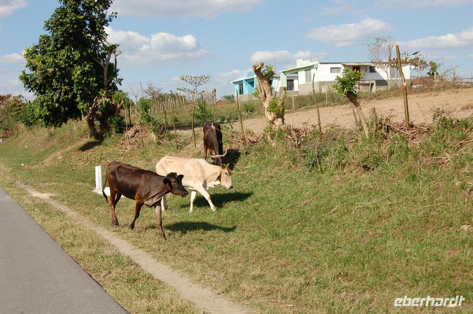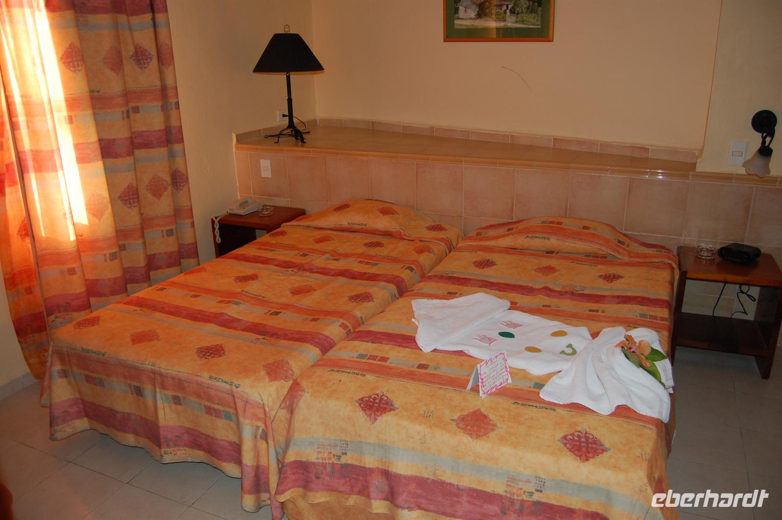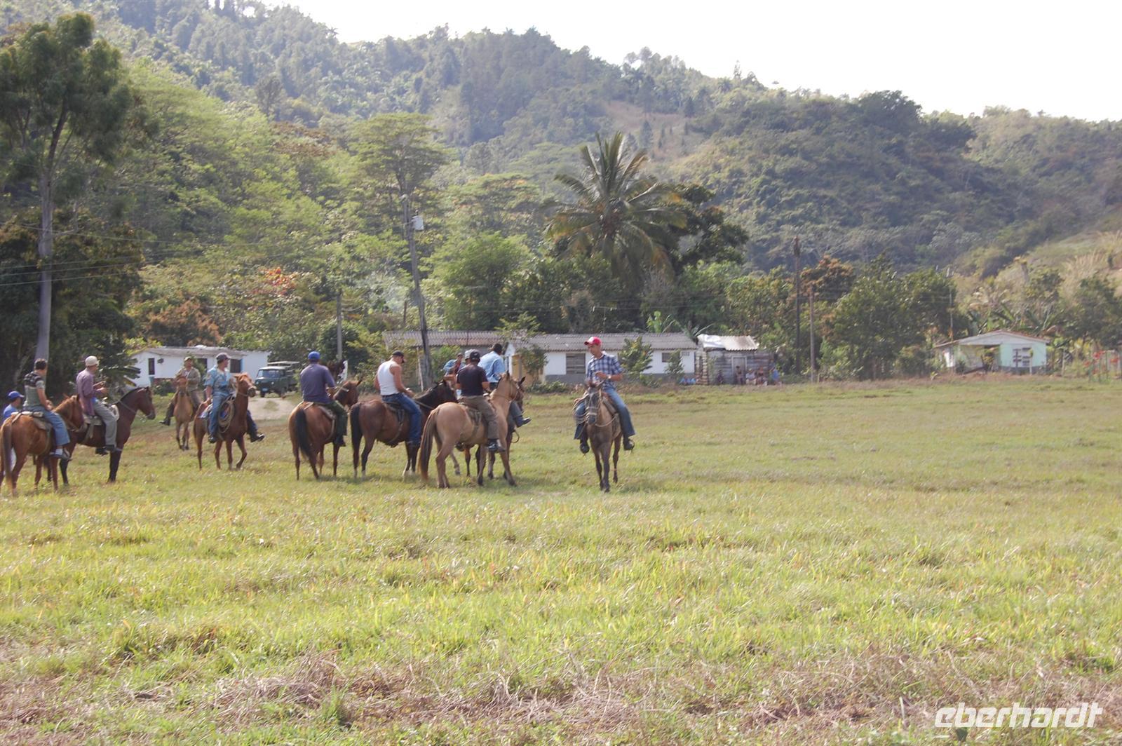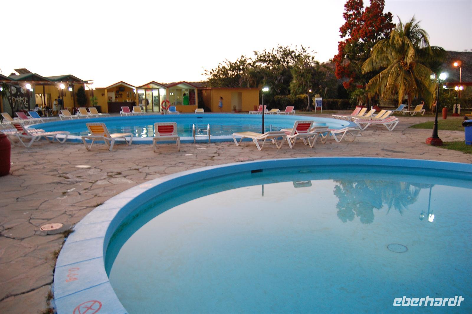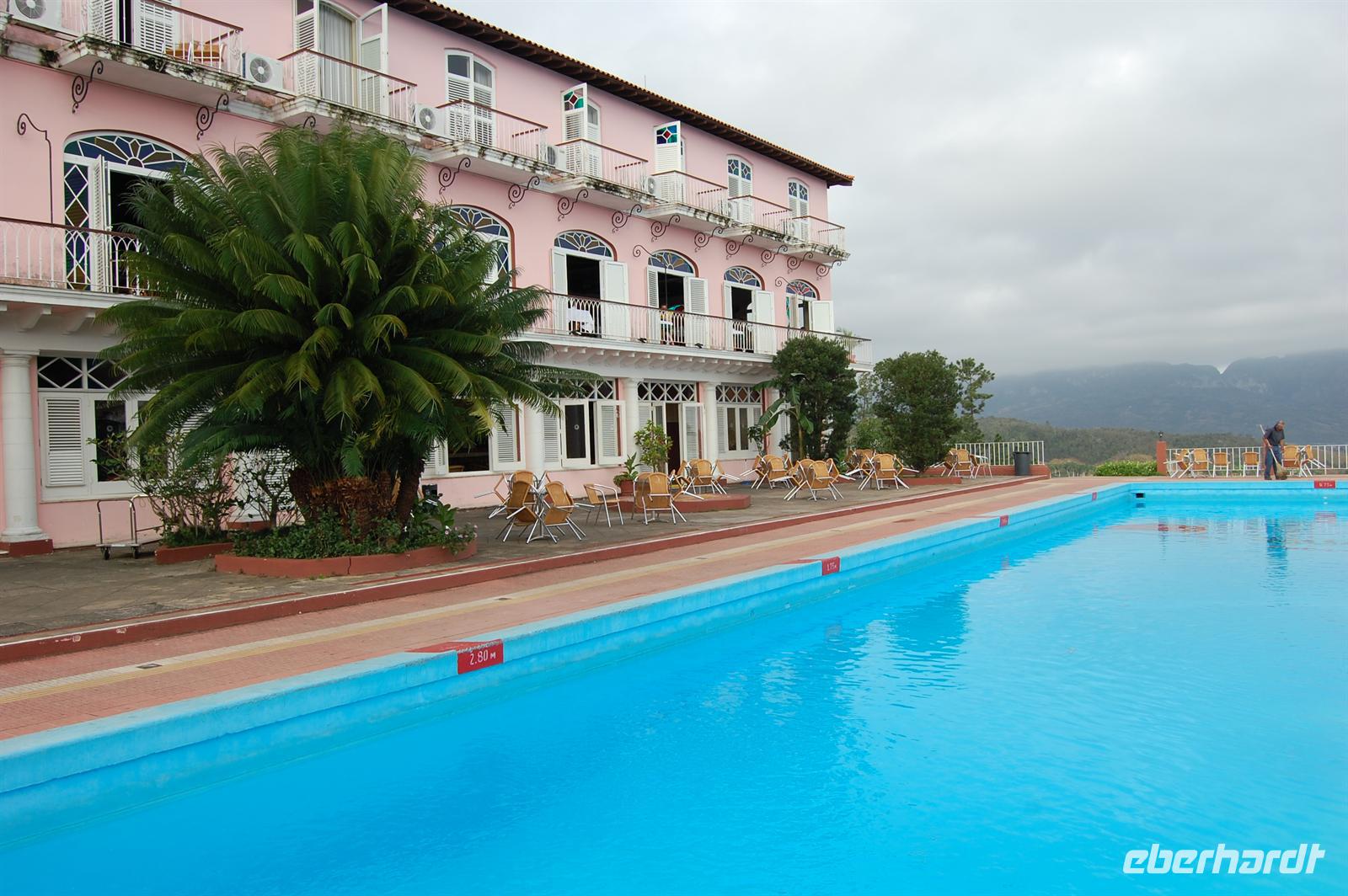 Weiter geht es durch kleine Ortschaften mit dem Rad bis wir an eine Steigung kommen, an der wir die Räder verladen. Mit dem Bus erreichen wir das Vinales-Tal, einen Nationalpark mit hohen Karstfelsen (Mogoten) und Höhlen. Der Reisebus bringt uns zu einer nahe gelegenen Freiluftgaststätte. Nach der schmackhaften Mahlzeit bei kubanischer Musik radeln wir durch die schmucke Gemeinde Vinales und gelangen schließlich zu den „Dos Hermanas“ - den zwei Töchtern, mit einer Wandmalerei zur Entstehungsgeschichte des Menschen „Mural de la Prehistoria“. Anschließend besuchen wir nun das Städtchen Vinales, wo wir die Gelegenheit zu einem Bummel nutzen. Eingebettet in die sagenhafte Landschaft des gleichnamigen Tales, ist Vinales eine quirliger Pilgerstätte aller Kuba-Touristen. Um so mehr freut es uns, dass die kleine Kirche am Markt, nun neu saniert, ein wahres Schmuckstück geworden ist. Nach nur wenigen Kilometern mit dem „Drahtesel“ durch diese schöne Landschaft gelangen wir zu unserer Herberge für die nächsten zwei Nächte, die „Rancho San Vicente“, einer Ferienanlage mit Pool und kleinen Ferienhäusern, die auf dem Ressort verstreut angeordnet sind. Nachdem sich jeder nach der Dusche sehnt, treffen wir uns später zum Abendessen, dass im Gegensatz zur Dusche warm und reichlich ausfällt. Ja, der Kuba-Tourismus übers Land ist immer für Überraschungen gut. Mal sind diese positiv, mal negativ, aber ändern kann und will man daran kaum etwas. Wer das Land mit der Geschichte kennt, versteht auch manches Problemchen und lächelt.