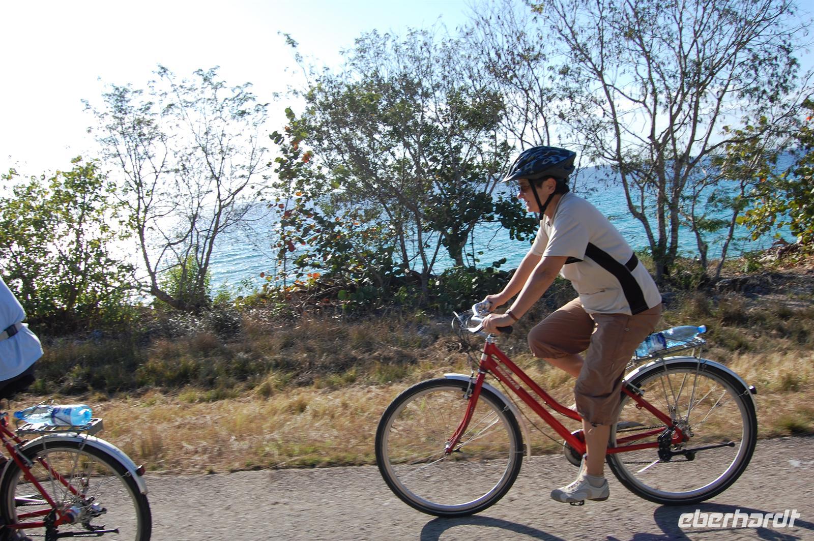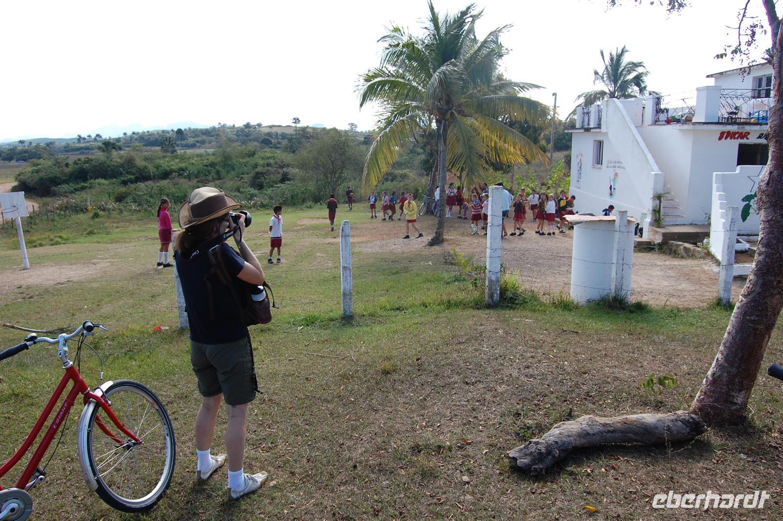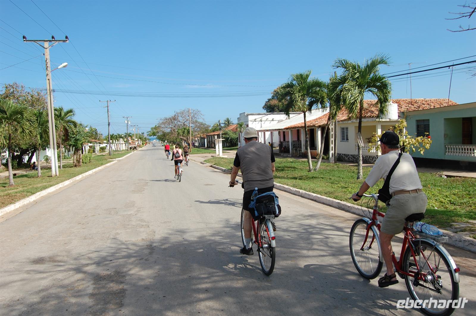 Nach dem Frühstück starten wir gleich mit den Rädern in Richtung Norden, vorbei an wunderschönen Mogoten nach Poerto Esperanza (Hafen der Hoffnung), einem kleinen Fischerdorf. Unterwegs besuchen wir eine Grundschule, denn wir haben alle kleine Geschenke für Kinder aus Deutschland mitgebracht.Bei der Übergabe der Schulmaterialien erfahren wir vom jungen Schuldirektor interessante Details des hervorragenden kubanischen Bildungssystems. Nachdem wir Poerto Esperanza erreicht haben erläutert uns Miguel bei einem Rundgang durch das Dorf sehr anschaulich das Leben der Kubaner. Neben der guten medizinischen Versorgung in der Poliklinik des Ortes und sehr stark subventionierten Medikamenten gibt es aber auch eine Bäckerei, einen Computer-Club und eine Beach-Bar, wo wir ein Picknick mit Sandwichs und kubanischen Früchten vorbereitet haben. Nun starten wir per Rad, um nach einigem Bergauf und Bergab am Nachmittag wieder unsere Unterkunft zu erreichen.