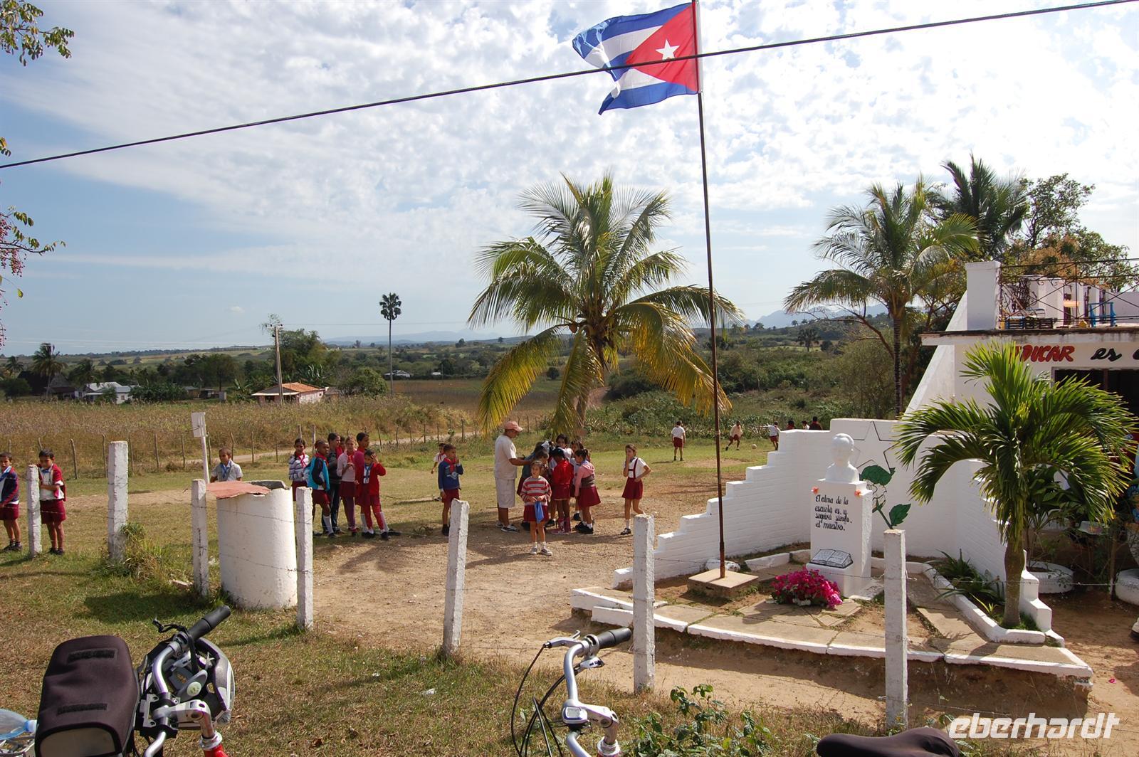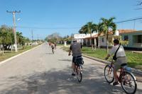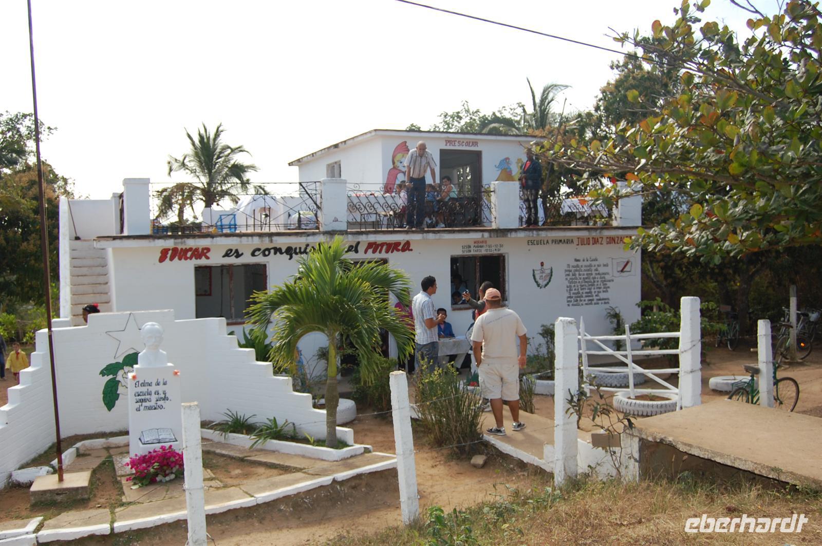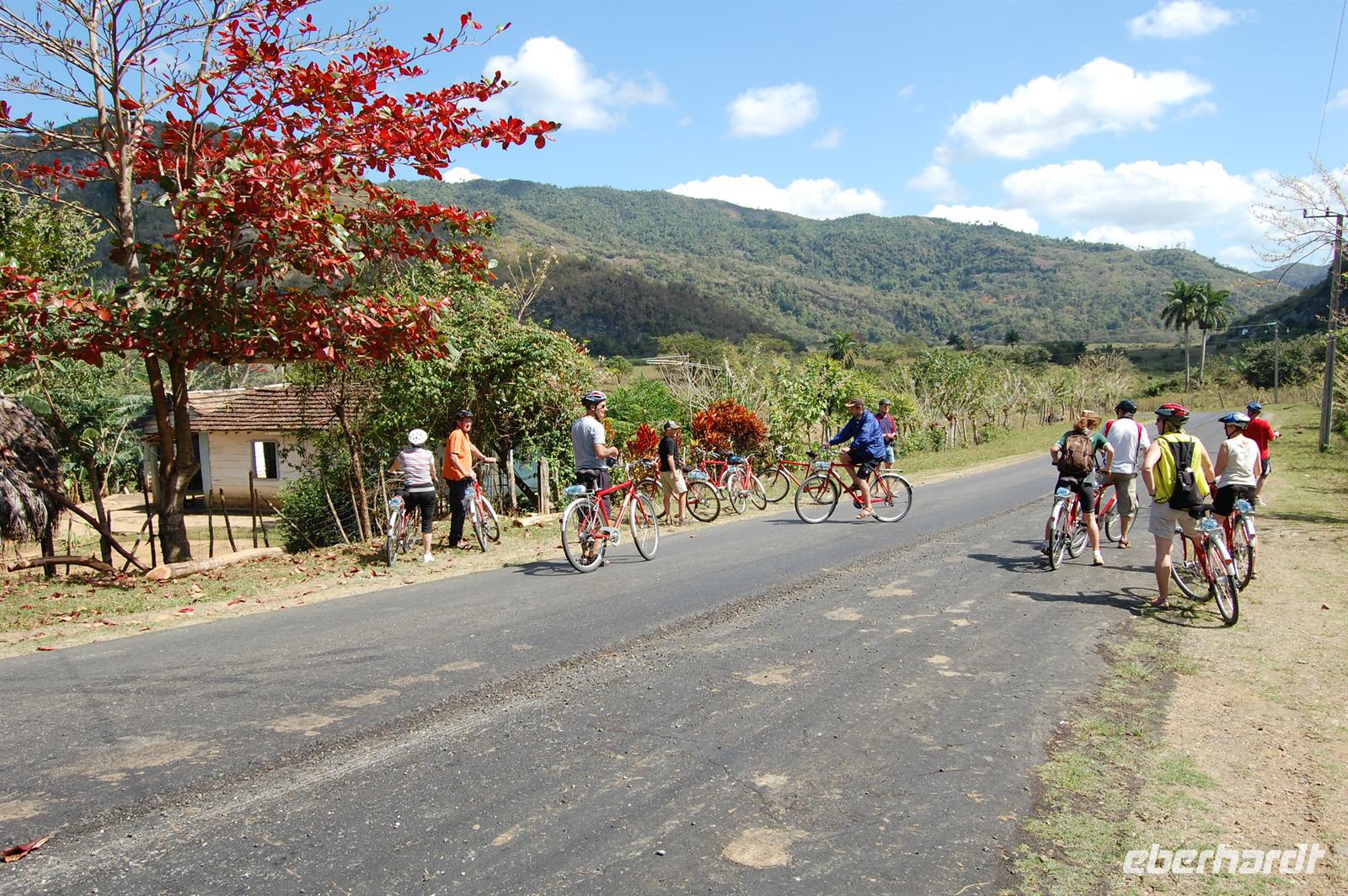 Nach dem Frühstück starten wir gleich mit den Rädern in Richtung Norden, vorbei an wunderschönen Mogoten nach Poerto Esperanza (Hafen der Hoffnung), einem kleinen Fischerdorf. Unterwegs besuchen wir eine Grundschule, denn wir haben alle kleine Geschenke für Kinder aus Deutschland mitgebracht.Bei der Übergabe der Schulmaterialien erfahren wir vom jungen Schuldirektor interessante Details des hervorragenden kubanischen Bildungssystems. Nachdem wir Poerto Esperanza erreicht haben erläutert uns Miguel bei einem Rundgang durch das Dorf sehr anschaulich das Leben der Kubaner. Neben der guten medizinischen Versorgung in der Poliklinik des Ortes und sehr stark subventionierten Medikamenten gibt es aber auch eine Bäckerei, einen Computer-Club und eine Beach-Bar, wo wir ein Picknick mit Sandwichs und kubanischen Früchten vorbereitet haben. Nun starten wir per Rad, um nach einigem Bergauf und Bergab am Nachmittag wieder unsere Unterkunft zu erreichen.