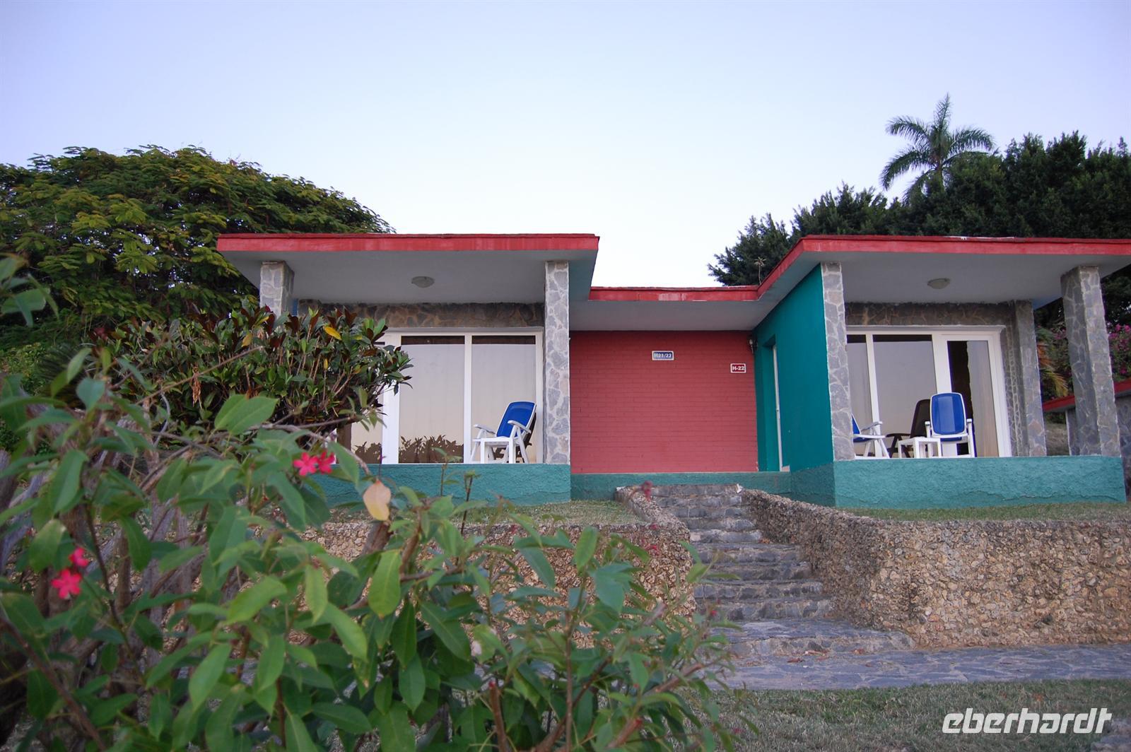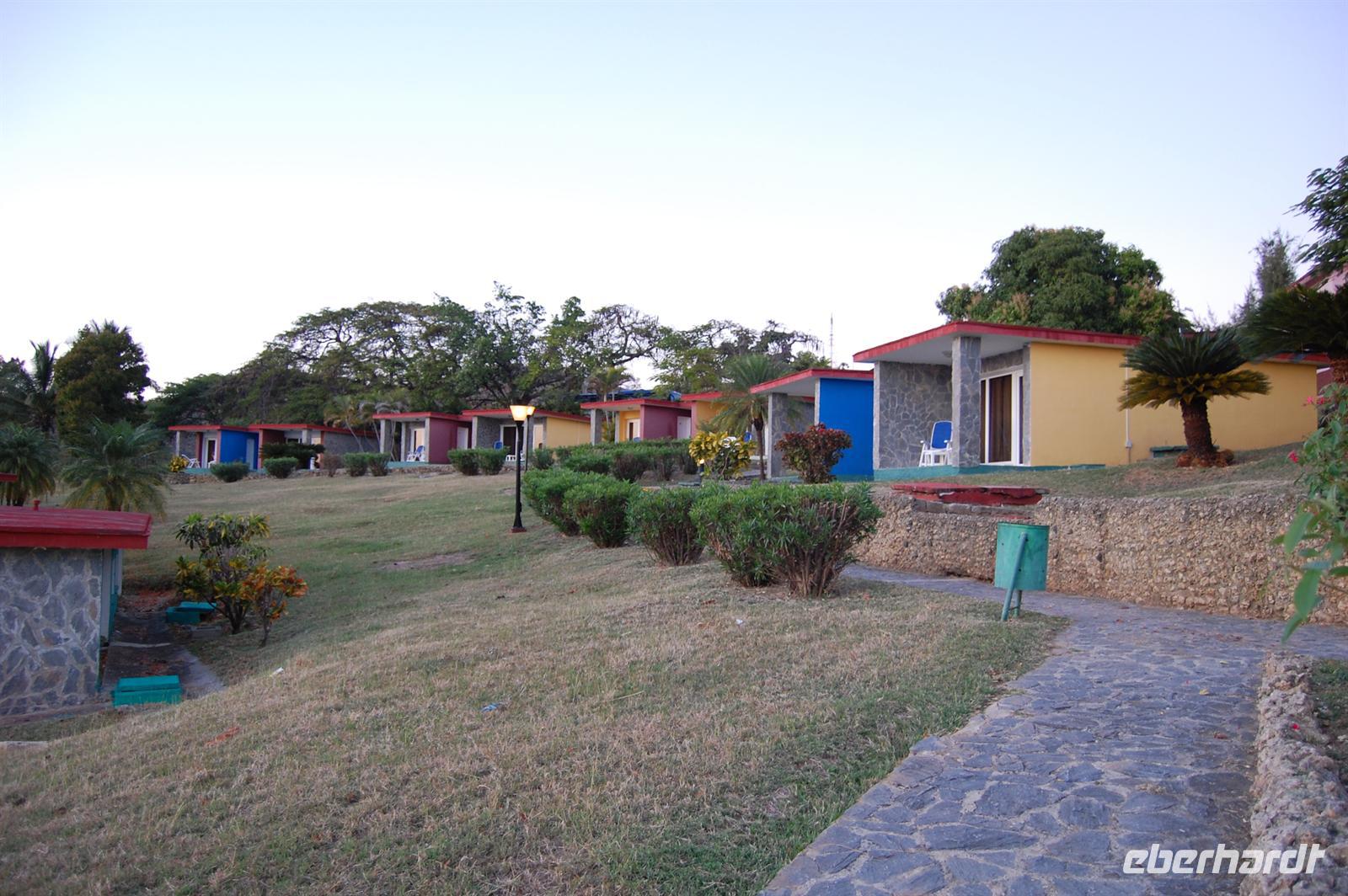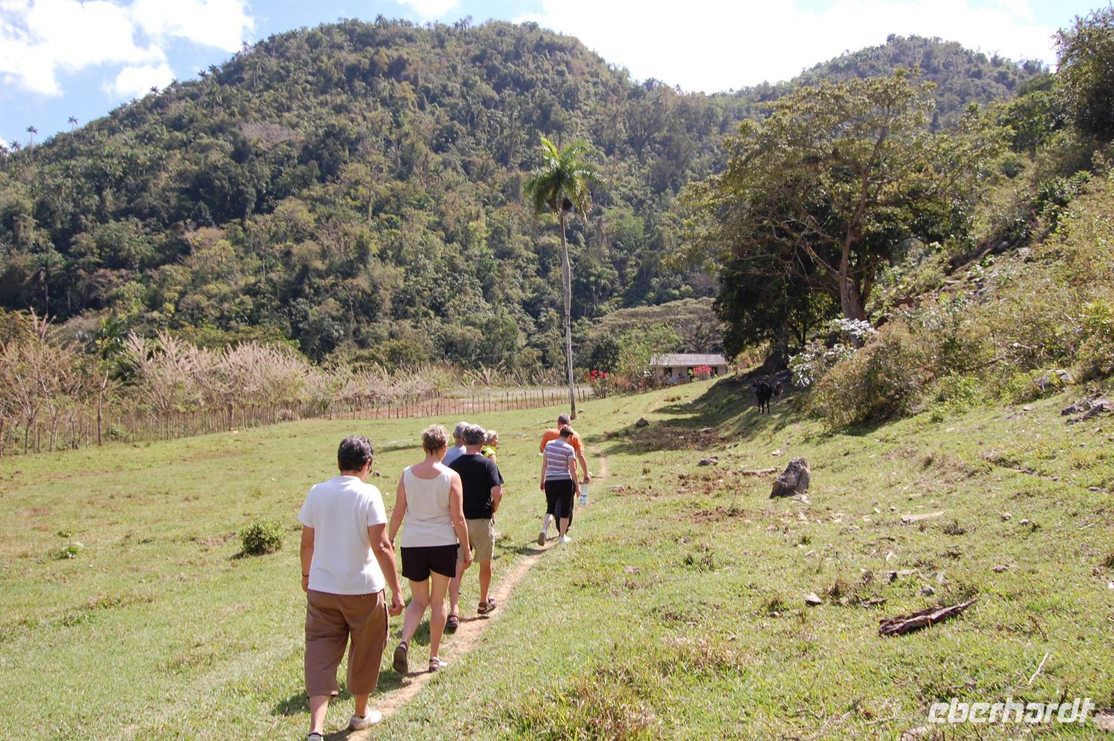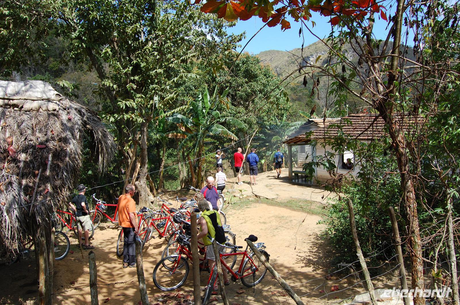 dem Land kennen. In einer einfachen aber sauberen Hütte leben die Eltern mit 2 Kindern zusammen. Obwohl es in der Küche nur ein offenes Feuer gibt, werden die Speisen schmackhaft zubereitet. Das Spanferkel wird im Garten gebraten. Dazu gibt es Maniok, Reis, verschiedene Früchte und Saft. Da die Zubereitung der Mahlzeit etwas länger dauert, unternehmen wir mit den Kindern der Familie eine Wanderung zu einem nahegelegenen Wasserfall, den einige für ein erfischendes Bad nutzen. Nach dem schmackhaften Mittagessen radeln wir weiter durch eine traumhafte Landschaft mit einer atemberaubenden Flora und Fauna. Nach einer endlos scheinenden Bergabfahrt gelangen wir schließlich zum Ziel unserer heutigen Radetappe, der Ortschaft Manicaragua. Hier verladen wir die Fahrräder in den Bus und legen die letzten Kilometer nach Santa Clara im Bus zurück. Am späten Nachmittag erreichen wir die Ferienanlage „Los Caneyes“, die nach den Ureinwohnern Kubas benannt wurde und sehr hübsch in diesem Stil gestaltet wurde.