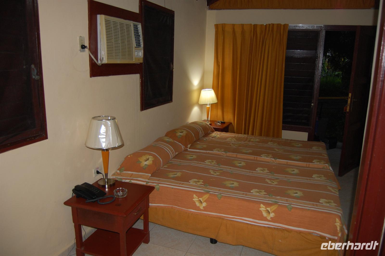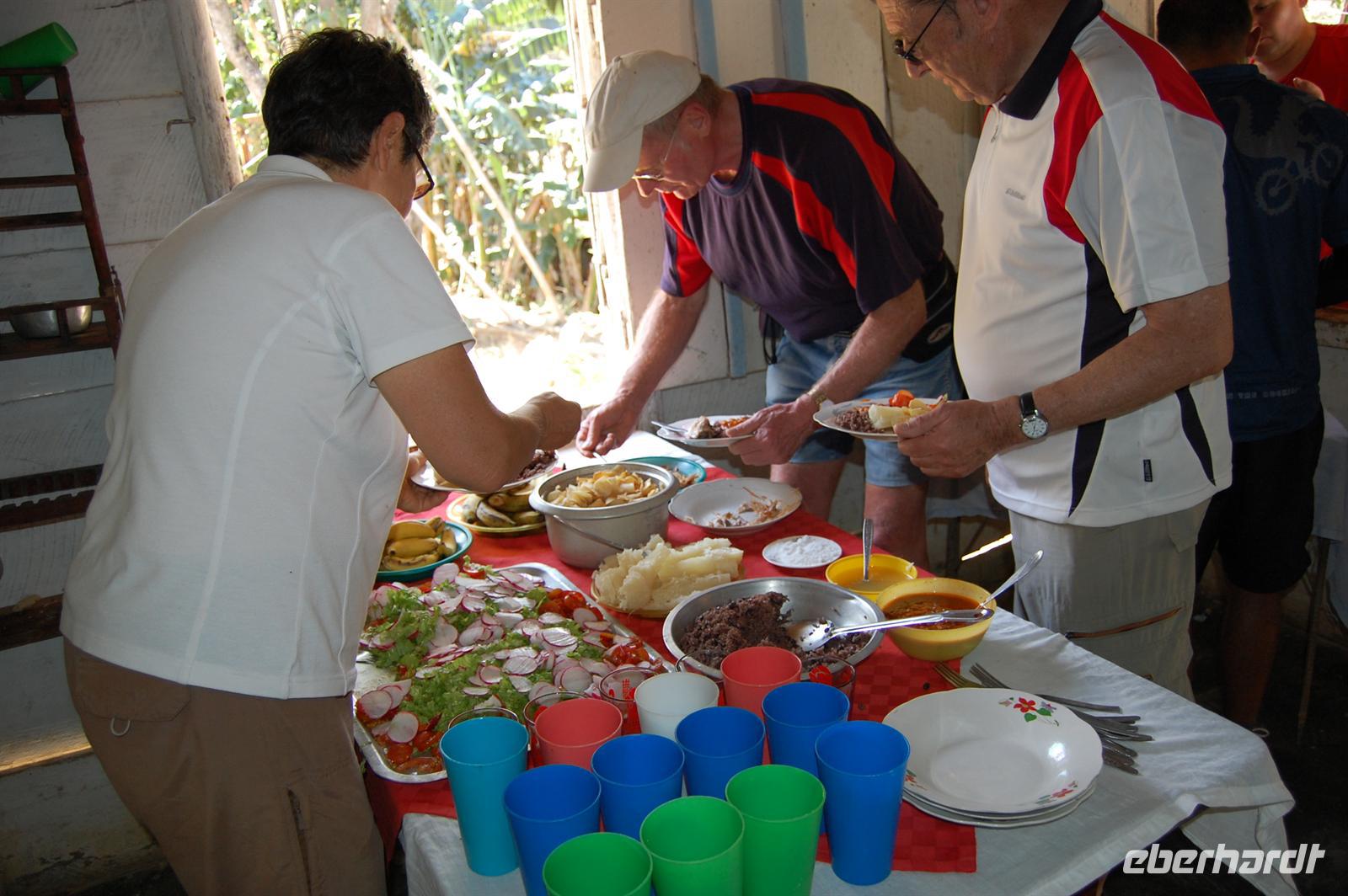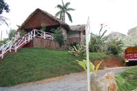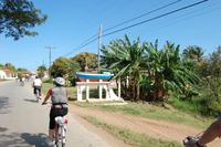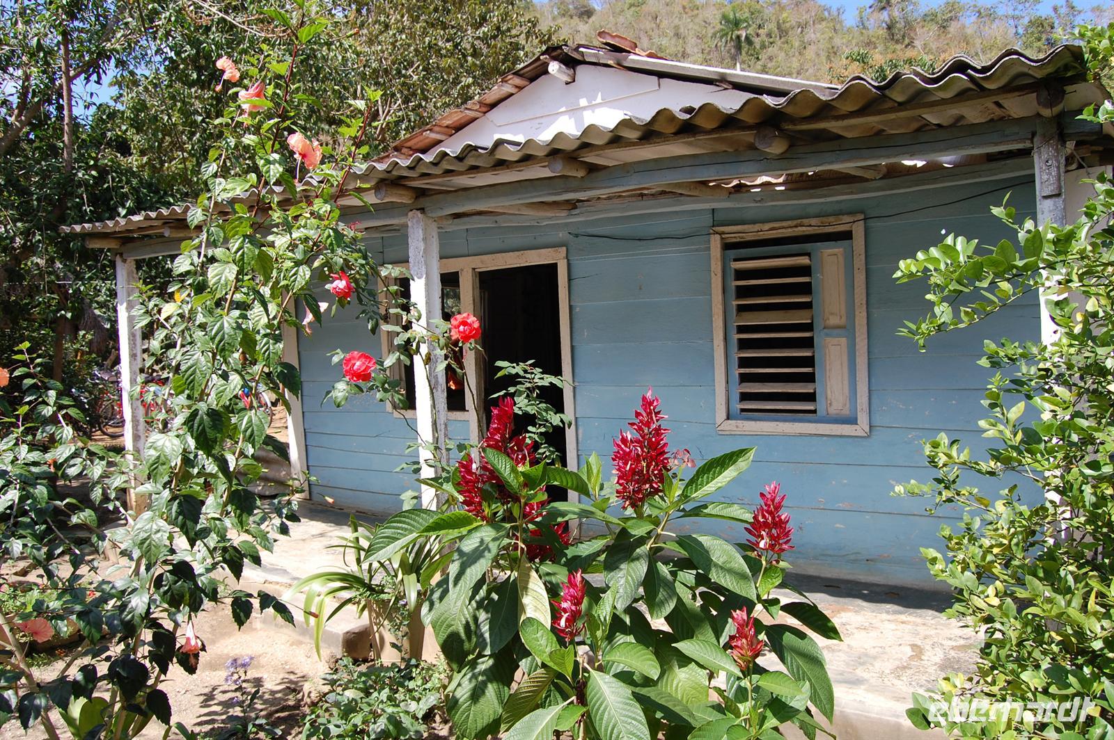 dem Land kennen. In einer einfachen aber sauberen Hütte leben die Eltern mit 2 Kindern zusammen. Obwohl es in der Küche nur ein offenes Feuer gibt, werden die Speisen schmackhaft zubereitet. Das Spanferkel wird im Garten gebraten. Dazu gibt es Maniok, Reis, verschiedene Früchte und Saft. Da die Zubereitung der Mahlzeit etwas länger dauert, unternehmen wir mit den Kindern der Familie eine Wanderung zu einem nahegelegenen Wasserfall, den einige für ein erfischendes Bad nutzen. Nach dem schmackhaften Mittagessen radeln wir weiter durch eine traumhafte Landschaft mit einer atemberaubenden Flora und Fauna. Nach einer endlos scheinenden Bergabfahrt gelangen wir schließlich zum Ziel unserer heutigen Radetappe, der Ortschaft Manicaragua. Hier verladen wir die Fahrräder in den Bus und legen die letzten Kilometer nach Santa Clara im Bus zurück. Am späten Nachmittag erreichen wir die Ferienanlage „Los Caneyes“, die nach den Ureinwohnern Kubas benannt wurde und sehr hübsch in diesem Stil gestaltet wurde.
