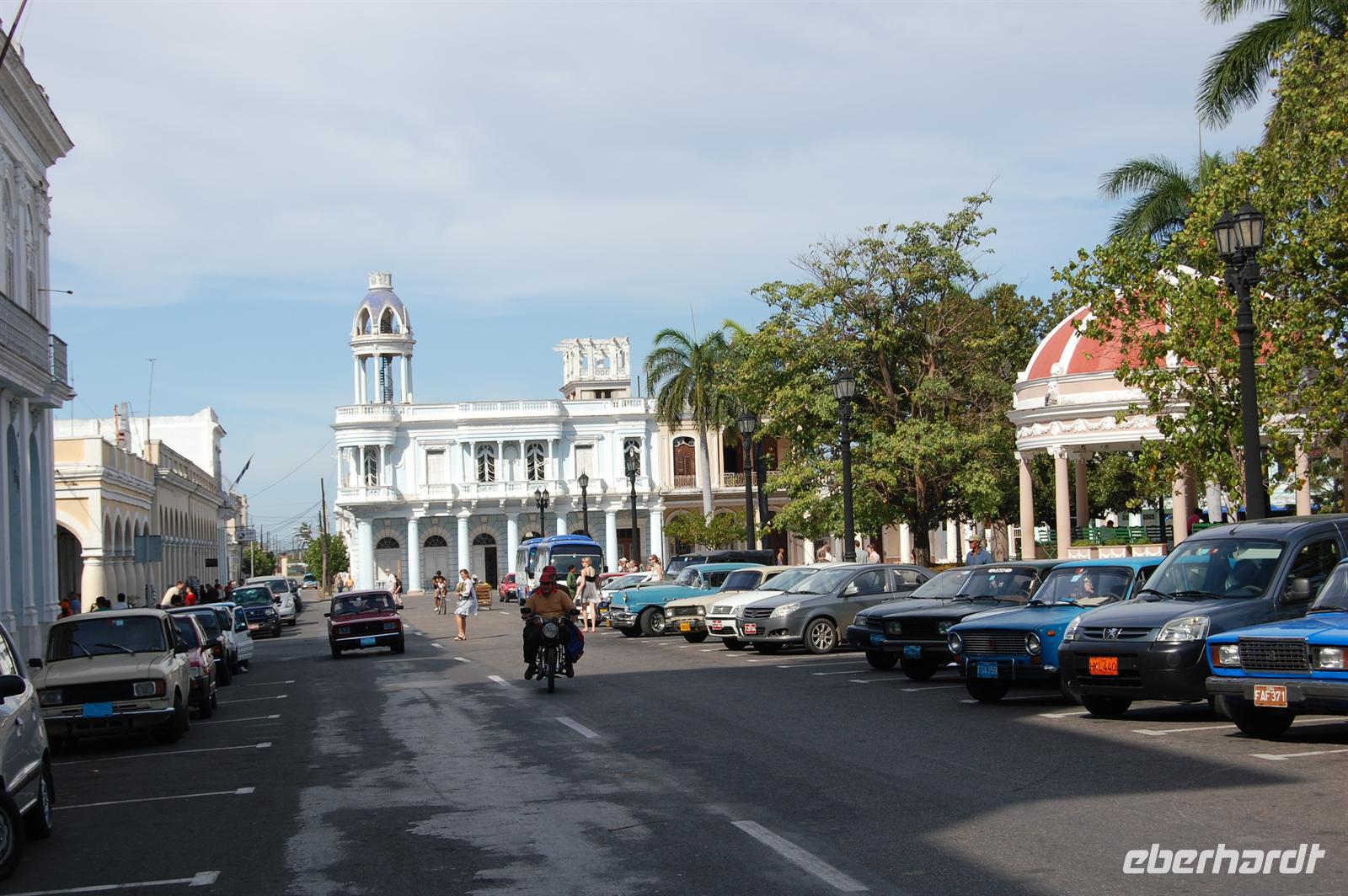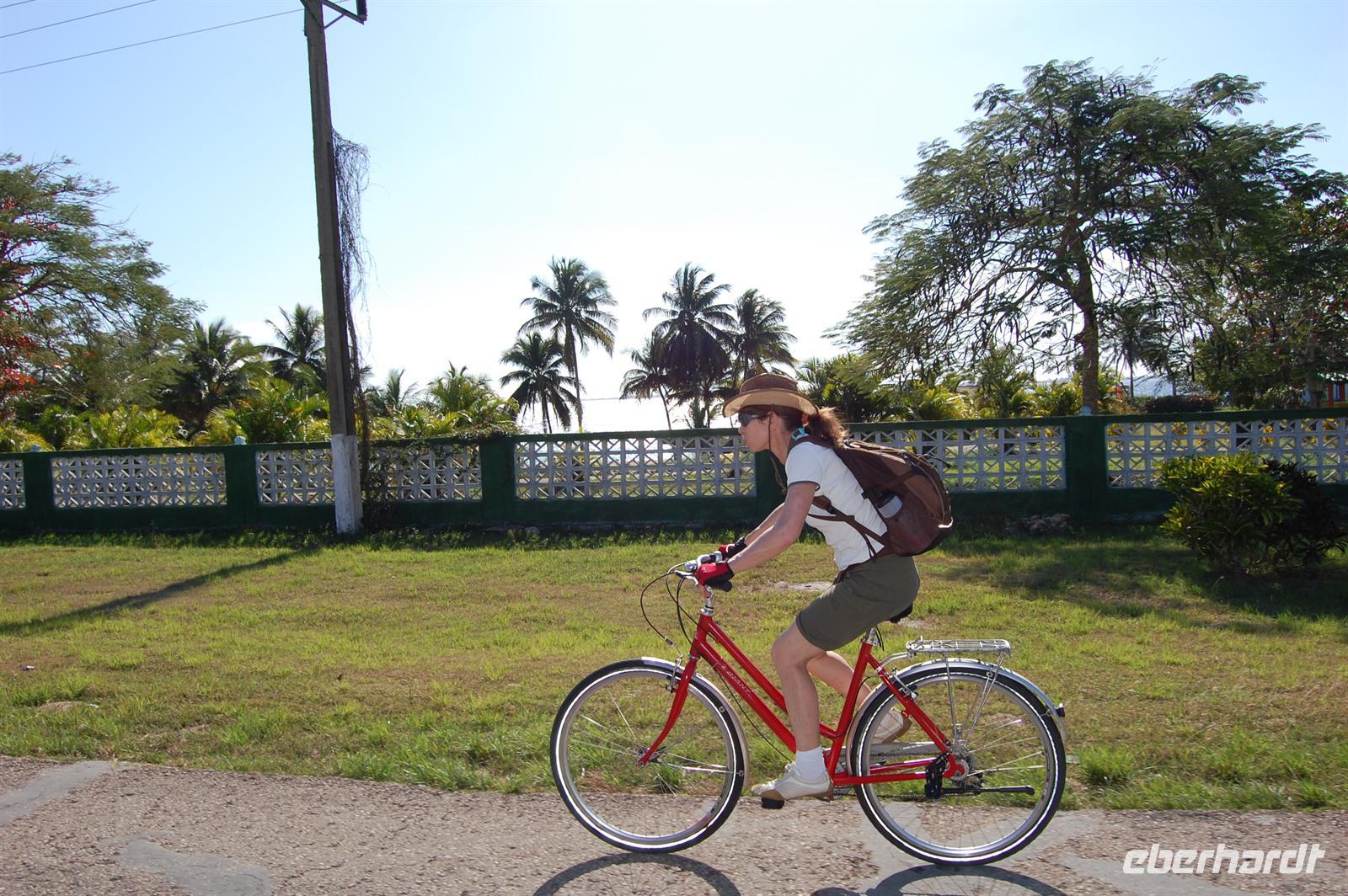 Auch heute erwartet uns ein sehr abwechslungsreiches (Rad-)Programm. Nach dem Frühstück fahren wir mit dem Bus ins Zentrum von Cienfuegos. Miguel geht mit uns durch die Fußgängerpassage und erläutert uns beim Besuch eines „CUC-Ladens“ und eines Geschäftes, in dem kubanische Peso als Zahlungsmittel gelten, den Unterschied im Warenangebot. Am Marti-Park, dem prunkvollen Herzen Cienfuegos, angekommen, lauschen wir den Erläuterungen Miguels über den Glanz vergangener Tage und haben dann Gelegenheit, die Fußgängerzonen der saubersten Stadt Kubas zu erkunden. Im Anschluss fahren wir zum Botanischen Garten,