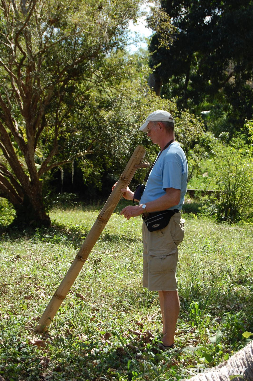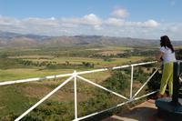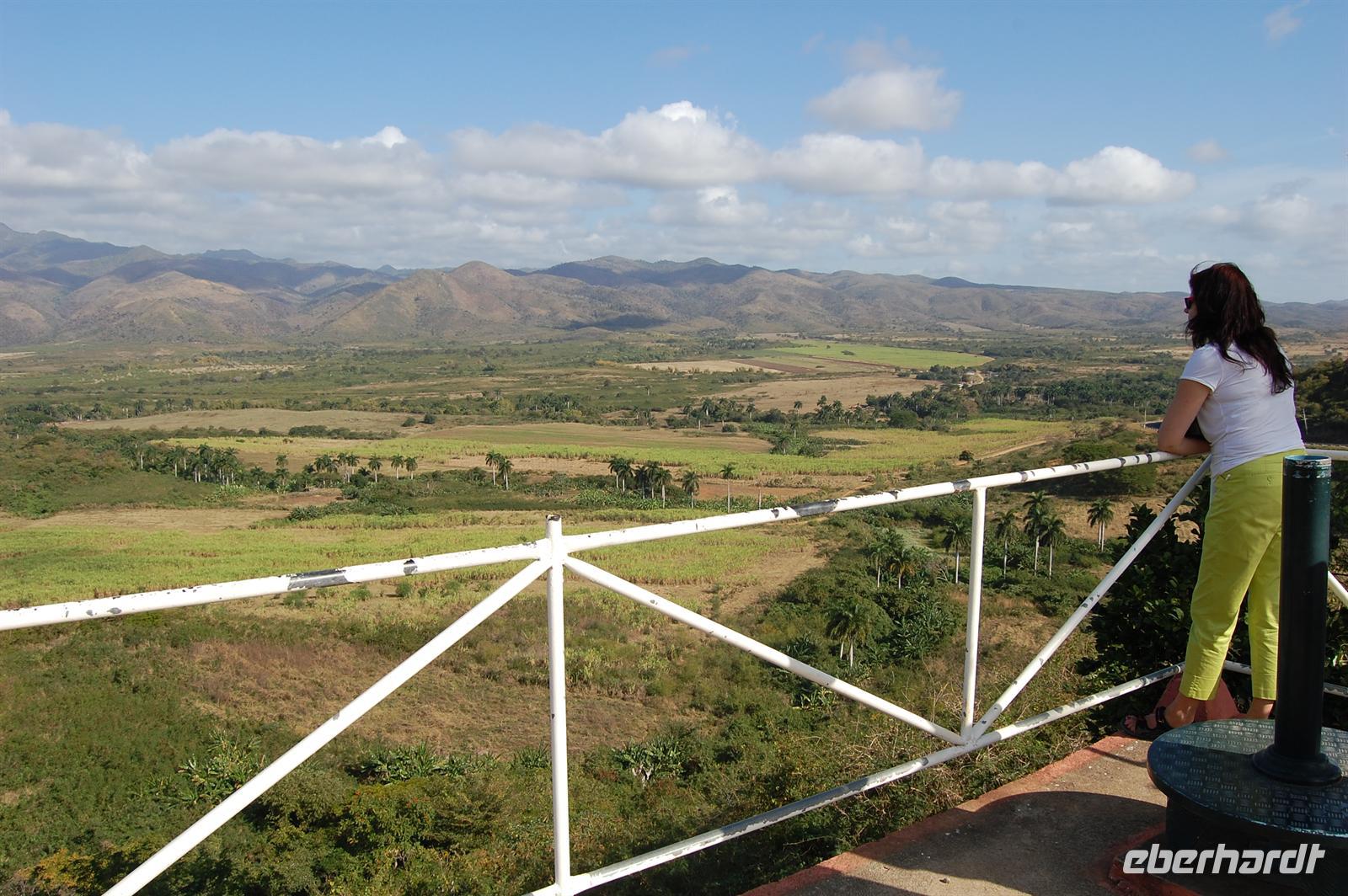 Heute starten wir mit dem Rad in Richtung Santa Spiritus ins Tal der Zuckerrohrmühlen „Valle de los Ingeniors“. Am Eingang des Tales besuchen wir einen Aussichtspunkt, der schöne Panoramabilder vom Tal zulässt. Nach einer Fahrt bergab erreichen wir das Örtchen Condado Iznaga, wo wir eine luxuriöse Finca mit einer Zuckerrohrpresse besuchen. Wir werden an eine Presse geführt, die durch unsere Muskelkraft angetrieben wird. Wir pressen Zuckerrohrstangen mehrmals aus undlangsam füllt sich ein Eimerchen mit Zuckerrohrsaft, der mit Eis gekühlt und Rum versetzt ein leckeres Getränk für uns ergibt. Anschließend besuchen wir den 52 m hohen Turm, der früher zur Beobachtung der Sklavenarbeit in den Zuckerrohrfeldern diente. Für ein Picknick zum Mittag haben wir Sandwichs und frisches Obst besorgt und radeln bis zu einer Finca an einer entlegenen Bahnstation. Bei den Klängen einer kubanischen Musikgruppe genießen wir die kurze Mahlzeit und den frischen Ananassaft. Anschließend bringt uns der Bus zurück nach Trinidad, wo Miguel mit uns einen kleinen Stadtbummel durch die „Hochburg der