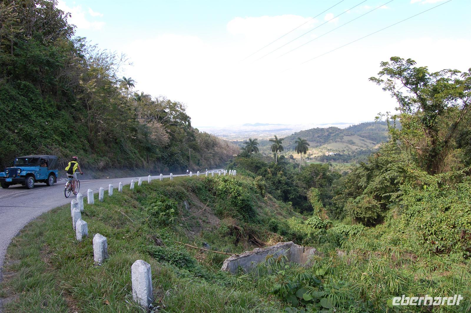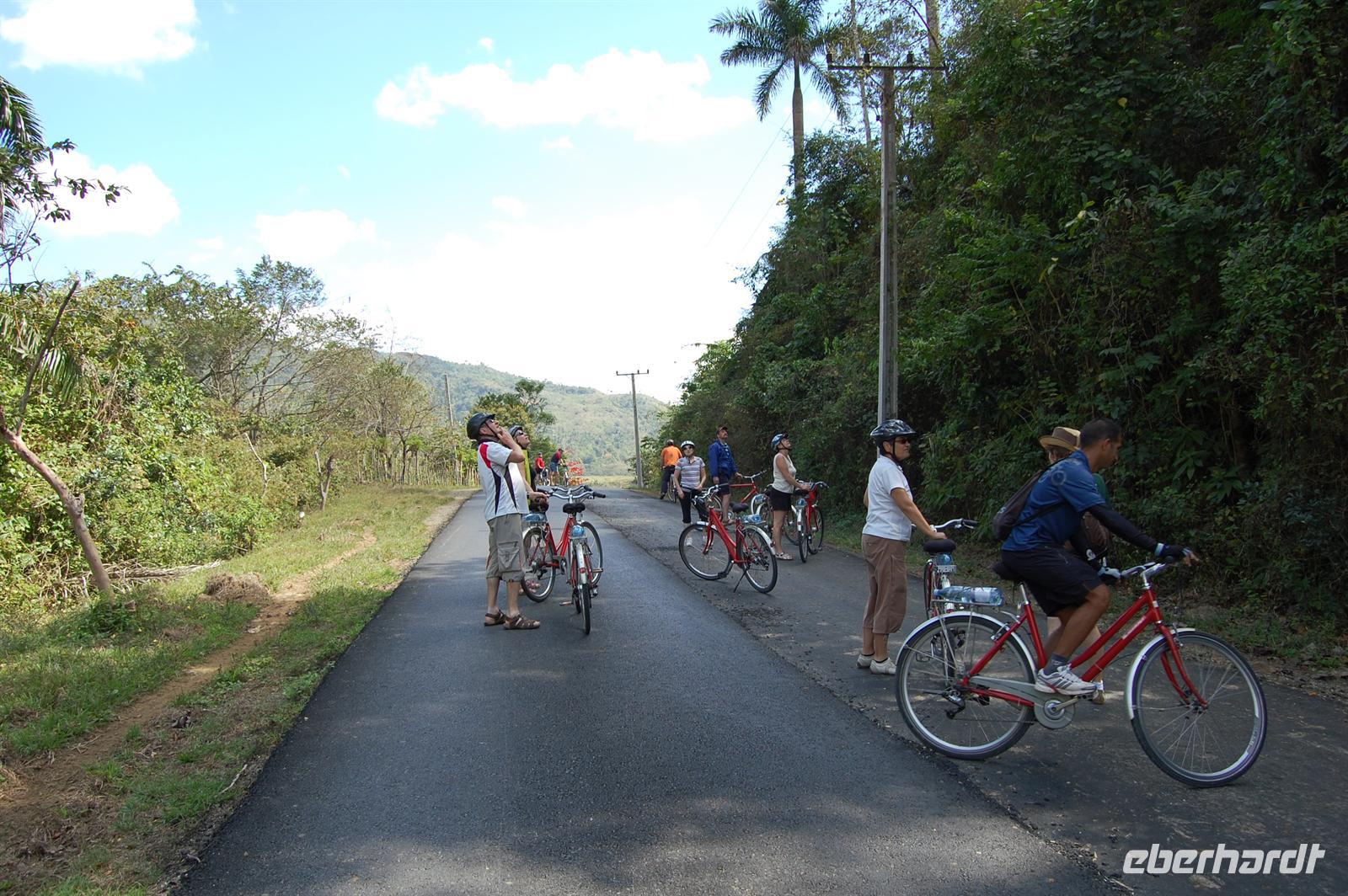 Heute erwartet uns das Bergabenteuer, eine wunderschöne Etappe per Rad durch die Berge der Sierra del Escambray. Gestärkt durch ein gutes Frühstück, starten wir mit dem Bus. Wir fahren direkt in das Gebirge, im ersten Gang geht es steil bergauf . In 770 m Höhe angekommen, genießen wir das herrliche Panorama von einer Aussichtsplattform. Wir nehmen Abschied von der karibischen See und Trinidad. Doch es geht noch höher in die Berge, bis wir schließlich den Nationalpark „Topes de Collantes“ und den gleichnamigen Luftkurort der Kubaner, erreichen, der mit dem „Kurhotel“ auf dem Gipfel des Berges protzt. Nach einem kurzen Rundgang durch das Verwaltungsgebäude fahren noch wenige Kilometer mit dem Bus, bis wir ein kleines Restaurant mit tollen Ausblick auf die Seen-Kette des Hanabanilla-Stausees erreichen. Nun geht es per Rad über kleinere Anstiege und viele Abfahrten zu einer Familie, bei der Miguel am Vortag zum Mittag ein Spanferkel bestellt hatte. Wir lernen bei der Familie das wirkliche Leben auf