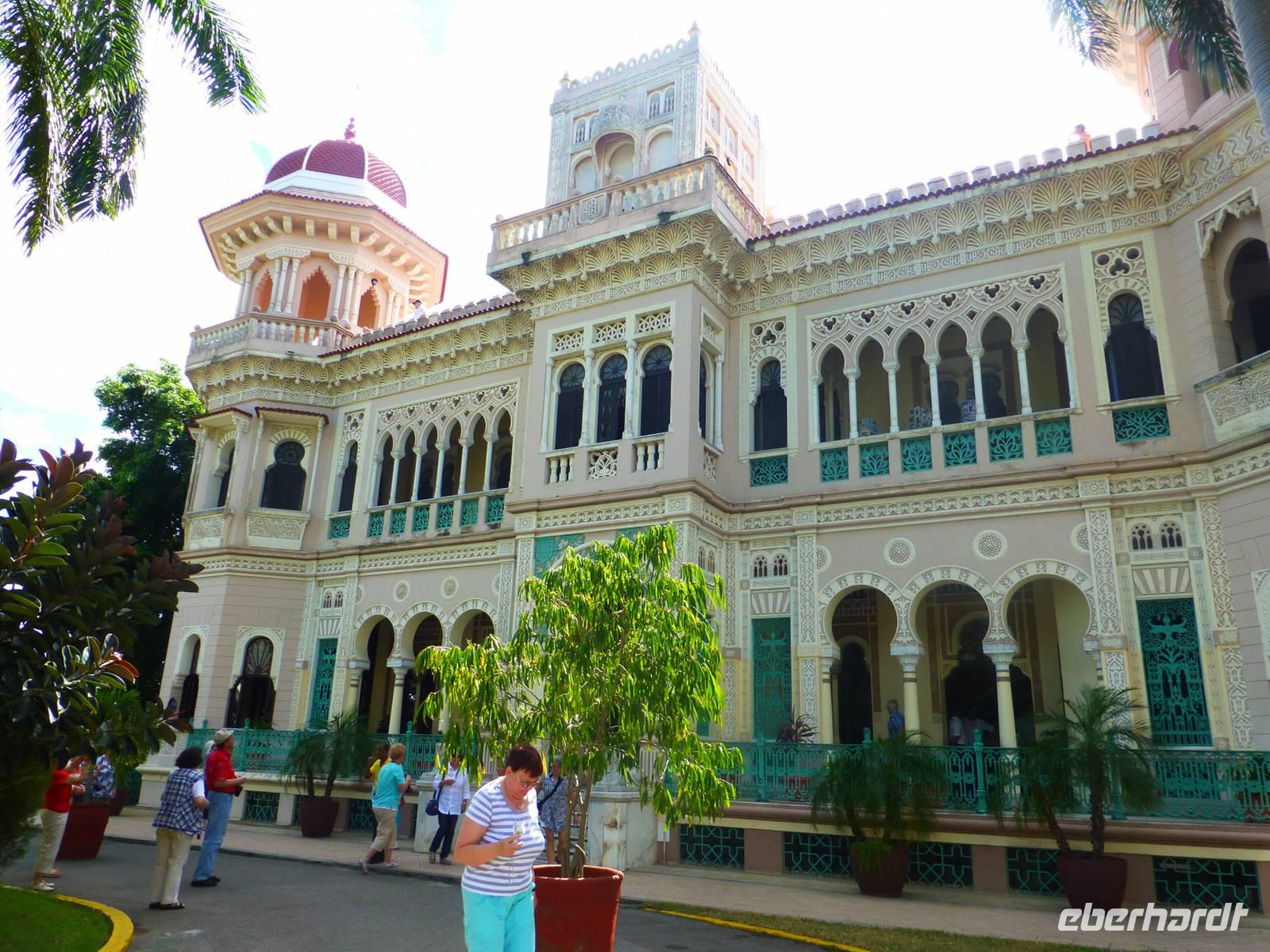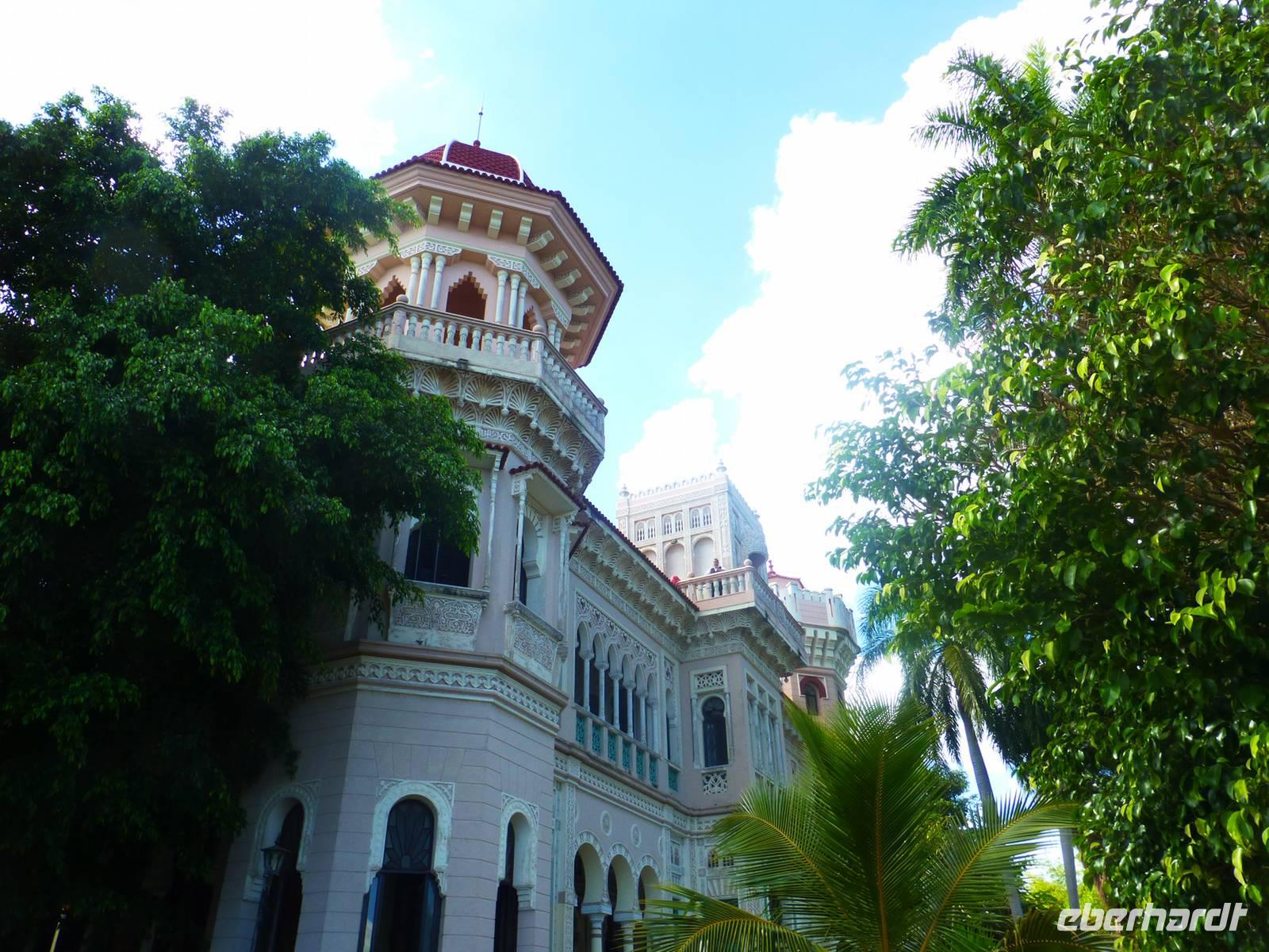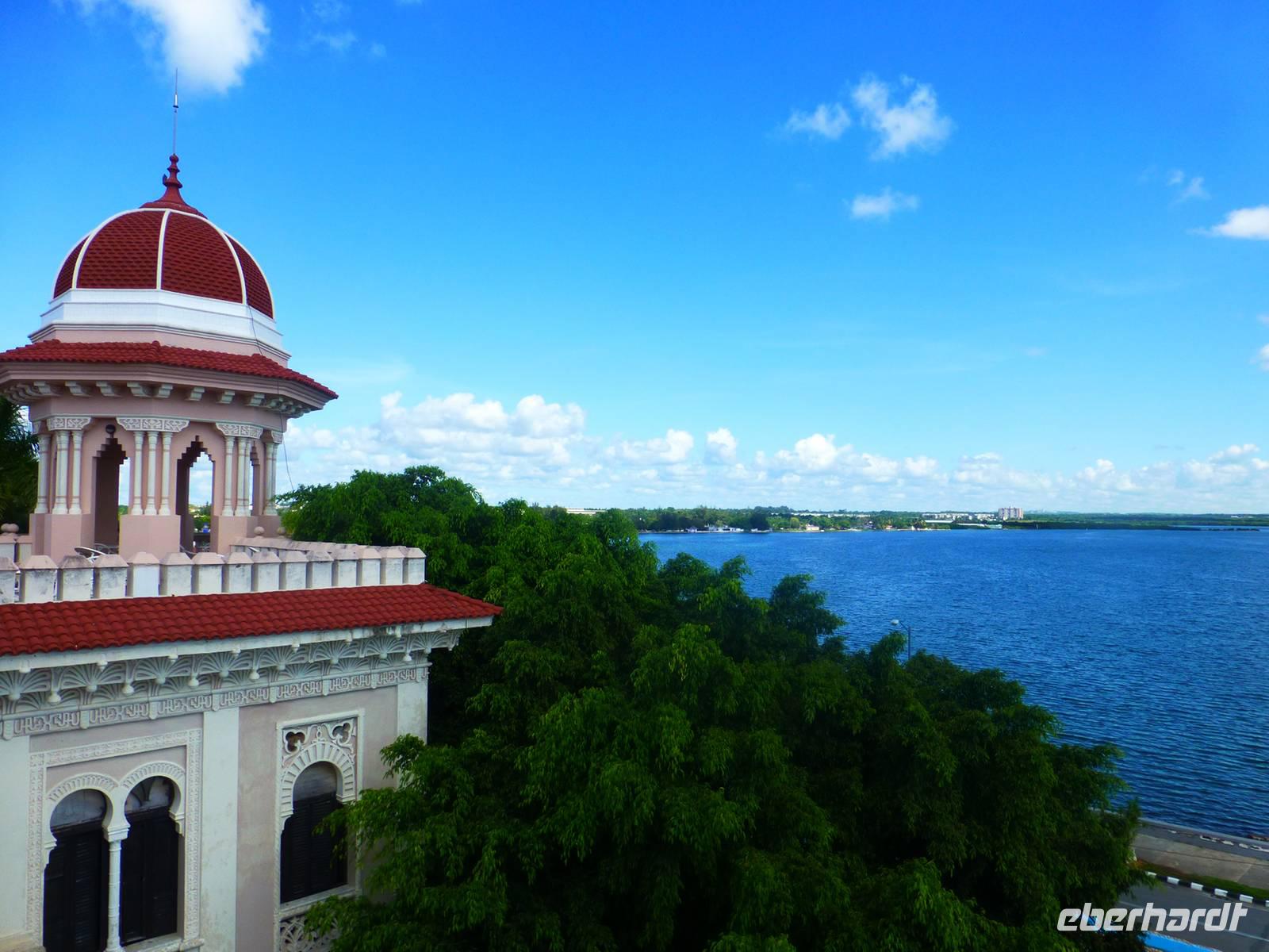 Wir fuhren bis zum Ende der Stadt, zum Ende des Paseo del Prado, der direkt auf die charmant-karibische Halbinsel Punta Gorda führt. Der hier gelegene Palacio del Valle zählt mit seinen gotischen, venezianischen und maurischen Motiven zu den architektonischen Schmuckstücken von Cienfuegos und bietet einen wunderbaren Ausblick über die Bucht der Stadt. Ganz oben auf der Terrasse wartet eine Überraschung auf uns von Eberhardt: eine Cuba Libre als Erfrischung und einen, wie schon gesagt, unvergleichbaren Ausblick auf die Bucht von Cienfuegos.