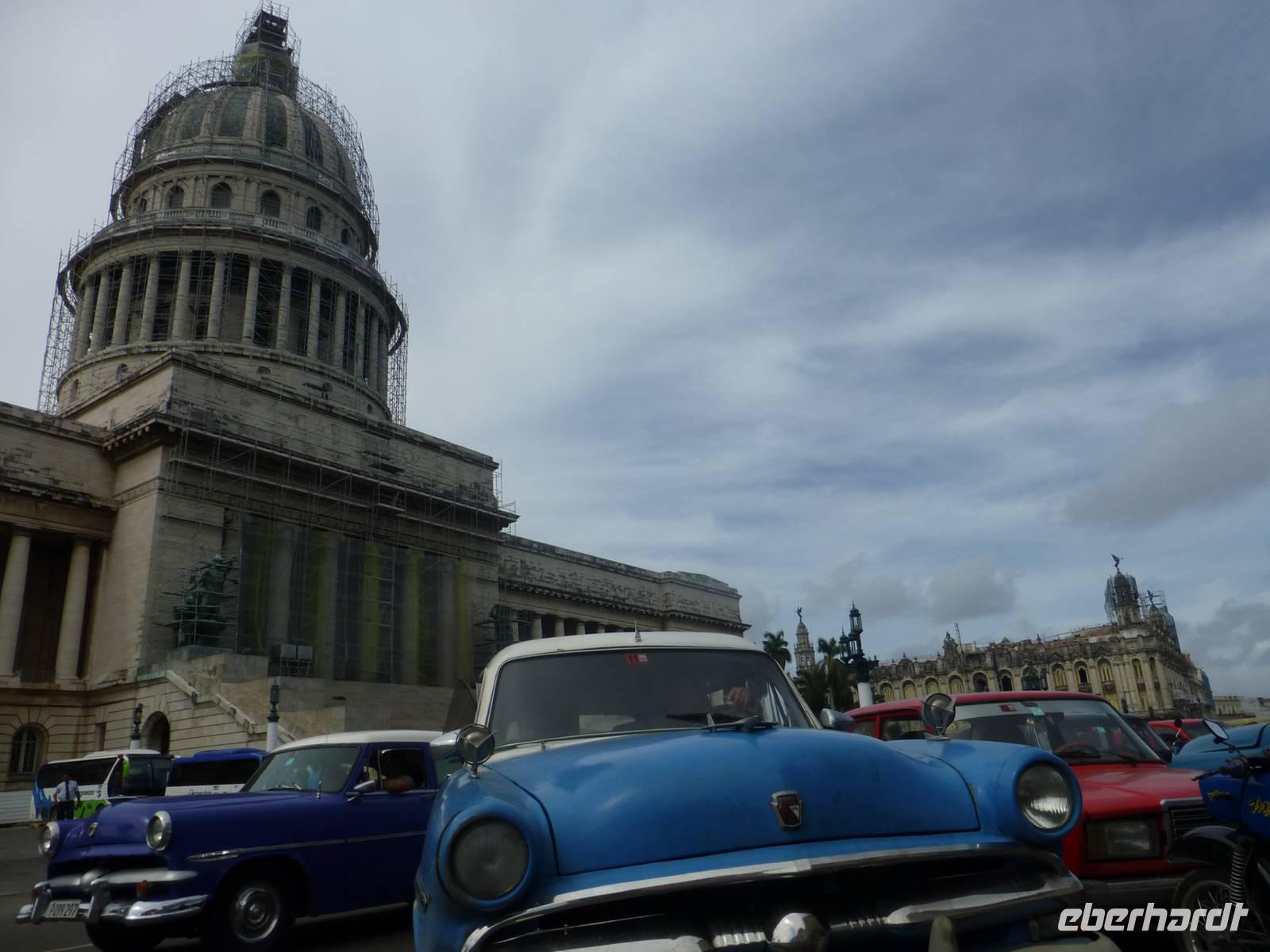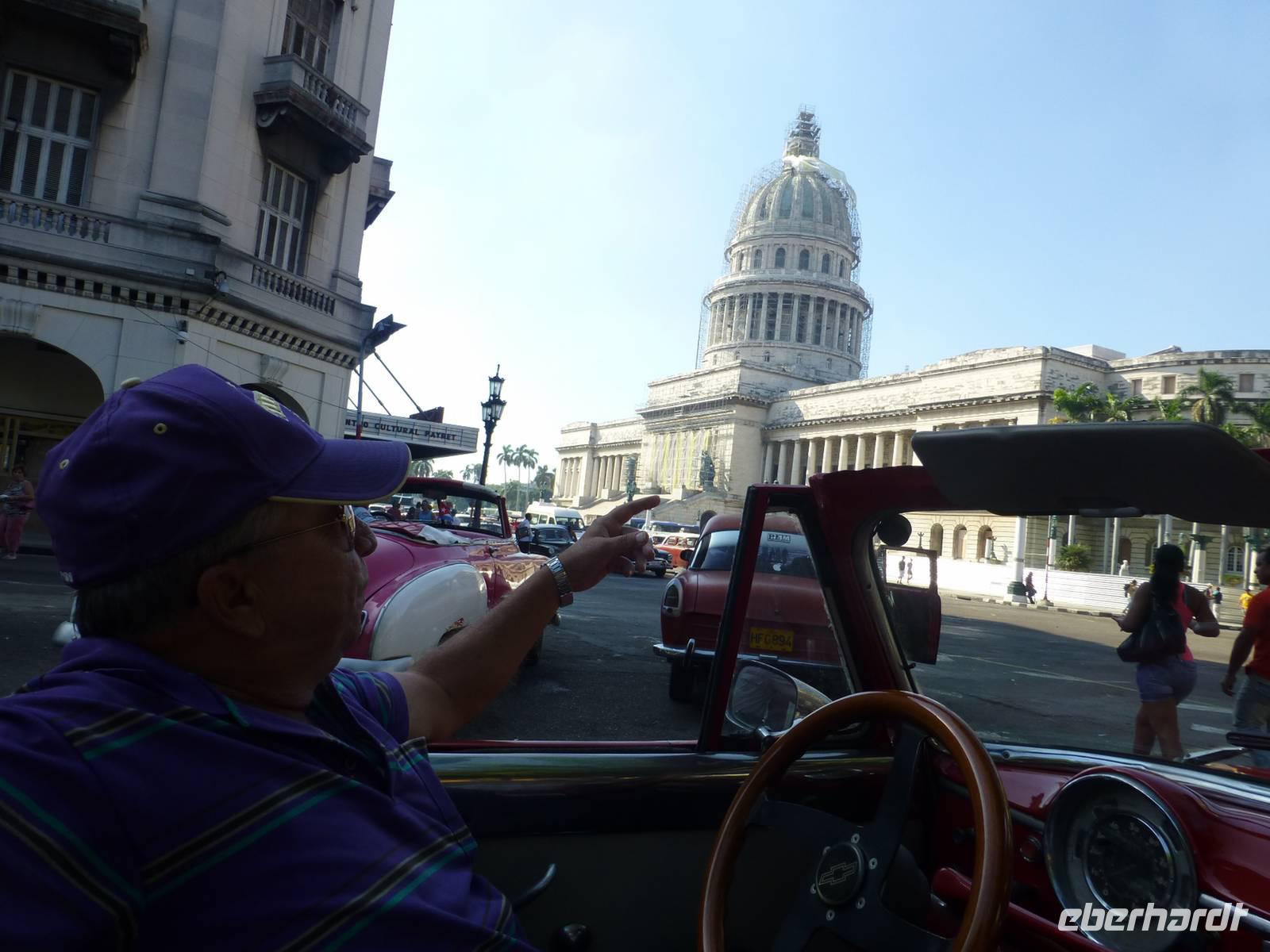 Wir fahren am Universitätsviertel vorbei und an den verschiedenen Krankenhäusern wo die 89 berühmten Stufen bis zum Alma Mater Denkmal ist. Die Allee oder Bundestraße endet an der berühmten Malecon Promenade, mehr als sieben Kilometer lang und nur 150 Kilometer entfernt von Miami. Unser nächster Stopp wird das Capitolio sein, auch eine Baustelle. Das Capitolio hier erinnert uns an das von Washington, aber dieses hier ist sogar höher.