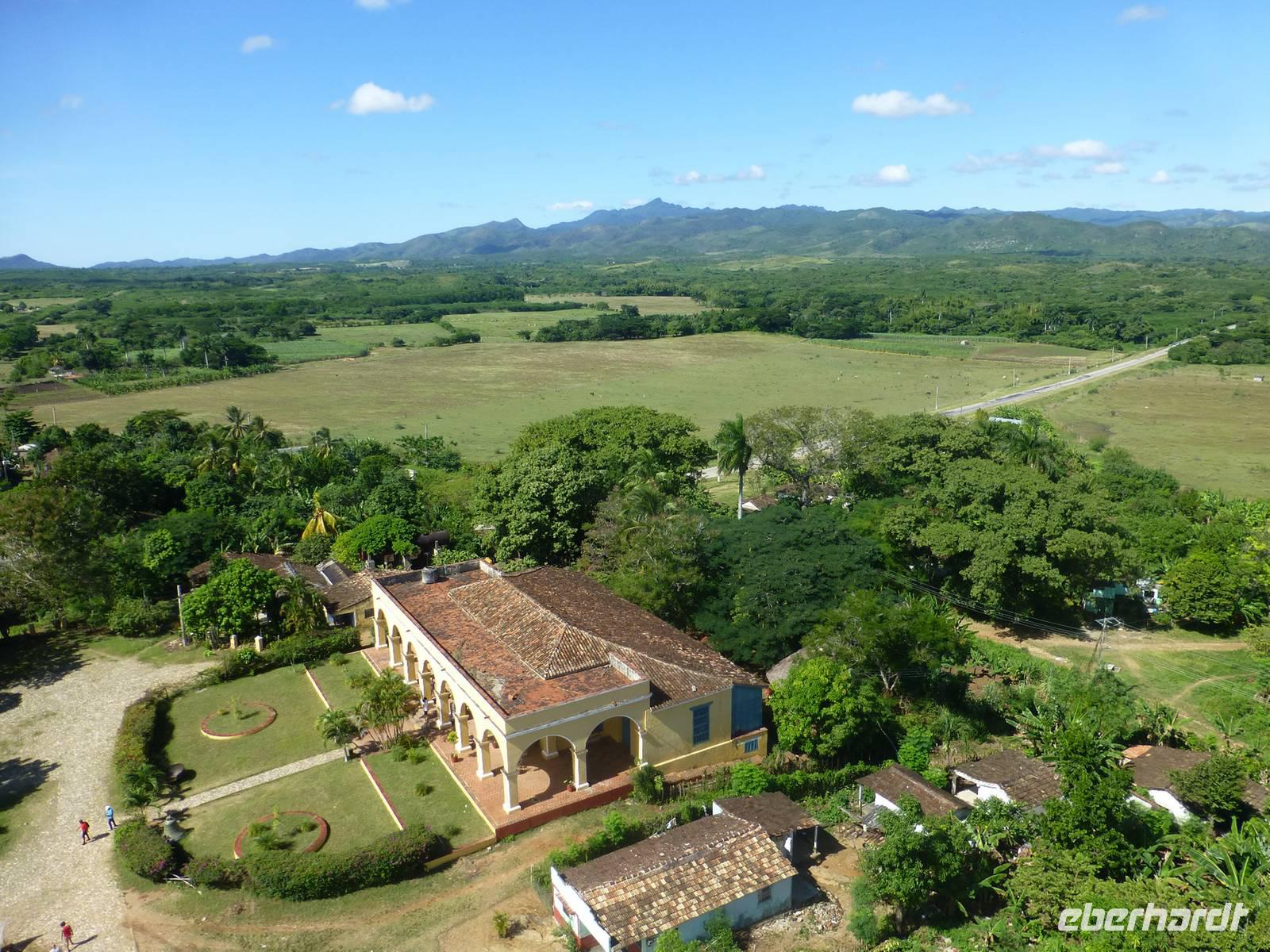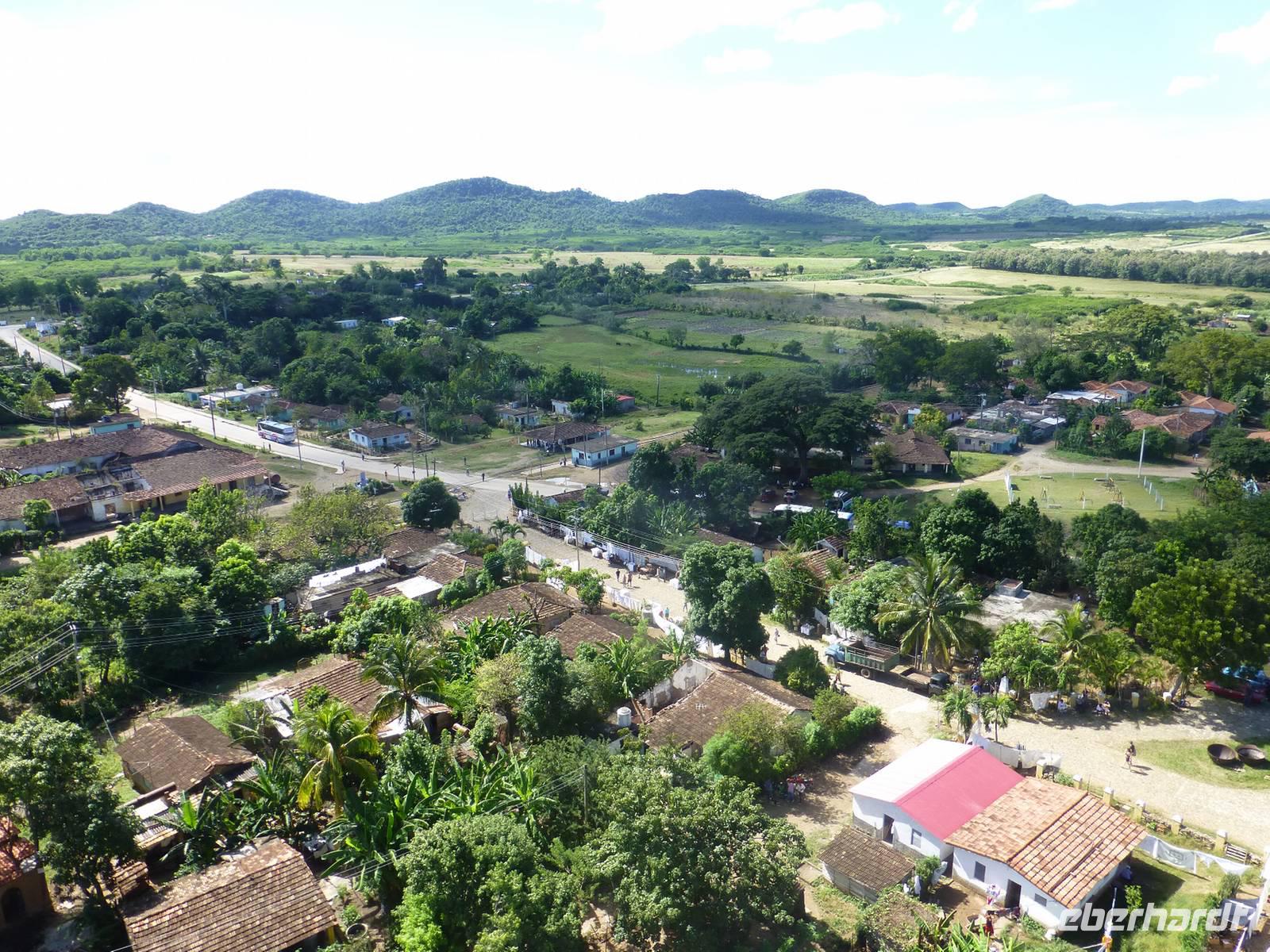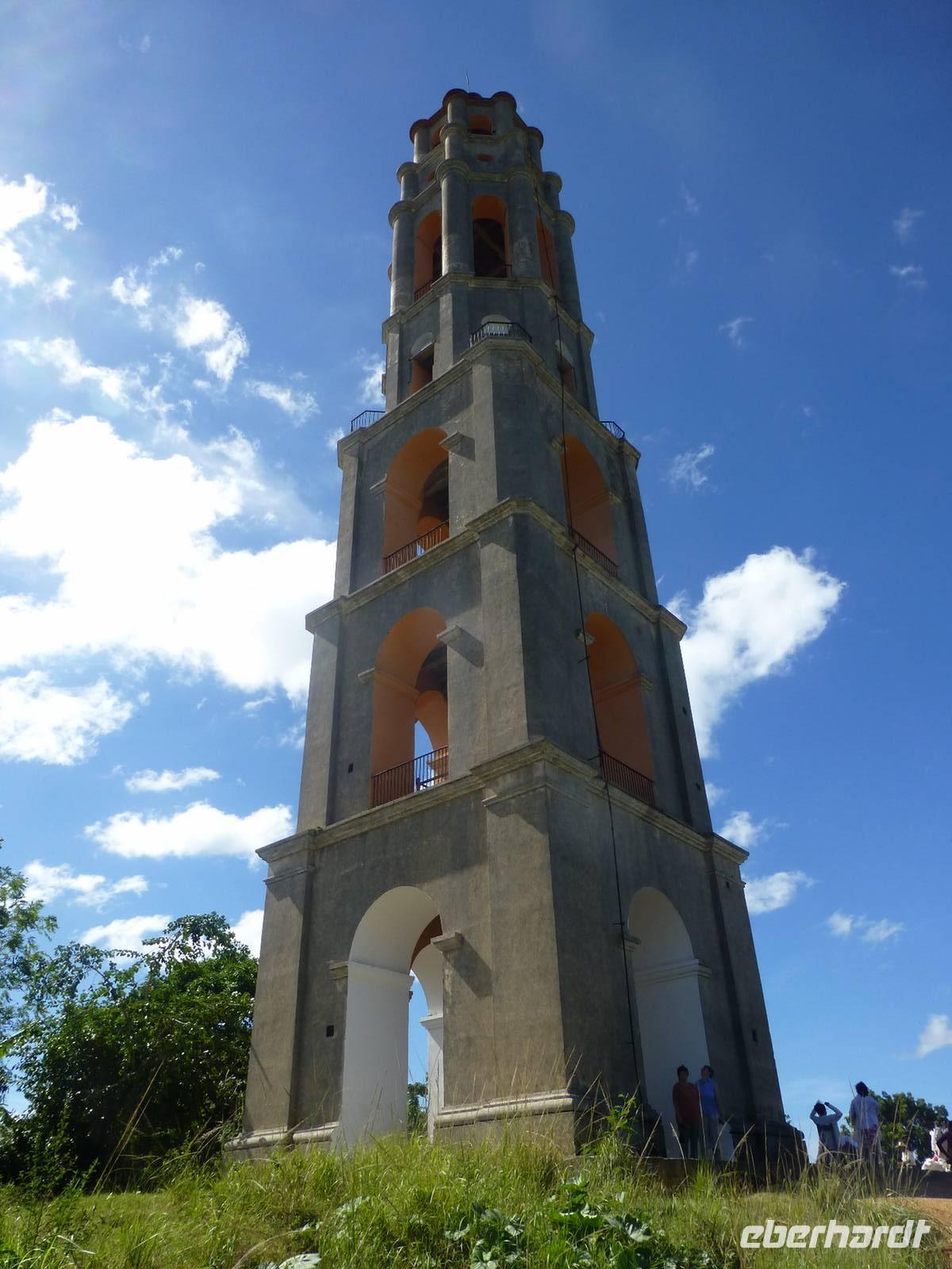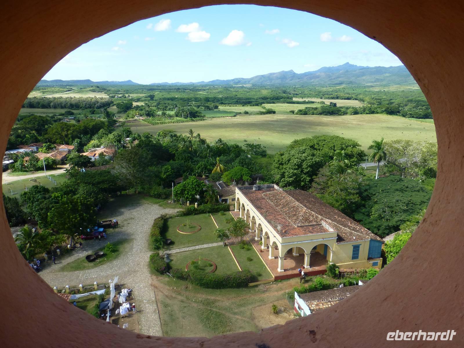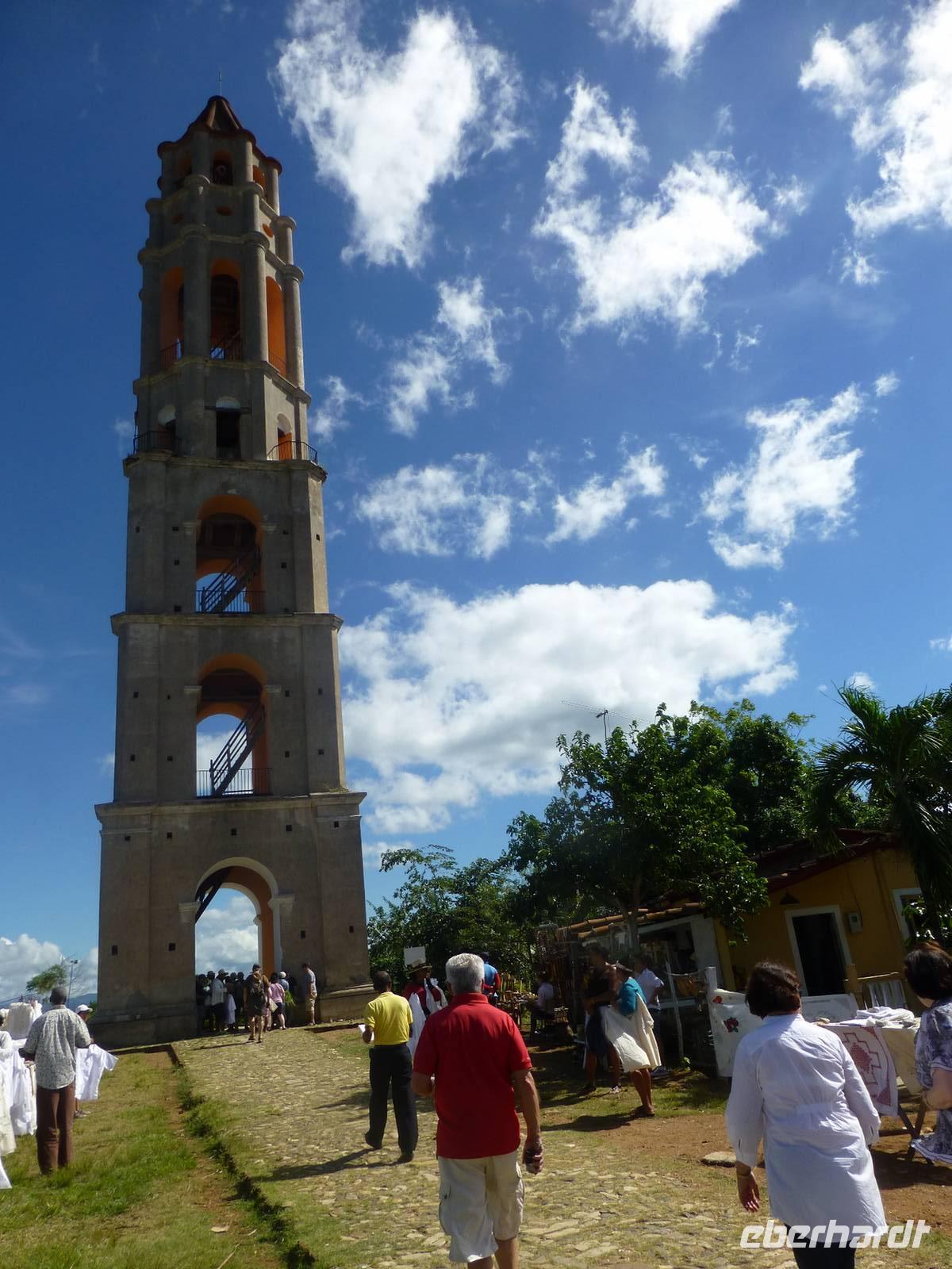 Wir reisten nach Trinidad, die Stadt wurde im Jahr 1514 von Diego Velazquez als dritte Siedlung auf Kuba gegründet. Aber bevor wir Trinidad besuchen, fuhren wir durch das Tal der Zuckerfabriken, „Valle de los Ingenios", wo wir die „Manaca Iznaga" besuchten, eine ehemalige Zuckerrohrfabrik. Die einst sehr reiche Zuckerrohr-Plantage wird von einem 45- Meter hohen Iznaga-Turm überragt. Besonders interessant ist dieser Turm mit 137 Stufen, die wir hinauf steigen um das Zuckerrohrtal zu bestaunen. Der Glockenturm diente in erster Linie zur Überwachung der umliegenden Zuckerrohrplantagen.