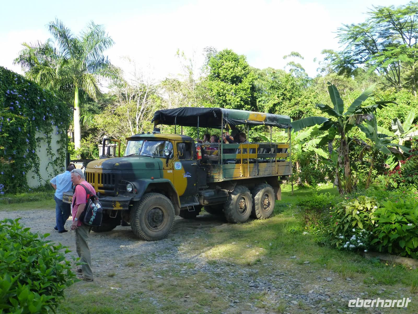 Gegen Mittag erreichten wir das Restaurant „La Gallega", wo uns ein kreolisches Mittagsessen erwartete. Auf dem Rückweg machten wir einen kleinen Stopp, mitten auf der Straße, wo ein Souvenir stand war. Hier konnte man sich ein Coco schneiden lassen um Wasser zu trinken. Manchmal findet man in nur einem Coco fast einen Liter Wasser. Lecker und ganz gut für die Nieren. Am Nachmittag, gegen 15 Uhr besuchten wir eine alte Kaffee-Plantage und dessen Museum, in dem wir auch eine Tasse Kaffee genossen.