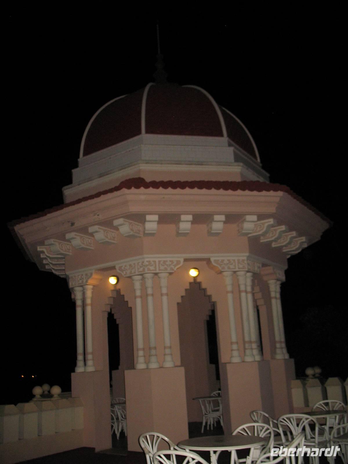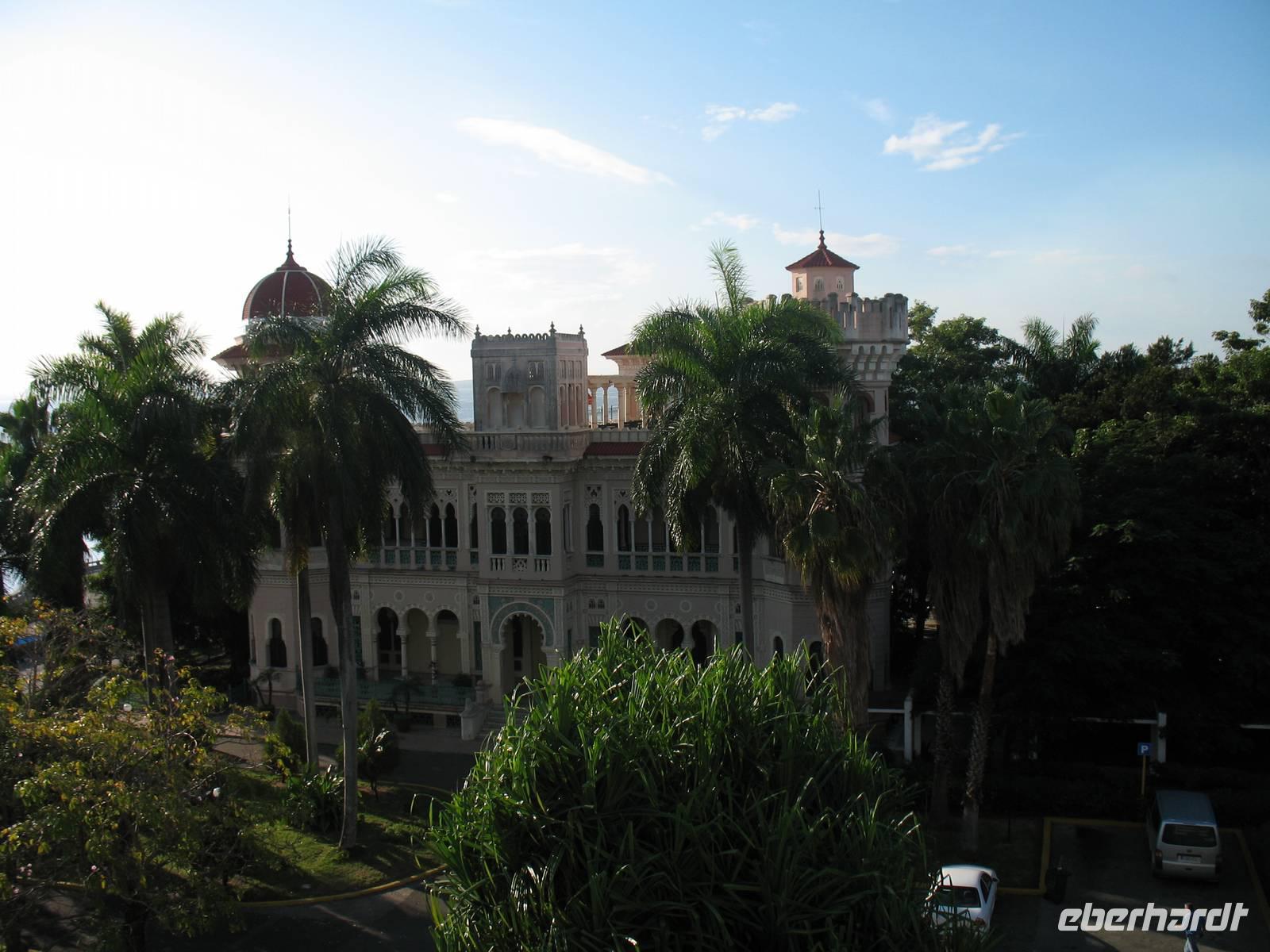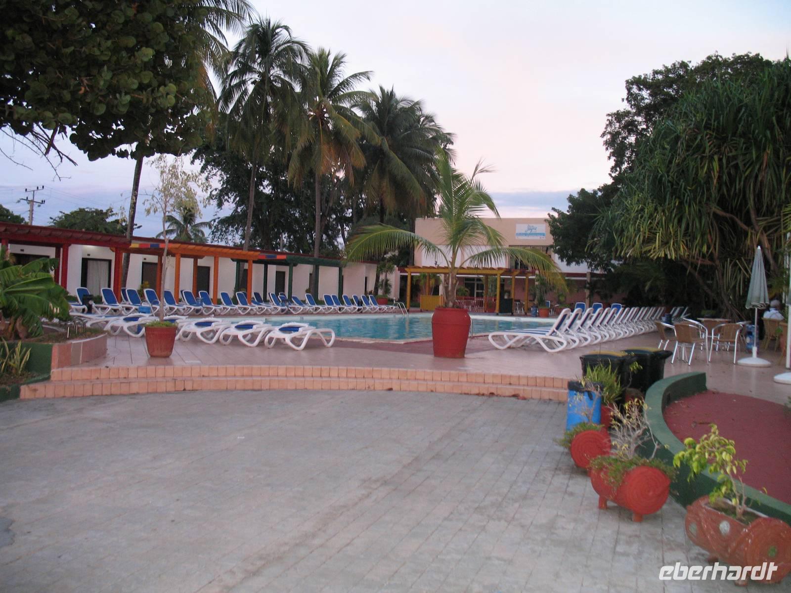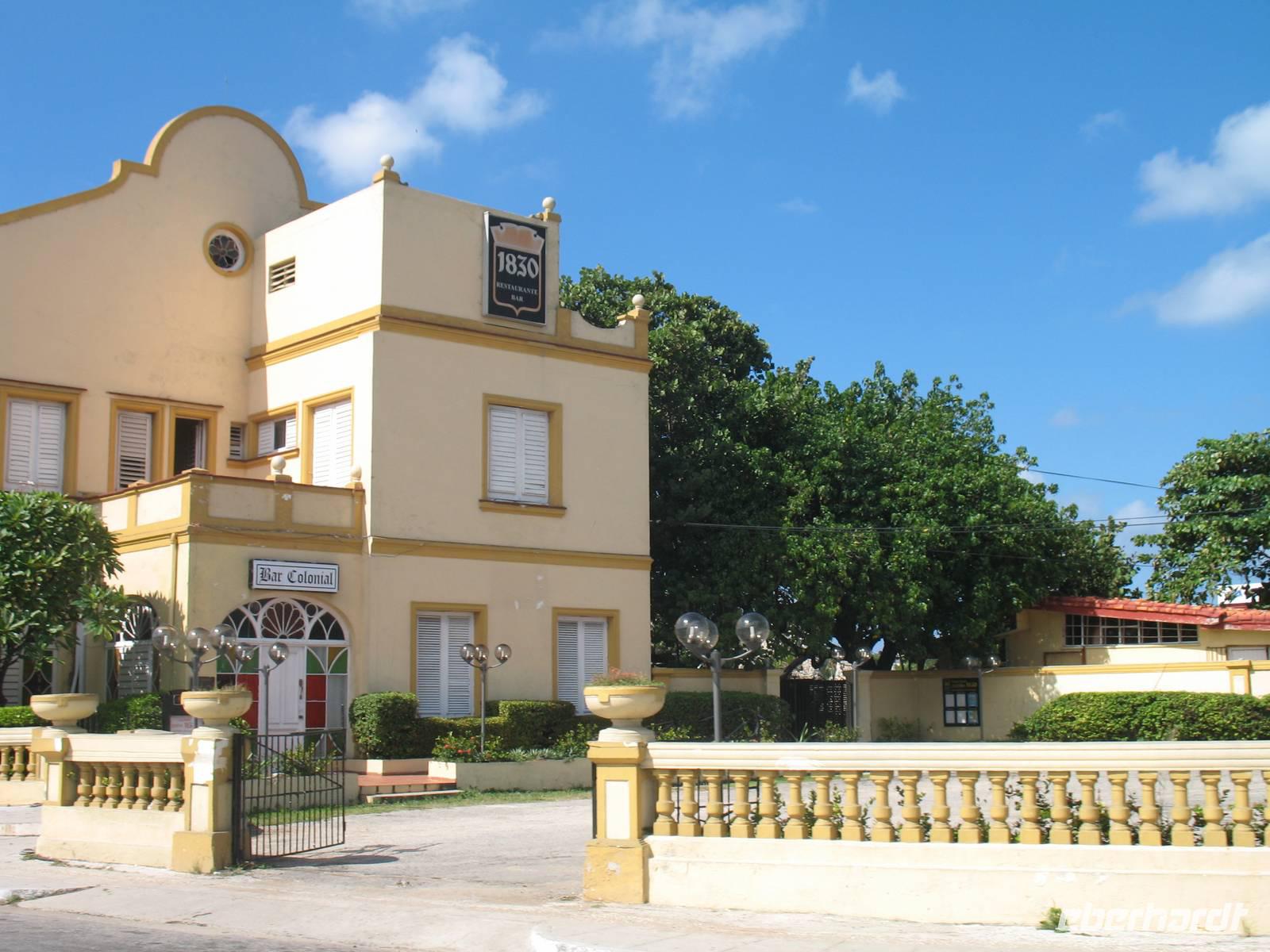 Die vergangenen Tage sind wir vor allem den Spuren Hemingways gefolgt und haben uns Havanna und Umgebung angeschaut. Heute führt uns die Reise weiter nach Cienfuegos. Allerdings scheint es das Wetter dieses Mal nicht so gut mit uns zu meinen :-( Bereits am Morgen regnet es leicht. Gegen 10.45 Uhr stoppen wir an der Finca "Fiesta Campesina" für eine kleine Kaffee- und Bio-Pause. Leider regnet es hier richtig stark und wir stellen uns eher unter statt diese tolle Anlage zu besichtigen. Es gibt jede Menge Tiere zu sehen und einen Botanischen Garten, wo an Bäumen und Pflanzen kleine Schilder mit deren Namen angebracht sind. Gleich im Eingangsbereich werden wir für ein Glücksspiel, eine Art Roulette angehalten, wo die Mitspieler ein kleines Haus mit Nummer auswählen, ein Meerschweinchen dann in die Mitte gesetzt wird und wenn es in das jeweilige ausgewählte Häuschen hineinläuft, gewinnt dieser Spieler. Das Meerschweinchen kann einem da wirklich nur leidtun! Weiter befinden sich im Inneren der Finca noch ein Café, Souvenirshops und auch eine Bar mit frisch gepresstem Zuckerrohrsaft. Dann fahren wir weiter zum ehemaligen Yacht Club Cienfuegos der High Society, wo wir unsere Mittagspause verbringen. Das Ambiente ist sehr exklusiv und es gibt ein köstliches einfaches Buffet mit guter Auswahl, es ist für Jeden etwas dabei! Nach dem Essen geht es weiter ins Zentrum mit Rundgang durch die Fußgängerzone, den Boulevard der Stadt bis in den Parque Martí. Wir besichtigen auch das berühmte Teatro Tomás Terry. Wir nehmen im Theater Platz und lassen die interessante Architektur auf uns wirken. Die freie Zeit im Anschluss nutzen wir, um uns auf dem Plaza mit der Casa de Bienes Culturales und der Catedral de la Purísima umzuschauen. Am frühen Nachmittag fahren wir zum 4-Sterne-Hotel "Jagua" in Punta Gorda, wo wir eine Nacht schlafen werden. Der Check-In verläuft reibungslos und es gibt auch einen Cocktail zur Begrüßung, zur Abwechslung in Kuba alkoholfrei und sehr süß! Das Hotel bietet einen Außenpool mit Bar und nach dem Essen gibt es sogar eine Salsa-Stunde zum Üben! Wir verabreden uns um 17.30 Uhr zur Cocktail-Happy-Hour an der Hotelbar direkt beim Außenpool, wo uns noch ein besonderes Schauspiel geboten wird. Ein betrunkener Hotelgast möchte nicht aus dem Pool steigen und das Hotelpersonal hat wirklich große Mühe, ihn herauszuholen. Direkt in der Nähe und nur eine Gehminute von unserem Hotel entfernt befindet sich das Palacio de Valle, welches wir besichtigen und wo wir von der Außenplattform über ganz Cienfuegos blicken können. Zunächst erklärt uns Vivian Besonderheiten des Gebäudes und dann erhält jeder noch einen Cocktail Ron Collins auf der Dachterrasse, welcher dieses Mal mit viel Alkohol versehen ist. Gegen 19.00 Uhr gehen wir dann gemeinsam zum Abendessen im Hotel. Es gibt wieder ein sehr leckeres Buffet mit großer Auswahl. Wir lassen es uns einfach schmecken! Während die meisten Reisegäste sich auf ihre Zimmer zurückziehen, treffen sich die anderen Gäste um 21.00 Uhr zum Salsa-Unterricht an der Hotelbar. Allerdings stimmen unsere Erwartungen nicht ganz mit dem überein, was wir sehen und besonders hören. Ein Tanzpaar zeigt zunächst ein paar Tänze und abwechselnd singt ein kubanischer Sänger. Die Tänzer sind in Ordnung, das können wir unglücklicherweise leider nicht von dem Gesang behaupten :-( Aber nun ja, nach wenigen Liedern und Tänzen beginnt endlich der Unterricht, auch anderes als erwartet. Die Tänzer fragen im Publikum, wer gerne teilnehmen möchte, anfangs traut sich aber keiner. Dann erklären sich doch noch ein paar Gäste bereit, auch wir nehmen teil :-) Uns werden vier Schritte gezeigt, welche wir an der einen oder anderen Stelle der Reise vielleicht ein weiteres Mal anwenden werden. Die Salsa-Stunde war nett, aber die großartigen Abendveranstaltungen der vergangenen zwei Tage in Havanna werden uns wohl doch eher in Erinnerung bleiben :-)