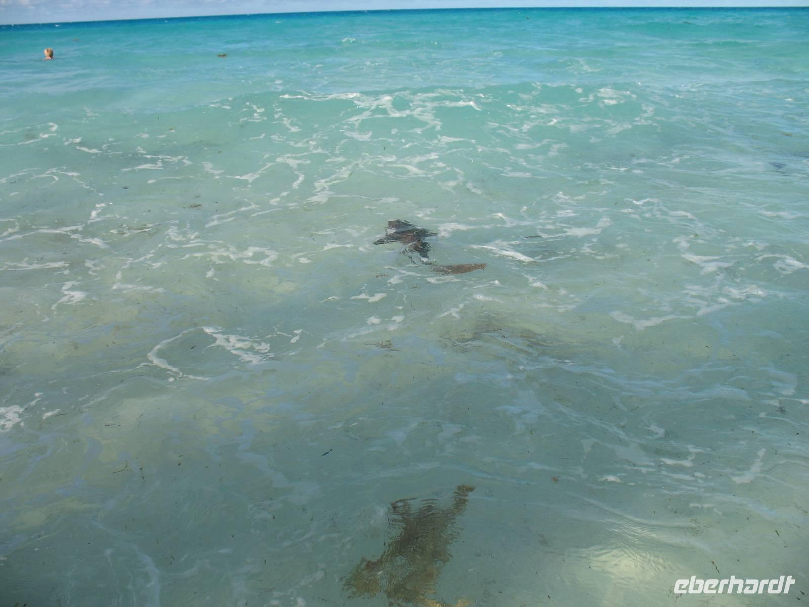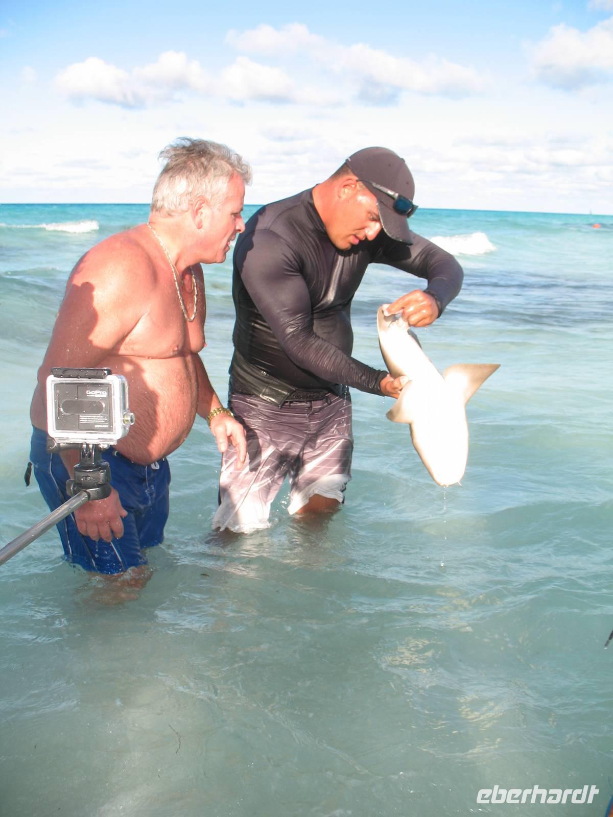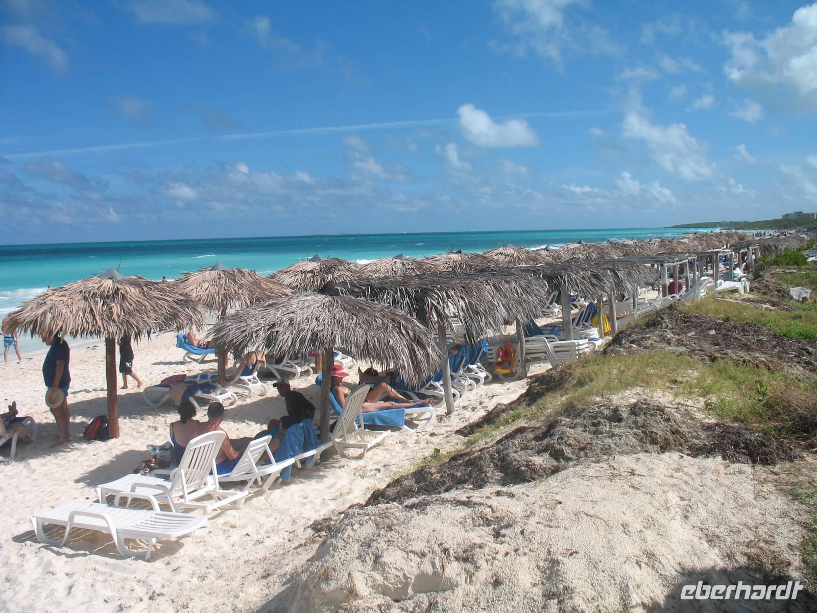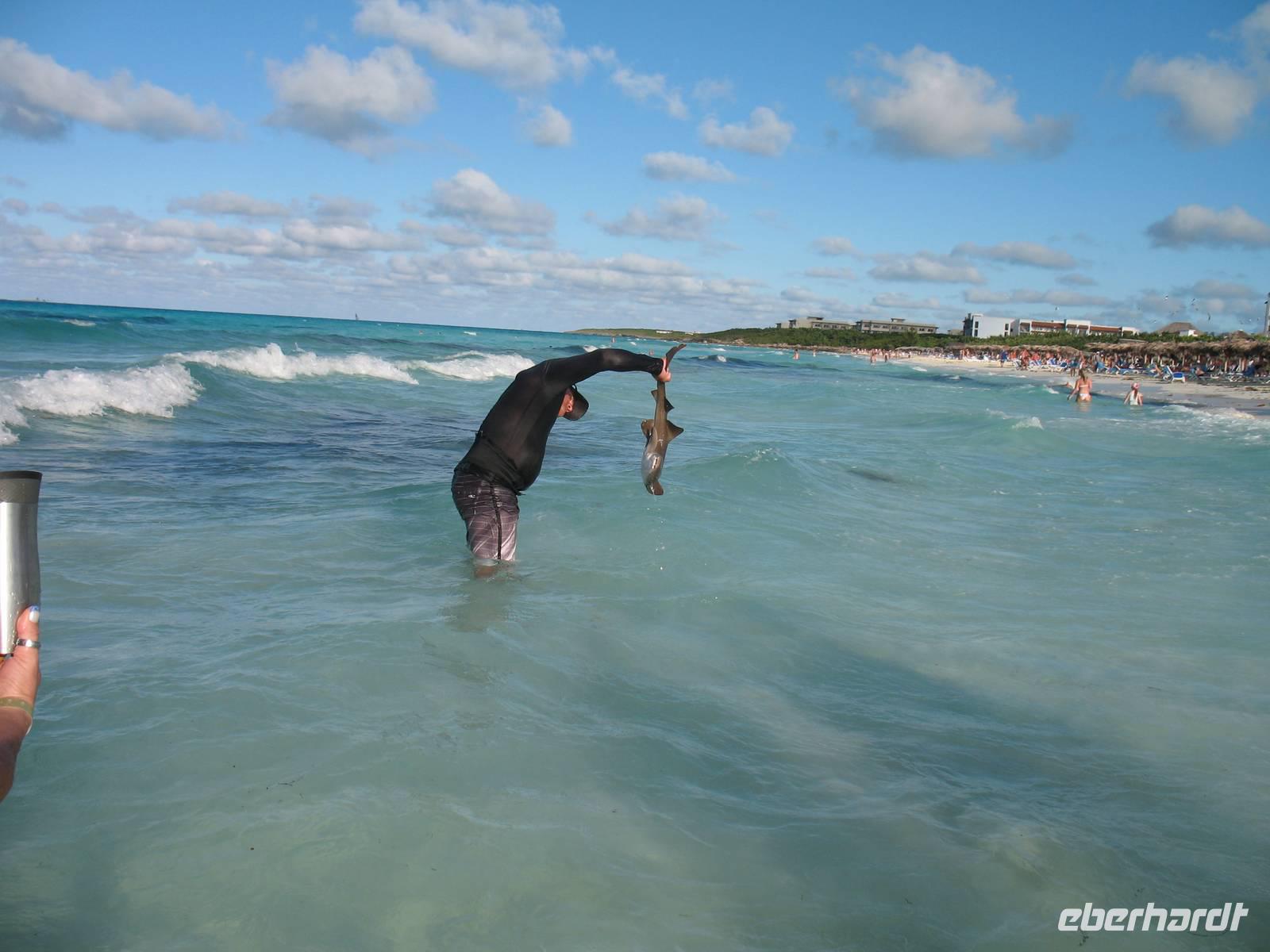 Die nächsten zwei Tage stehen im Sinne vollständiger Entspannung und Ausruhen bei supertollem Wetter in absolut relaxter Umgebung. Während wir die letzten Tage sehr viel über das Land Kuba, dessen Kultur und Menschen erfahren haben, freuen wir uns nun einfach, auch noch ein paar Tage die traumhaften Strände und das tolle karibische Flair zu genießen. Genauso lecker wie das Abendbuffet ist das Frühstück, alles sehr lecker und reichhaltig. Danach trifft sich ein Teil der Gruppe, um gemeinsam den kleinen Touristenmarkt zu besuchen, welcher nur fünf Gehminuten von unserem Bungalow entfernt ist. Hier gibt es neben mehreren kleinen Ständen mit Schmuck, Kleidung und Andenken auch eine Bank, Restaurants und Zigarrenladen. Im Anschluss treffen wir uns zum gemeinsamen Entspannen und Relaxen, Erzählen und Schwimmen im Meer. Um 13.00 Uhr genießen wir abermals ein leckeres Buffet, besonders die Garnelen sind empfehlenswert. Wir essen unter anderem auch einen leckeren selbstgestalteten Eisbecher, flambierte Banane oder tollen Kuchen. Danach schauen wir ein weiteres Mal auf dem Touristenmarkt vorbei oder genießen die tollen Sonnenstrahlen am wunderschönen Strand. Wir beobachten, wie sich eine Menschentraube am Strand bildet. Natürlich sind wir neugierig und schauen nach, was da los ist. Kaum zu glauben, aber ein Baby-Nasenhai hat sich an den Strand verirrt. Auf Nachfragen wird uns gesagt, dass sich das Tier verletzt hat und daher immer zum Strand zurückkehrt. Leider kann dem Hai nicht geholfen werden und daher lassen sie das Tier wieder ins Wasser. Aber so nah haben wir wohl noch nie einen Hai am Strand gesehen, das ist schon ein spannendes Erlebnis. Zum Abendessen gehen wir wieder ins Buffet-Restaurant, da wir Buffet wesentlich besser finden als Menüessen. Zum Geburtstag eines Gastes gibt es heute als Überraschung noch eine Geburtstagstorte und Champagner für alle Gäste :-) Das Essen ist wieder sehr lecker und vielfältig, neben Sushi und frisch zubereiteten Fisch, Fleisch und Pasta erfreuen wir uns auch am großartigen Süßspeisen-Buffet. Die heutige Show im hoteleigenen Theater ist eine Hommage an Michael Jackson "Homenaje Michael Jackson". Davor sitzen wir abermals bei erfrischenden Cocktails zusammen. Nach der großartigen Theatervorstellung lassen wir die vergangenen Tage gemeinsam bei Cocktails und Bier Revue passieren :-)