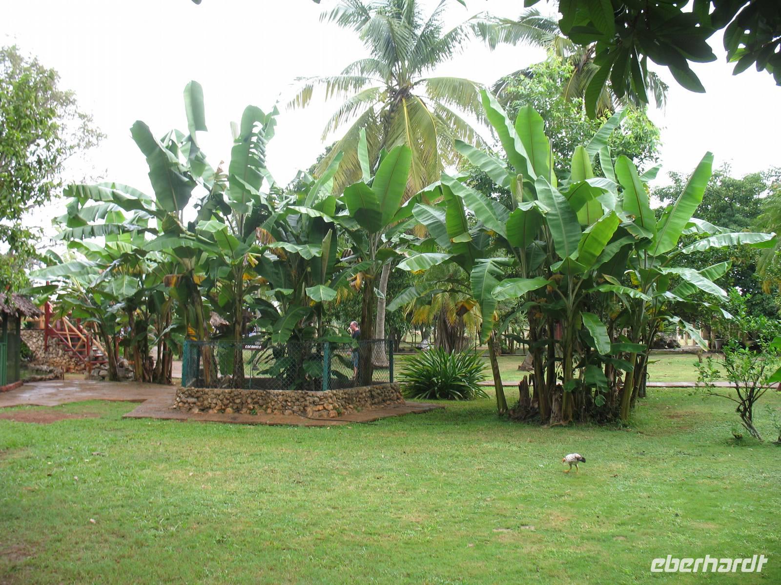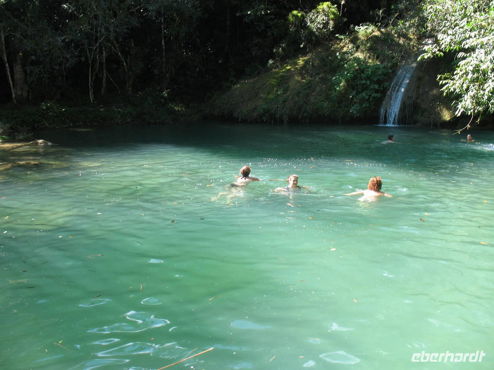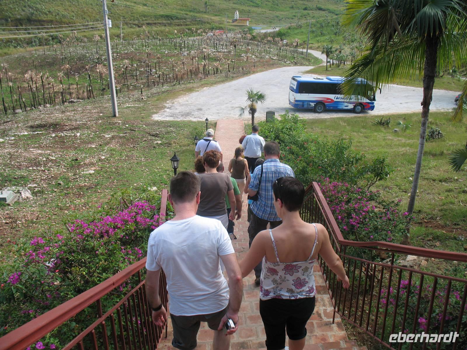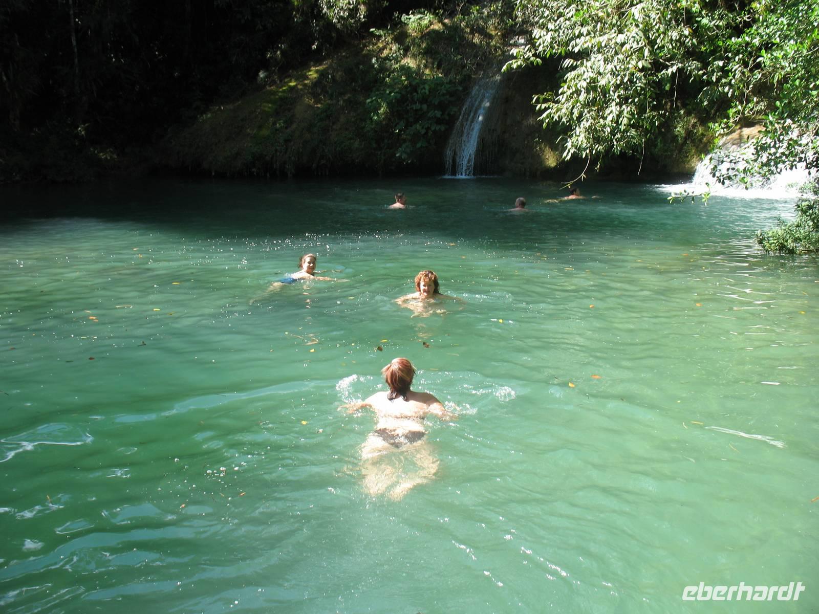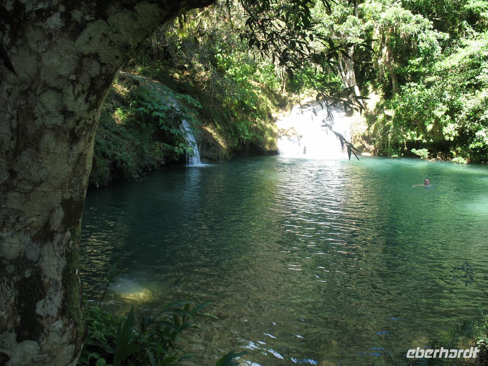 Unser heutiger Tagesprogrammpunkt zum "Bergfest" der Reise ist eine großartige Wanderung im Naturpark Guanayara! Nach reichhaltigem Frühstück fahren wir zusammen mit Vivian und unserem Wanderführer Eduardo im russischen LKW zum Park Guanayara. Die Wanderung von drei Kilometern beginnt an einer Kaffeeplantage, wo wir von Eduardo sehr viel zu Anbau und Verarbeitung des Kaffees erfahren. Mit vielen weiteren Erklärungen zur Natur sowie verschiedenen Pflanzen und Bäumen wie afrikanischer Tulpenbaum "Spathodea campanulata", Obstbanane, Yucca Palme und Mamey sapote wandern wir weiter zum Wasserfall. Eduardo berichtet uns, dass es über 8.000 unterschiedliche Bäume, Pflanzen und Sträucher sowie 96 verschiedene Palmenarten gibt. Die Königspalme ist Nationalbaum und die weiße Schmetterlingsjasmin "Mariposa blanca" Nationalblume Kubas. Der Nationalvogel heißt Kubatrogon oder besser Tocororo "Priotelus temnurus" und er ist der kubanische Nationalvogel, da er die gleichen Farben wir die Nationalflagge im Gefieder hat, also eine rote und weiße Farbe an der Brust und auf dem Höcker eine dunkle blaue Farbe. Andere kubanische Einwohner sagen auch, dass er der Nationalvogel ist, weil er genauso viel tanzt und singt wie die Kubaner selbst :-) Bevor wir den rund 30 Meter hohen Wasserfall "El Rocio" fotografieren, legen wir zuvor einen Zwischenstopp in einer kleinen Höhle ein. Weiter erzählt uns Eduardo, dass er mehrere Jahre in Sachsen gelebt und viele Orte besucht hat, an denen unsere Gäste auch zuhause sind, was für ein amüsanter Zufall :-) Nur wenige Minuten nachdem wir den tollen Wasserfall fotografiert haben, nehmen wir auch schon ein tolles Bad im natürlichen Wasserbecken in der Nähe, wirklich sehr erfrischend. Heute ist ja auch der 11.11.2014 und in Deutschland wird um 11.11 Uhr die Faschingszeit eingeleitet. Auch wenn wir in Kuba sind, wollen wir diese Zeit dennoch feiern, so dass wir pünktlich um 11.11 Uhr kubanischer Zeit gemeinsam mit leckerem mitgebrachten fünfjährigen Rum "Añejo Especial" anstoßen. Wir genießen die Natur und erhalten weitere spannende Informationen zu Kultur, Menschen und deren Leben auf dieser karibischen Insel. Beispielsweise gibt er uns interessante Auskünfte zur Lebensmittelkarte, welche jede kubanische Familie vom Staat für wenig Geld erhält. Eine Karte gilt für ein ganzes Jahr mit einer Seite für jeden Monat. Über diese Karte erhalten die Kubaner unter anderem eine bestimmte Menge im Monat unter anderem an Reis, Bohnen, Speiseöl, Milch, Brot oder Eier. Für die Mehrheit der Familien reicht diese Karte aber nicht aus, so dass sie bei privaten Händlern oder auch beim Staat für einen weitaus teuren, teilweise bis zu dreifach höheren Preis weitere Lebensmittel kaufen müssen. Außerdem erfahren wir von Eduardo, dass sowohl Erziehung und Schulbildung als auch das Gesundheitssystem vom Staat finanziert werden. In diesem Sinne gibt es keine direkten Steuerabgaben, lediglich ein gewisser Teil vom Gehalt wird für die Rente abgezogen. Beispielweise können auch Brillen und Hörgeräte für wenig Geld erworben werden. Hinsichtlich der Miete zeigt sich ein ähnliches Bild, auch hier sollen sich die Kosten im Rahmen halten. Im Gegensatz dazu sind aber andere Sachen, welche nicht alltäglich sind, wesentlich teurer, zum Beispiel Waschmaschinen, Fernsehapparate oder auch Kleidung. In Kuba soll es keine Obdachlose geben und auch sehr wenige Mütter sollen ihre Kinder verlassen, so dass diese Kinder in einem Heim leben müssen. Unsere Wanderführer erzählen uns, dass Kuba zwar ein armes Land, aber auch ein sicheres Land ist. Unfassbarer und auch unverständlich für uns ist aber vielmehr, dass es in Kuba für Mord eine wesentlich geringere Haftstrafe als für Drogenhandel gibt. Weiter essen Kubaner wenig Rindfleisch, da sie von den wenigen Kühen, welche sie haben, eher die Milch statt das Fleisch zum Leben benötigen. Das kubanische Lieblingsfleisch ist demnach nicht das Rindfleisch, sondern das Schweinefleisch oder auch das uns bereits mehrmals servierte Hühnchen. Bei diesem Thema bekommen wir direkt Hunger, so dass unsere Wanderung auch schon weitergeht. Zuvor sehen wir noch einen kleinen Kolibri in seinem Nest. Unterwegs erfahren wir von Eduardo weitere Informationen zum kubanischen Schulsystem. Die Eltern müssen unter anderem den Rucksack für ihre Kinder kaufen, das Mittagessen in der Schule ist frei, aber leider nicht gut. Bücher und Schreibzeug bekommen die Kinder in der Schule, diese müssen sie nach dem Unterricht aber wieder abgeben. Es besteht bis zur neunten Klasse Schulpflicht in Kuba. Wir laufen rund eine Stunde bis zum Restaurant "La Gellega", wo wir unser Mittagessen zu uns nehmen. Empfangen werden wir natürlich mit einem leckeren Begrüßungscocktail. Als Hauptgericht gibt es köstliches Omelette oder gebratenes Huhn zur Auswahl mit verschiedenen Beilagen. Im Anschluss fahren wir im LKW zum Kaffeemuseum "Casa Museo del Café", wo uns Eduardo zunächst an Exponaten im Außenbereich die traditionelle Verarbeitung und Zubereitung des Kaffees erklärt und dann uns auch durch das kleine Café mit historischen Gegenständen führt. Danach sitzen alle noch vor oder im Haus und genießen einen starken sehr guten Kaffee. Am frühen Nachmittag fahren wir wieder zum Hotel zurück. Angekommen im Hotel verabreden wir uns um 16.30 Uhr zum gemeinsamen Feiern des Bergfestes unsere Reise. Die freie Zeit nutzen wir zum Schwimmen im Hallenbad oder einem Spaziergang durch die Hotelanlage und Umgebung. Das Zimmer der Reisebegleitung besitzt zwei große Räume, eine Art Wohn- und Schlafzimmer, so dass wir uns hier alle zum "Bergfest" eintreffen. Als Überraschung gibt es dieses Mal den sechsjährigen Rum "Añejo Reserva" zum Probieren, welchen wir zusammen mit Coca Cola als Cuba Libre trinken. Wir genießen diesen köstlichen Cocktail und lassen dabei die wunderbaren Eindrücke der letzten Tage Revue passieren. Um 19.00 Uhr gehen wir gemeinsam zum Abe