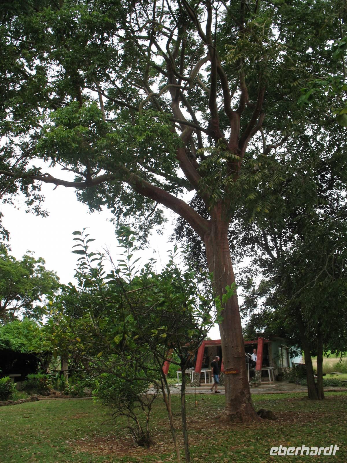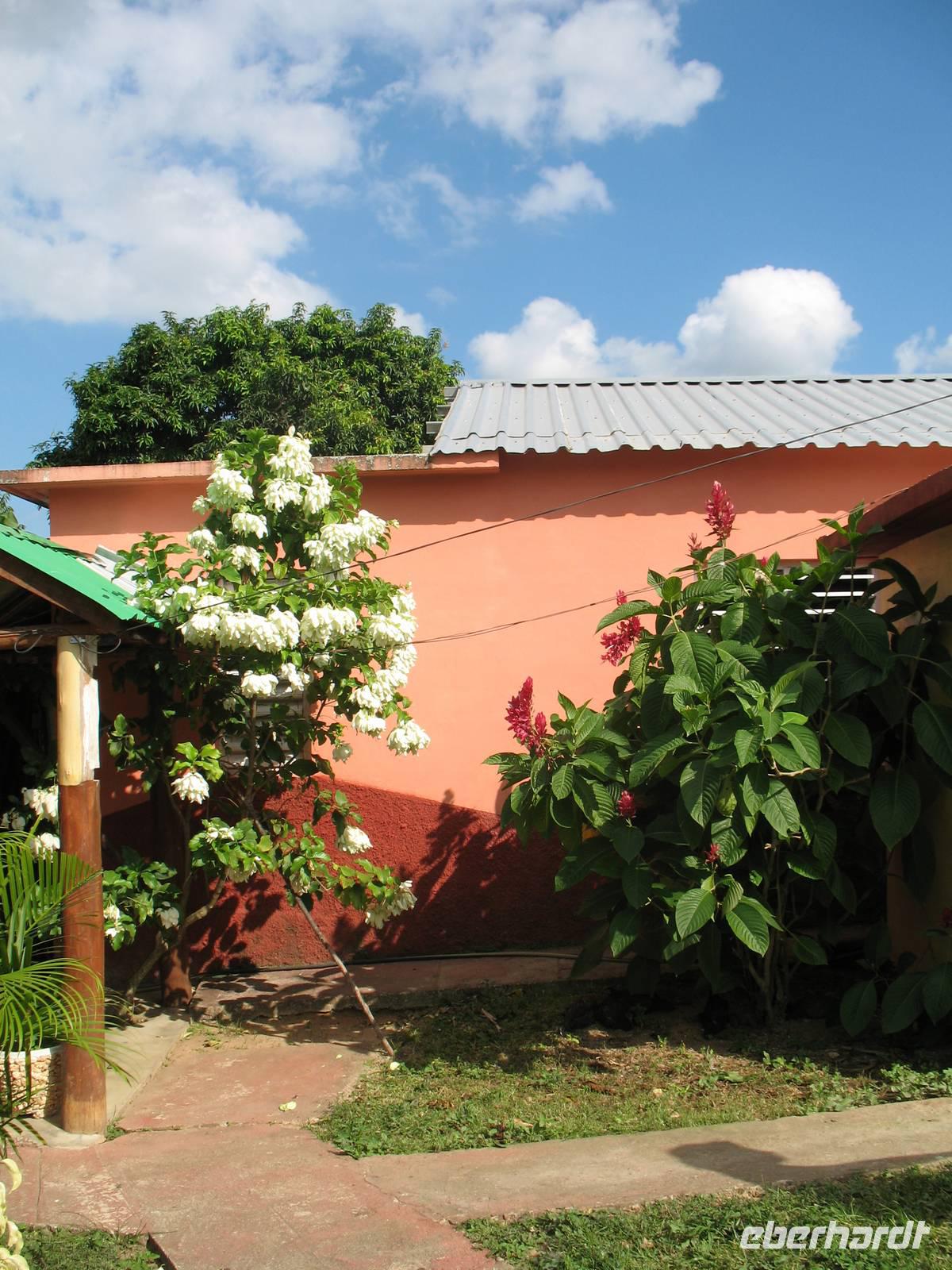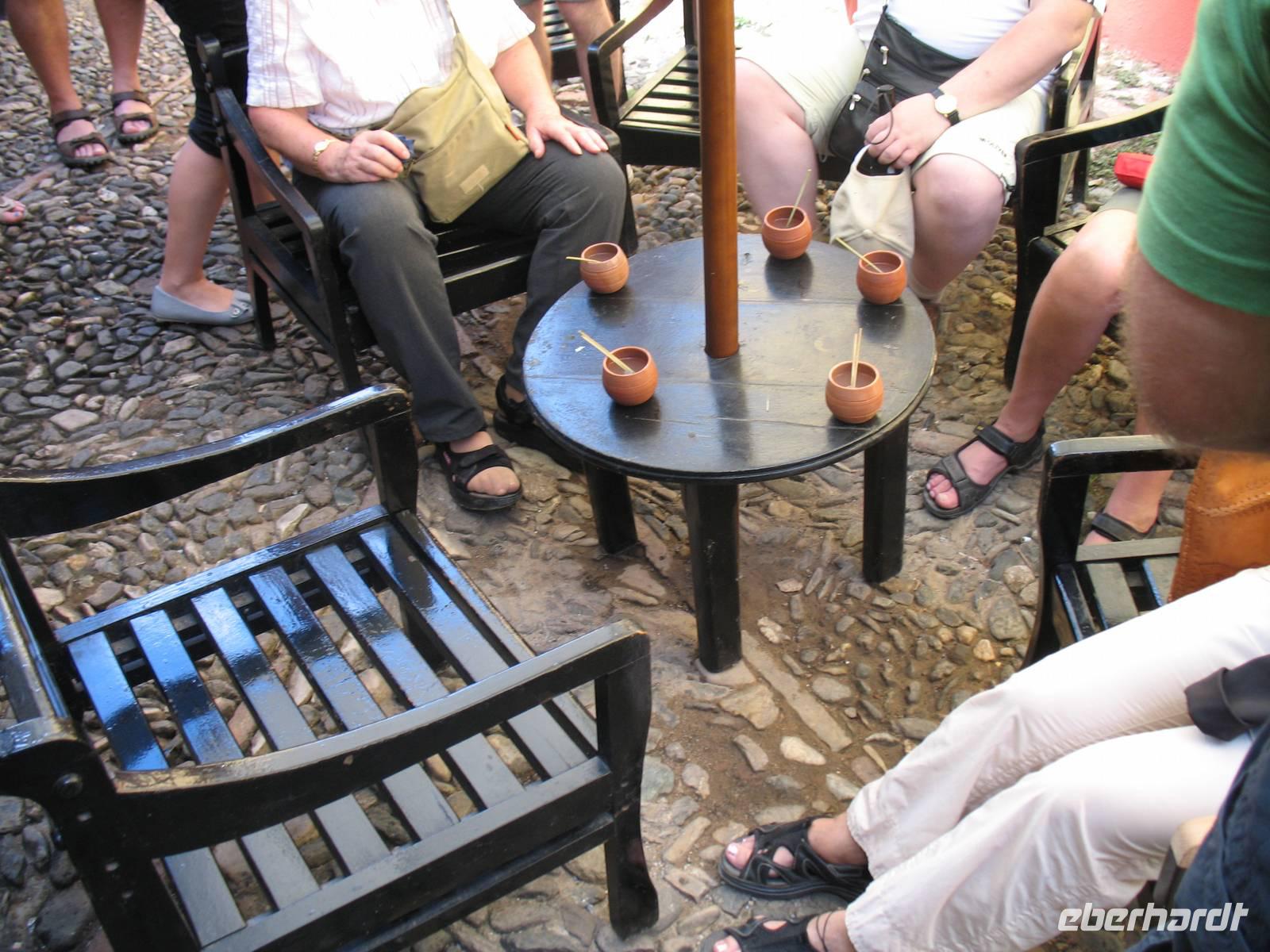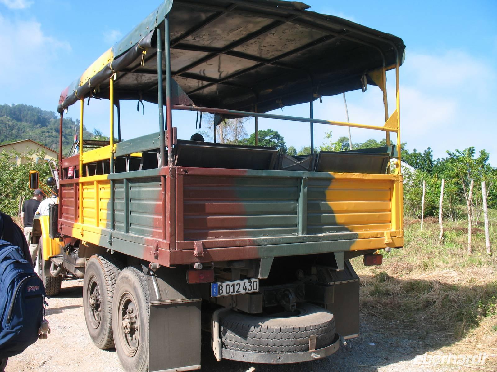 Unser heutiger Tagesprogrammpunkt zum "Bergfest" der Reise ist eine großartige Wanderung im Naturpark Guanayara! Nach reichhaltigem Frühstück fahren wir zusammen mit Vivian und unserem Wanderführer Eduardo im russischen LKW zum Park Guanayara. Die Wanderung von drei Kilometern beginnt an einer Kaffeeplantage, wo wir von Eduardo sehr viel zu Anbau und Verarbeitung des Kaffees erfahren. Mit vielen weiteren Erklärungen zur Natur sowie verschiedenen Pflanzen und Bäumen wie afrikanischer Tulpenbaum "Spathodea campanulata", Obstbanane, Yucca Palme und Mamey sapote wandern wir weiter zum Wasserfall. Eduardo berichtet uns, dass es über 8.000 unterschiedliche Bäume, Pflanzen und Sträucher sowie 96 verschiedene Palmenarten gibt. Die Königspalme ist Nationalbaum und die weiße Schmetterlingsjasmin "Mariposa blanca" Nationalblume Kubas. Der Nationalvogel heißt Kubatrogon oder besser Tocororo "Priotelus temnurus" und er ist der kubanische Nationalvogel, da er die gleichen Farben wir die Nationalflagge im Gefieder hat, also eine rote und weiße Farbe an der Brust und auf dem Höcker eine dunkle blaue Farbe. Andere kubanische Einwohner sagen auch, dass er der Nationalvogel ist, weil er genauso viel tanzt und singt wie die Kubaner selbst :-) Bevor wir den rund 30 Meter hohen Wasserfall "El Rocio" fotografieren, legen wir zuvor einen Zwischenstopp in einer kleinen Höhle ein. Weiter erzählt uns Eduardo, dass er mehrere Jahre in Sachsen gelebt und viele Orte besucht hat, an denen unsere Gäste auch zuhause sind, was für ein amüsanter Zufall :-) Nur wenige Minuten nachdem wir den tollen Wasserfall fotografiert haben, nehmen wir auch schon ein tolles Bad im natürlichen Wasserbecken in der Nähe, wirklich sehr erfrischend. Heute ist ja auch der 11.11.2014 und in Deutschland wird um 11.11 Uhr die Faschingszeit eingeleitet. Auch wenn wir in Kuba sind, wollen wir diese Zeit dennoch feiern, so dass wir pünktlich um 11.11 Uhr kubanischer Zeit gemeinsam mit leckerem mitgebrachten fünfjährigen Rum "Añejo Especial" anstoßen. Wir genießen die Natur und erhalten weitere spannende Informationen zu Kultur, Menschen und deren Leben auf dieser karibischen Insel. Beispielsweise gibt er uns interessante Auskünfte zur Lebensmittelkarte, welche jede kubanische Familie vom Staat für wenig Geld erhält. Eine Karte gilt für ein ganzes Jahr mit einer Seite für jeden Monat. Über diese Karte erhalten die Kubaner unter anderem eine bestimmte Menge im Monat unter anderem an Reis, Bohnen, Speiseöl, Milch, Brot oder Eier. Für die Mehrheit der Familien reicht diese Karte aber nicht aus, so dass sie bei privaten Händlern oder auch beim Staat für einen weitaus teuren, teilweise bis zu dreifach höheren Preis weitere Lebensmittel kaufen müssen. Außerdem erfahren wir von Eduardo, dass sowohl Erziehung und Schulbildung als auch das Gesundheitssystem vom Staat finanziert werden. In diesem Sinne gibt es keine direkten Steuerabgaben, lediglich ein gewisser Teil vom Gehalt wird für die Rente abgezogen. Beispielweise können auch Brillen und Hörgeräte für wenig Geld erworben werden. Hinsichtlich der Miete zeigt sich ein ähnliches Bild, auch hier sollen sich die Kosten im Rahmen halten. Im Gegensatz dazu sind aber andere Sachen, welche nicht alltäglich sind, wesentlich teurer, zum Beispiel Waschmaschinen, Fernsehapparate oder auch Kleidung. In Kuba soll es keine Obdachlose geben und auch sehr wenige Mütter sollen ihre Kinder verlassen, so dass diese Kinder in einem Heim leben müssen. Unsere Wanderführer erzählen uns, dass Kuba zwar ein armes Land, aber auch ein sicheres Land ist. Unfassbarer und auch unverständlich für uns ist aber vielmehr, dass es in Kuba für Mord eine wesentlich geringere Haftstrafe als für Drogenhandel gibt. Weiter essen Kubaner wenig Rindfleisch, da sie von den wenigen Kühen, welche sie haben, eher die Milch statt das Fleisch zum Leben benötigen. Das kubanische Lieblingsfleisch ist demnach nicht das Rindfleisch, sondern das Schweinefleisch oder auch das uns bereits mehrmals servierte Hühnchen. Bei diesem Thema bekommen wir direkt Hunger, so dass unsere Wanderung auch schon weitergeht. Zuvor sehen wir noch einen kleinen Kolibri in seinem Nest. Unterwegs erfahren wir von Eduardo weitere Informationen zum kubanischen Schulsystem. Die Eltern müssen unter anderem den Rucksack für ihre Kinder kaufen, das Mittagessen in der Schule ist frei, aber leider nicht gut. Bücher und Schreibzeug bekommen die Kinder in der Schule, diese müssen sie nach dem Unterricht aber wieder abgeben. Es besteht bis zur neunten Klasse Schulpflicht in Kuba. Wir laufen rund eine Stunde bis zum Restaurant "La Gellega", wo wir unser Mittagessen zu uns nehmen. Empfangen werden wir natürlich mit einem leckeren Begrüßungscocktail. Als Hauptgericht gibt es köstliches Omelette oder gebratenes Huhn zur Auswahl mit verschiedenen Beilagen. Im Anschluss fahren wir im LKW zum Kaffeemuseum "Casa Museo del Café", wo uns Eduardo zunächst an Exponaten im Außenbereich die traditionelle Verarbeitung und Zubereitung des Kaffees erklärt und dann uns auch durch das kleine Café mit historischen Gegenständen führt. Danach sitzen alle noch vor oder im Haus und genießen einen starken sehr guten Kaffee. Am frühen Nachmittag fahren wir wieder zum Hotel zurück. Angekommen im Hotel verabreden wir uns um 16.30 Uhr zum gemeinsamen Feiern des Bergfestes unsere Reise. Die freie Zeit nutzen wir zum Schwimmen im Hallenbad oder einem Spaziergang durch die Hotelanlage und Umgebung. Das Zimmer der Reisebegleitung besitzt zwei große Räume, eine Art Wohn- und Schlafzimmer, so dass wir uns hier alle zum "Bergfest" eintreffen. Als Überraschung gibt es dieses Mal den sechsjährigen Rum "Añejo Reserva" zum Probieren, welchen wir zusammen mit Coca Cola als Cuba Libre trinken. Wir genießen diesen köstlichen Cocktail und lassen dabei die wunderbaren Eindrücke der letzten Tage Revue passieren. Um 19.00 Uhr gehen wir gemeinsam zum Abe