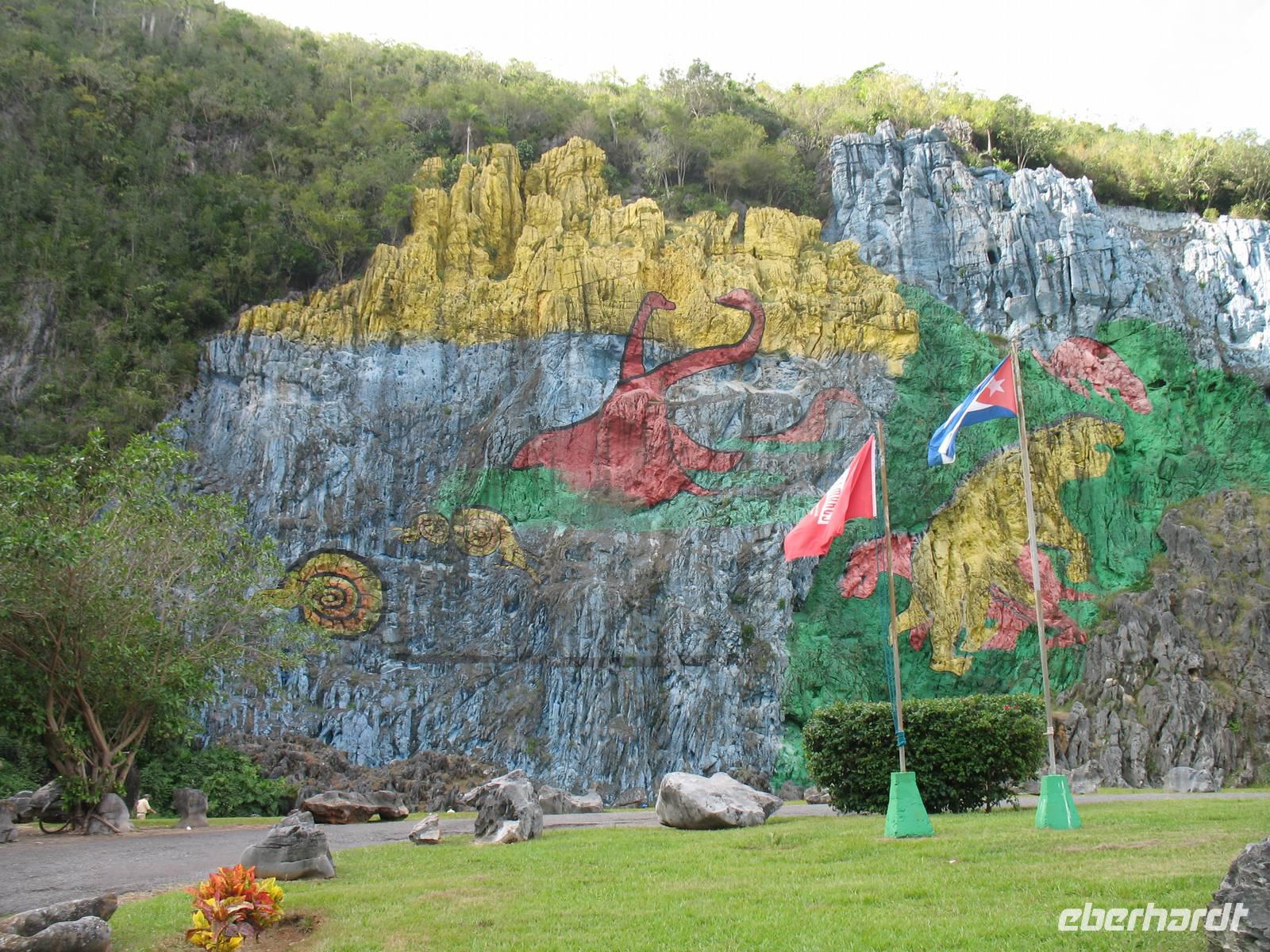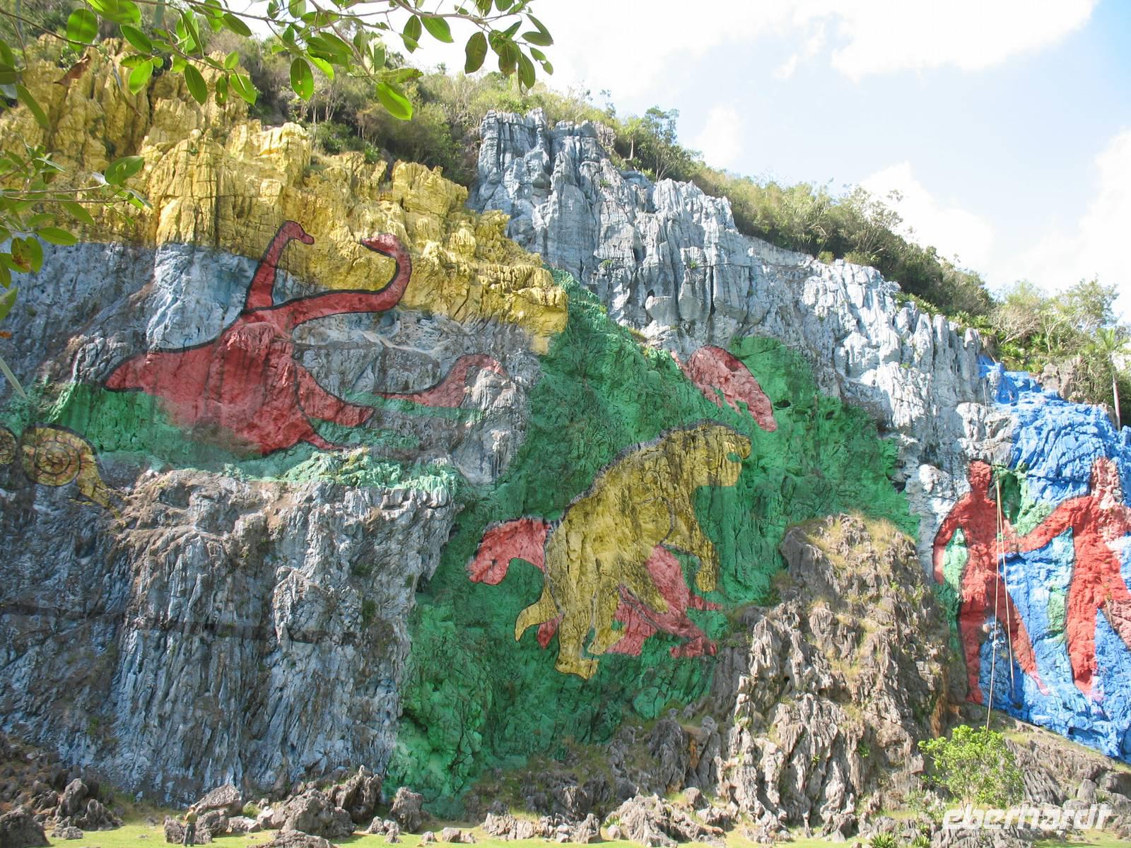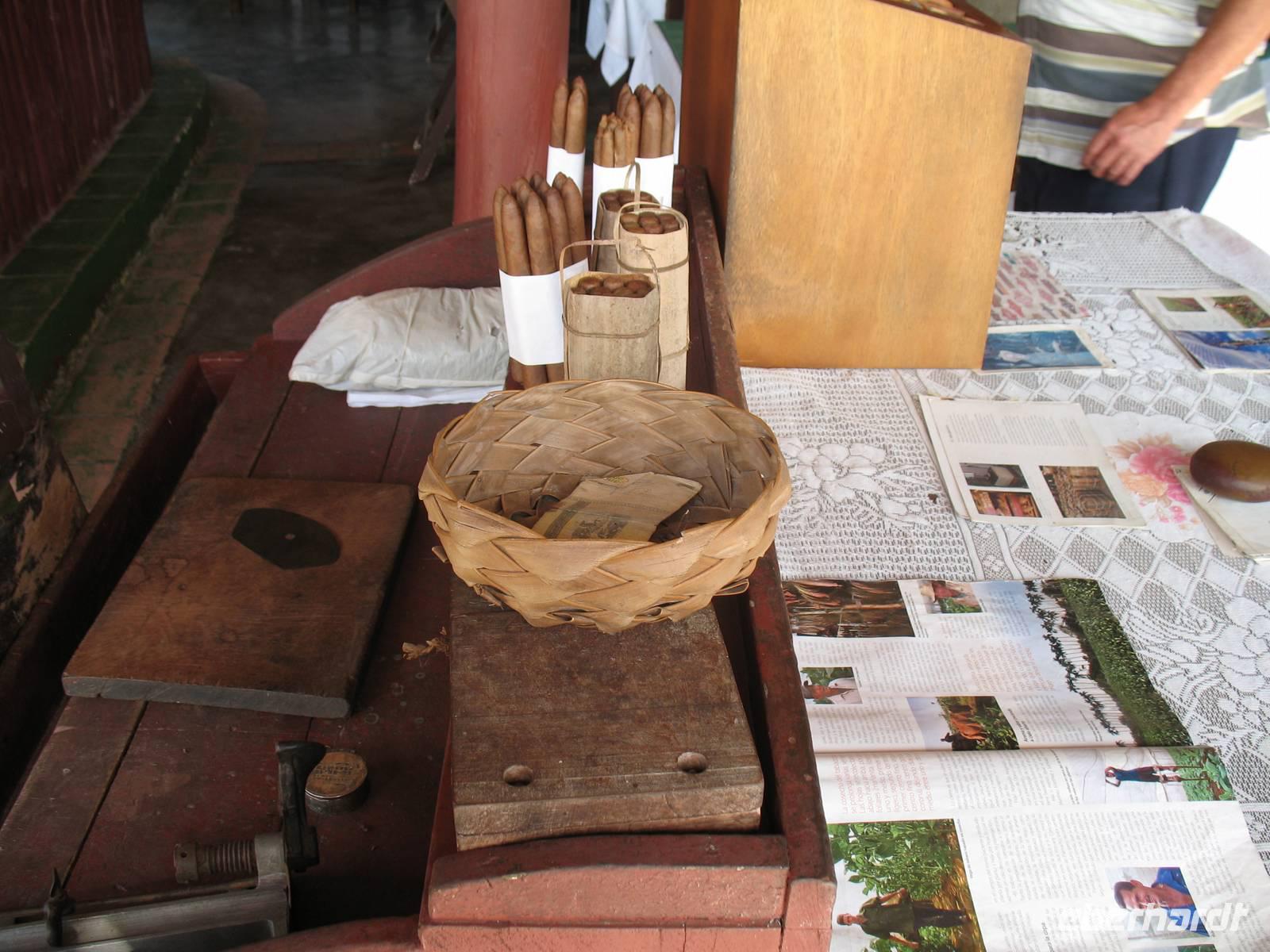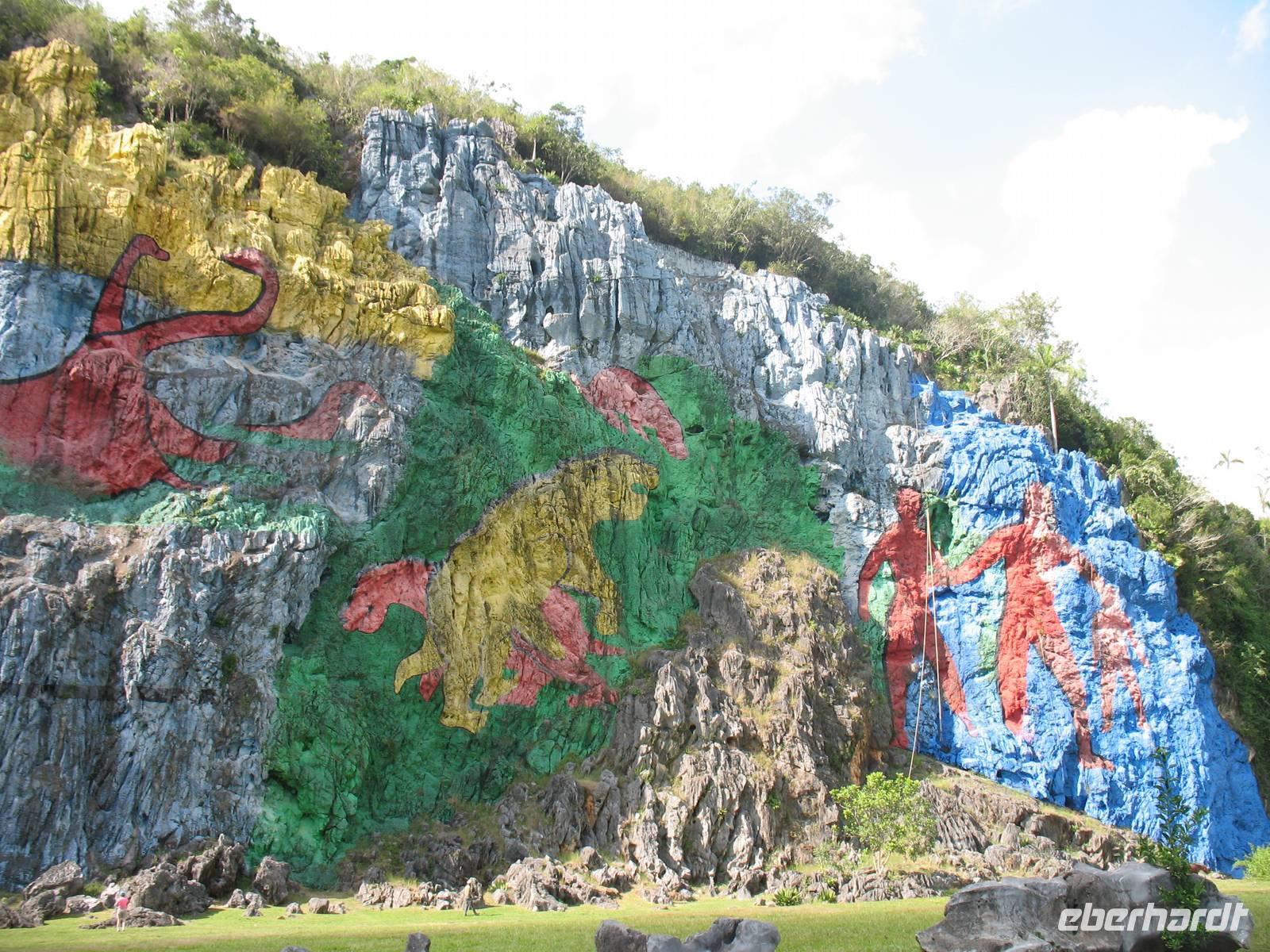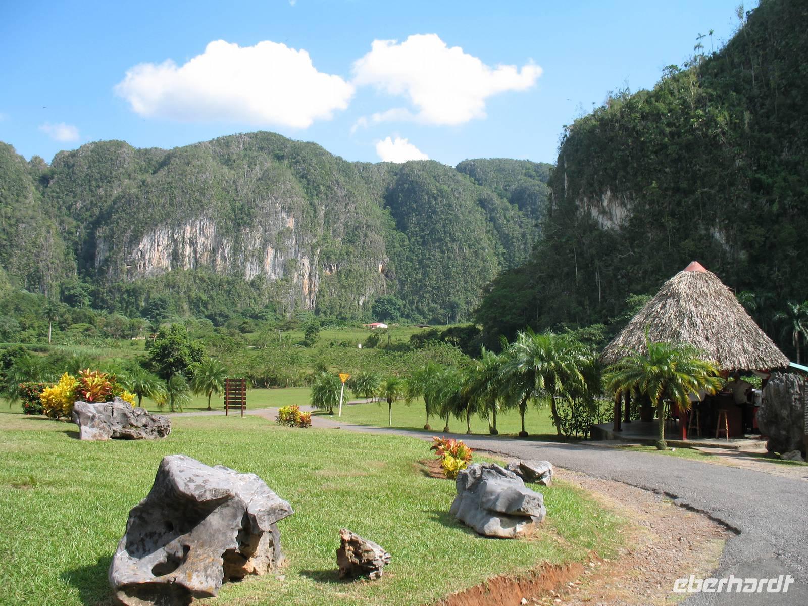 Heute haben wir eine längere Fahrt vor uns, so dass wir nach einem guten Frühstück bereits vor 09.00 Uhr zum Valle de Viñales starten. Das rund zehn Kilometer lange und circa vier Kilometer breite Tal ist eine der schönsten kubanischen Landschaften. Es befindet sich im Orgelpfeifengebirge „Sierra de los Órganos" und im Jahre 1999 erhielt es von der UNESCO die Auszeichnung „Kulturlandschaft der Menschheit". Auf unserer Fahrt legen wir einen Bio-Stopp und zudem einen Zwischenstopp in der Likörfabrik des Guayabita del Pinar als schöne unerwartete Überraschung für unsere Gäste ein :-) Nach einer kleinen Führung können wir sowohl den süßen als auch herben Schnaps probieren. Langsam gewöhnen wir uns an leckere Begrüßungscocktails und kleine Schnäpse zwischendurch, aber schließlich ist Kuba auch als das Land des Rums bekannt, so dass dieser und andere bekannte Schnäpse zum Probieren auf unserer Reise nicht fehlen dürfen :-) Anschließend fahren wir weiter zur nördlich von Viñales in der Provinz Pinar del Río gelegenen Tropfsteinhöhle "Cueva del Indio". Wir besichtigen die Höhle zu Fuß und bei einer Bootsfahrt von zehn Minuten durch die Höhle bestaunen wir weitere Gebilde an der Decke. Nächster Reiseprogrammpunkt ist die Felsmalerei "Mural de la Prehistoria", welches mit einer Höhe von 120 Metern und Breite von 180 Metern im Jahre 1961 vom mexikanischen Kunstmaler Leovigildo González Morillo auf einen Kalkfelsen geschaffen wurde. Die Farben dieses Kunstwerkes müssen regelmäßig aufgrund zahlreicher und heftiger Regenfälle aufgebessert werden. Danach fahren wir zu einer Bauernfamilie im Valle de Viñales, wo wir im Trocknungsstall "Casa Veguero" Erklärungen zum Tabakanbau erhalten und einem Tabakbauern beim Rollen einer Zigarre zuschauen. Danach gibt es abermals einen leckeren Cocktail. Im Anschluss geht es auch schon weiter zum Restaurant mit Panorama-Blick über das Valle de Viñales in der Nähe des Hotels "Los Jazmines". Das Mittagessen ist sehr lecker, es gibt mehrere verschiedene Gänge unter anderem mit köstlicher Suppe und knusprigen Bananenchips. Der Blick über das Tal ist unbezahlbar :-) Mit viel Fantasie können wir sehen, dass die Gebirgsform auf der anderen Seite wie drei liegende Elefanten ausschaut. Wir sitzen in einer Art offenem Baumhaus und genießen Aussicht, Essen und Ambiente. Uns gefällt es so gut, dass wir erst über drei Stunden später nach kurzem Blick vom Aussichtspunkt am Hotel "Los Jazmines" wieder zurück nach Havanna fahren. Unser Abendessen nehmen wir im Hotelrestaurant ein. Als Hauptgang gibt es Suppe, Fisch oder Hühnchen. Für diejenige Gäste, welche gestern nicht im "La Taberna de la Muralla" gewesen sind, wird es heute Abend spannend. Wir werden das berühmte Freiluft-Kabarett "Tropicana" mit tollem Unterhaltungsprogramm besuchen. Dabei ist es wichtig zu wissen, dass die Männer lange Hosen tragen müssen. Zwar hat einer der Gäste eine halblange Hose an, aber glücklicherweise können wir eine Ersatzhose bei der Garderobe für den Abend leihen :-) Am Eingang erhalten Männer eine Zigarre und Damen eine Rose, auf Anfrage auch gern eine Zigarre für die Frauen. Es folgt eine großartige zweistündige Tanz- und Musikshow, eine Flasche fünfjährigen Rums für drei Personen, ein Glas Coca Cola für jeden und eine kleine Schale mit Nüssen und Pralinen. Falls wir die Flasche nicht komplett leeren, dann können wir den Rest mitnehmen. Wir sind ganz begeistert von der Show und dem musikalischem Gesang. Nach der Show haben wir noch die Möglichkeit, selbst auf der Bühne mitzutanzen, was wir natürlich gern wahrnehmen. Wir haben so viel Spaß, dass wir gar nicht aufhören möchten. Aber es ist schon halb eins morgens, unserer Busfahrer sollte auch schlafen gehen und somit fahren wir zurück zum Hotel. Wirklich ein gelungener Abschluss eines wunderbaren Tages :-)