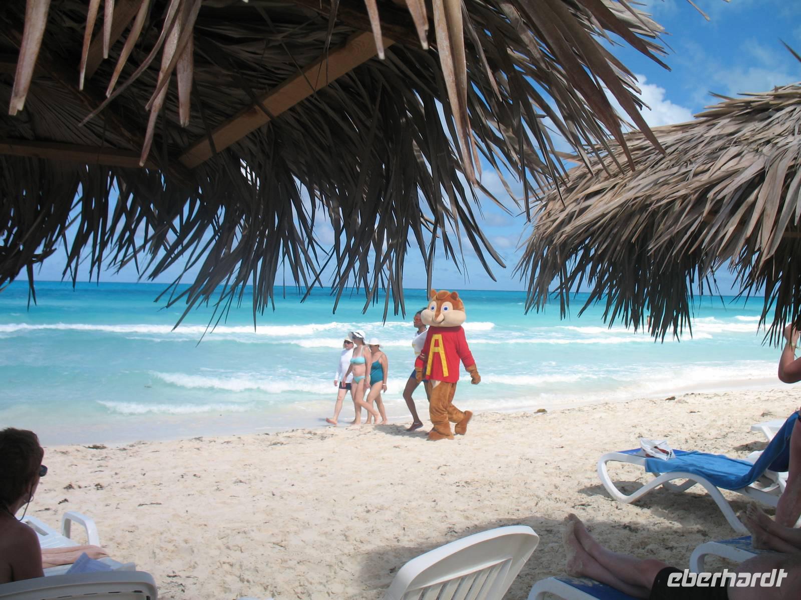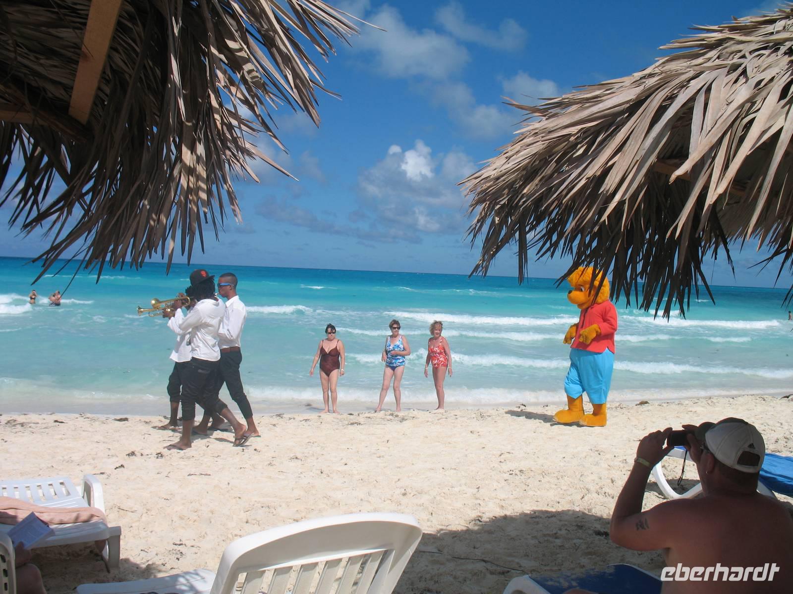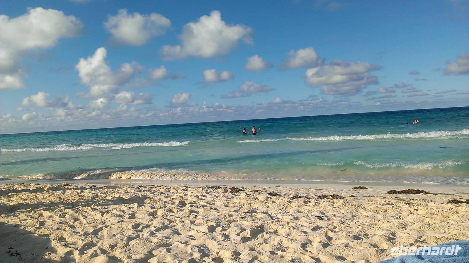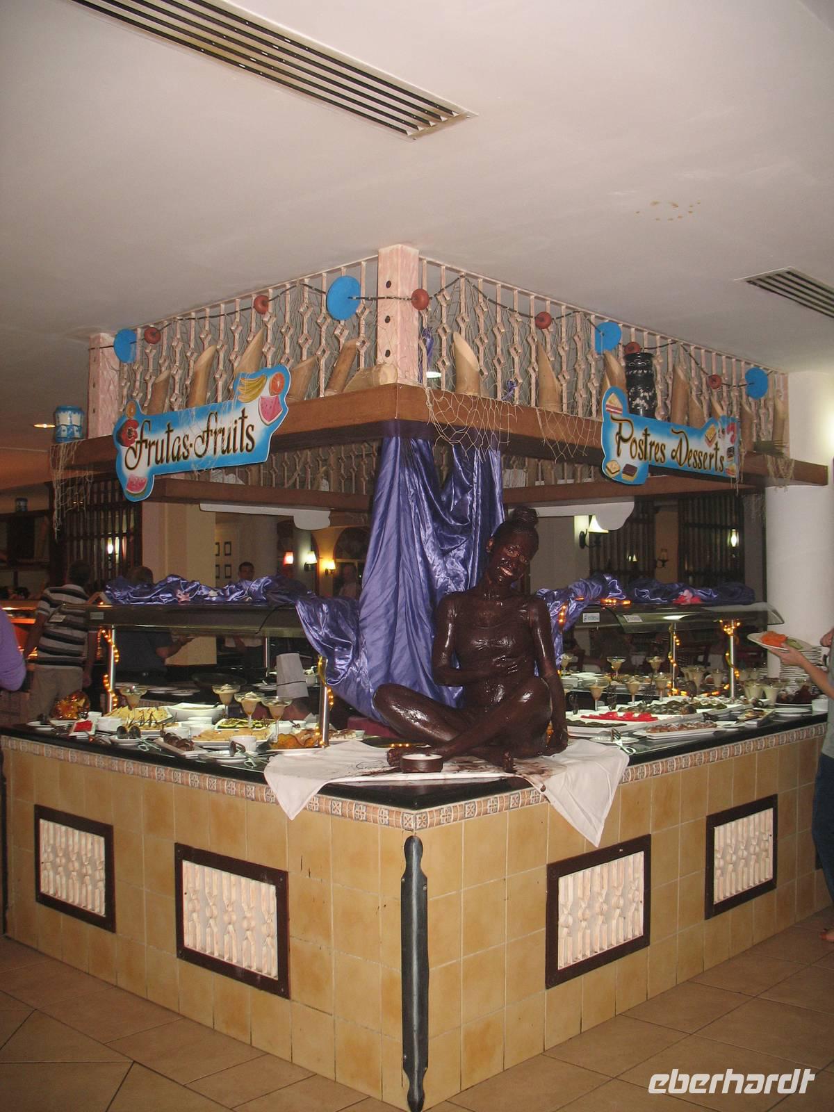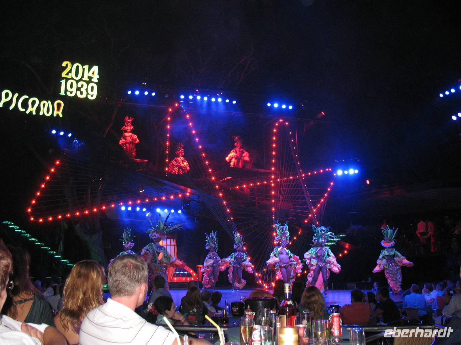 Der heutige Tag ähnelt sehr dem vergangenen Tag :-) Wir genießen wiederholt ein sehr leckeres Buffet zum Frühstück und Mittag, schauen uns für weitere Souvenirs auf dem Touristenmarkt um, entspannen gemeinsam am traumhaft weißen Strand, erzählen spannende Geschichten und schwimmen im Meer. Einige Gäste testen auch die Poolbar. Es ist schon toll, mitten im Pool zu stehen und Cocktails an der Bar zu trinken :-) Wir spazieren wieder gemeinsam zum leckeren Abendbuffet, immer noch ganz begeistert von der tollen Auswahl und den köstlichen Speisen. Eine mit Schokolade überzogene Dame sitzt ebenfalls wieder auf dem Süßigkeiten-Buffet. Heute findet die Show "Romántico" im hoteleigenen Theater statt, nicht so gut wie die anderen zwei Shows, aber auch nicht schlecht. Danach sind wir sehr müde, so dass wir uns auf unsere Zimmer zurückziehen.