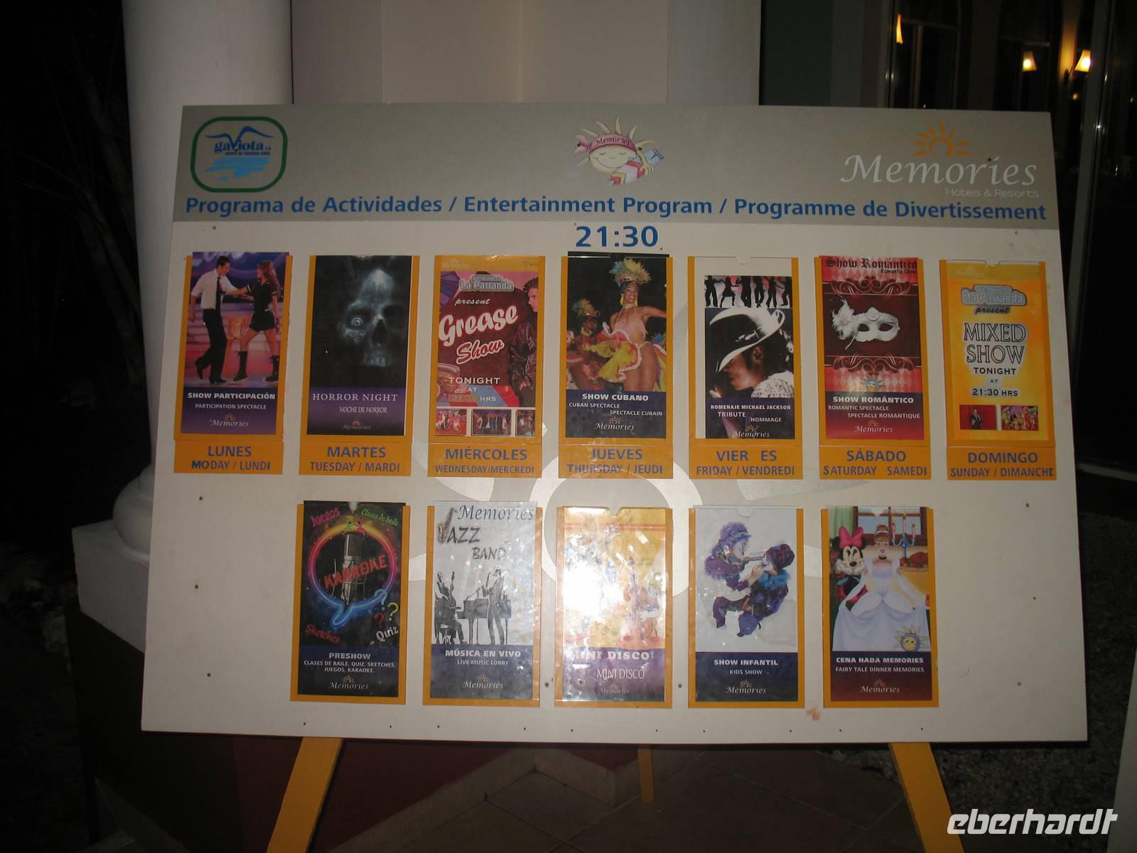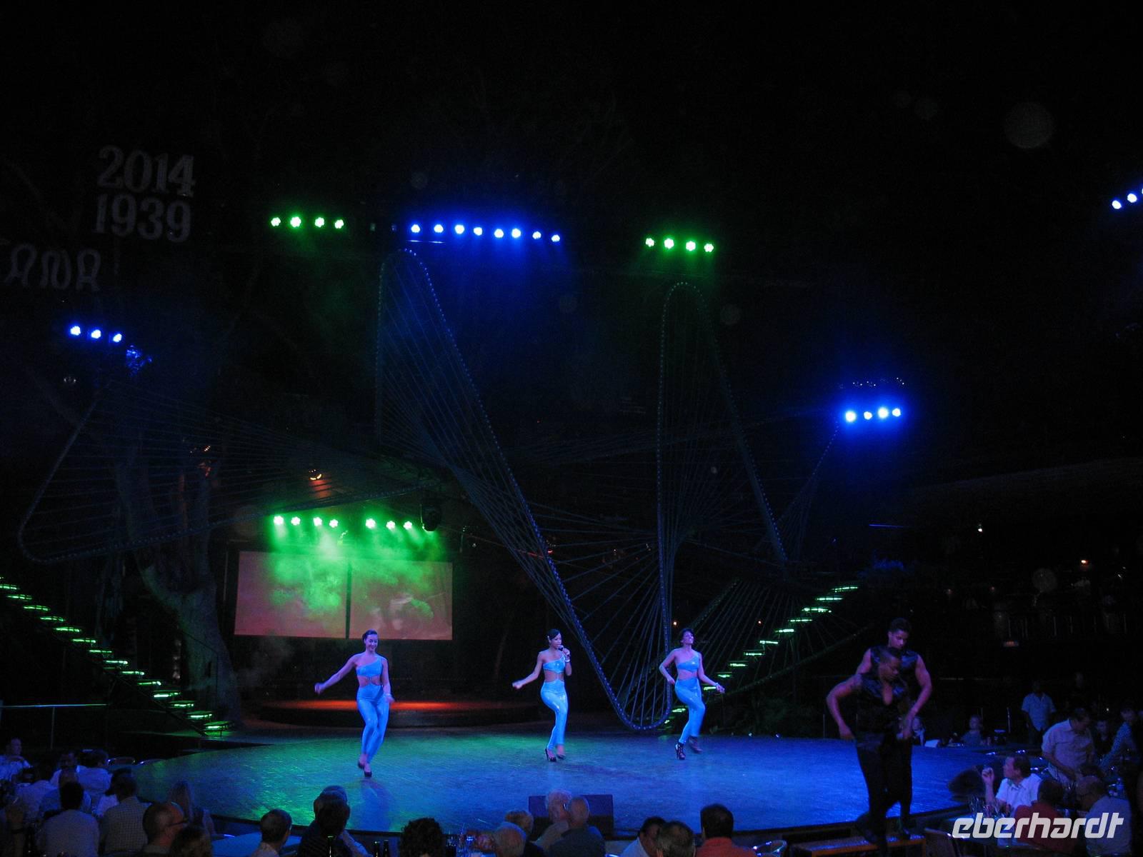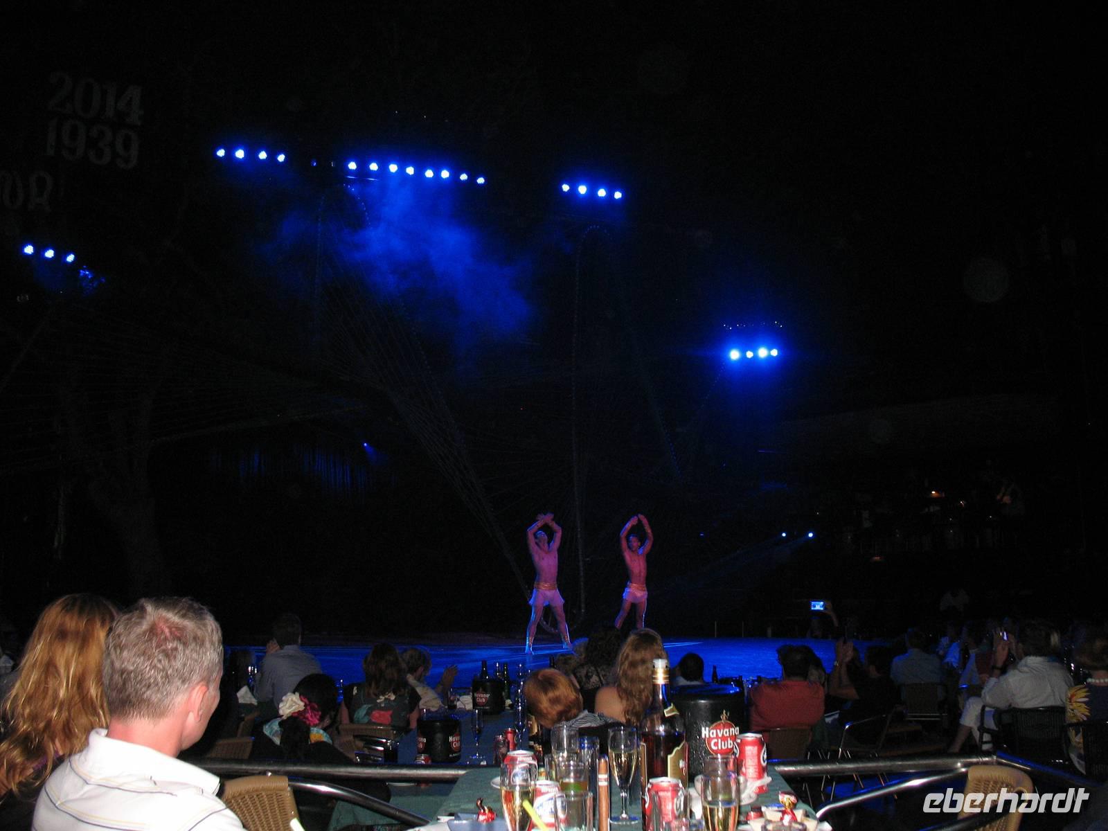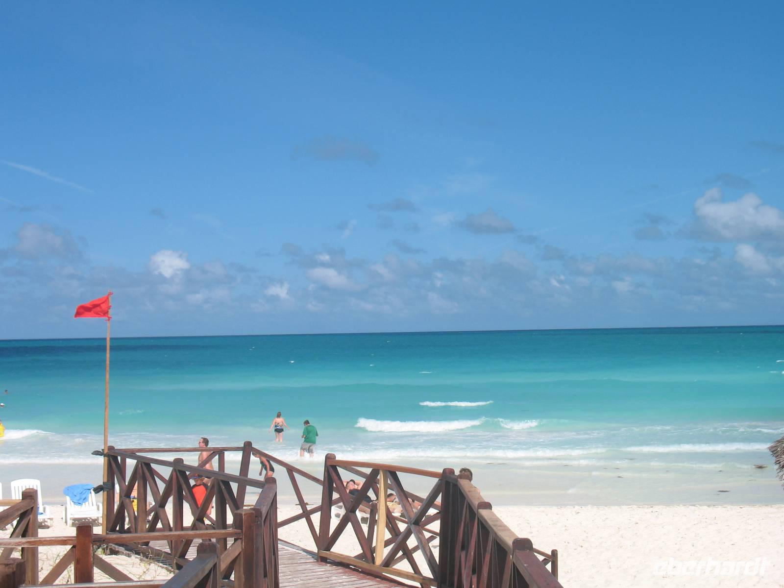 Der heutige Tag ähnelt sehr dem vergangenen Tag :-) Wir genießen wiederholt ein sehr leckeres Buffet zum Frühstück und Mittag, schauen uns für weitere Souvenirs auf dem Touristenmarkt um, entspannen gemeinsam am traumhaft weißen Strand, erzählen spannende Geschichten und schwimmen im Meer. Einige Gäste testen auch die Poolbar. Es ist schon toll, mitten im Pool zu stehen und Cocktails an der Bar zu trinken :-) Wir spazieren wieder gemeinsam zum leckeren Abendbuffet, immer noch ganz begeistert von der tollen Auswahl und den köstlichen Speisen. Eine mit Schokolade überzogene Dame sitzt ebenfalls wieder auf dem Süßigkeiten-Buffet. Heute findet die Show "Romántico" im hoteleigenen Theater statt, nicht so gut wie die anderen zwei Shows, aber auch nicht schlecht. Danach sind wir sehr müde, so dass wir uns auf unsere Zimmer zurückziehen.
