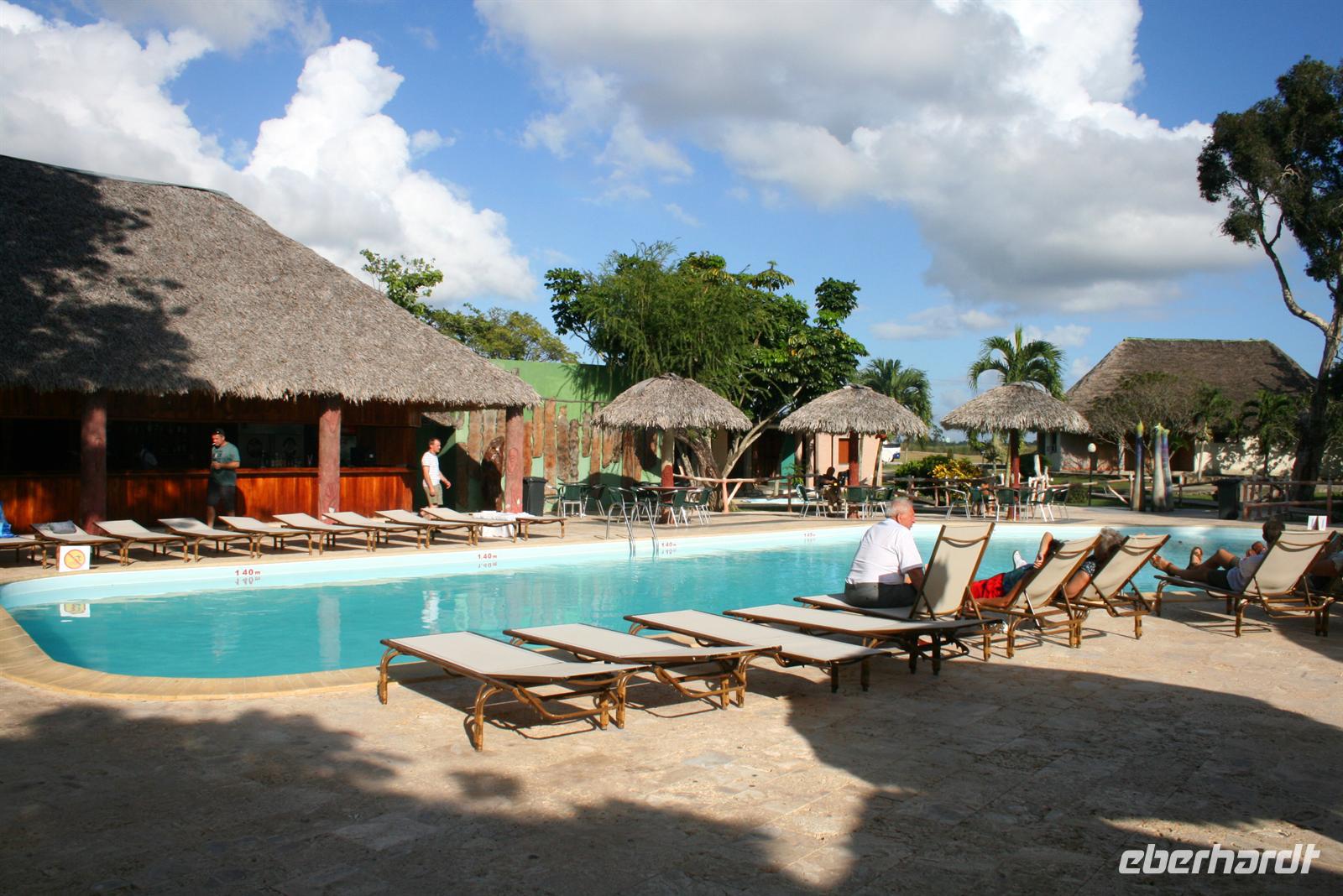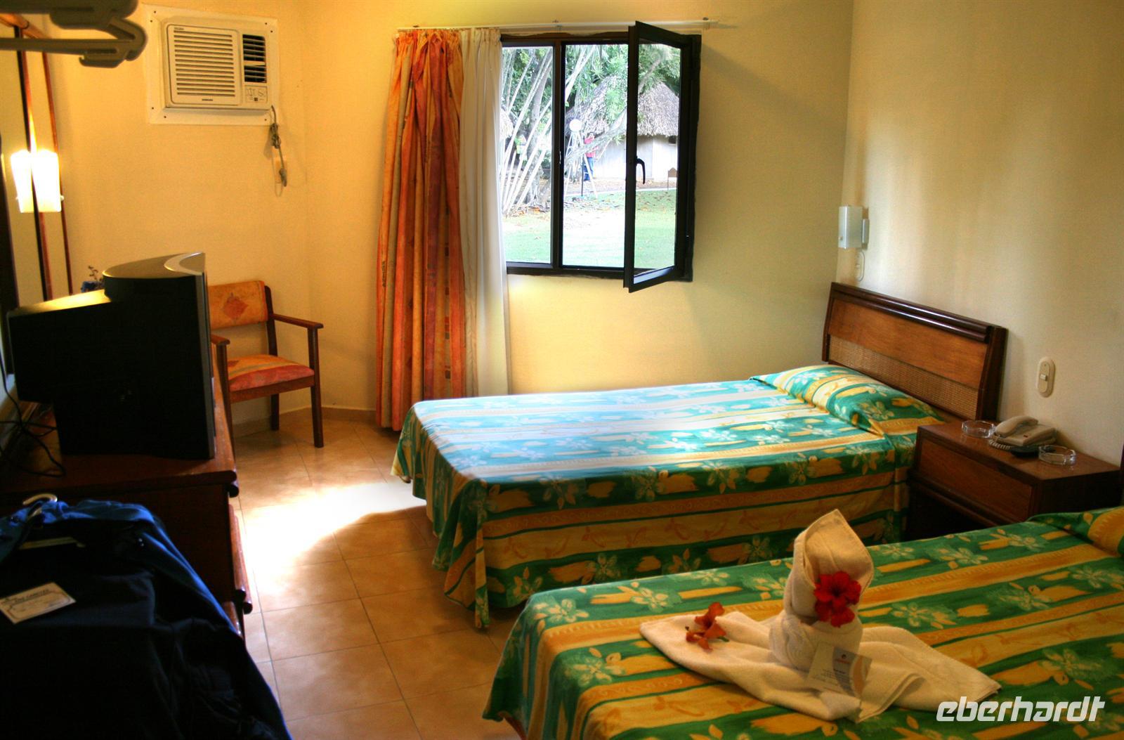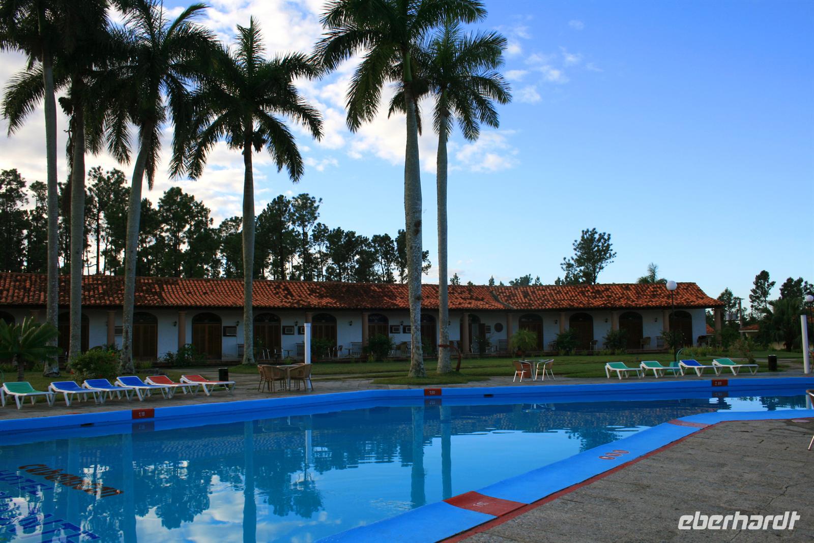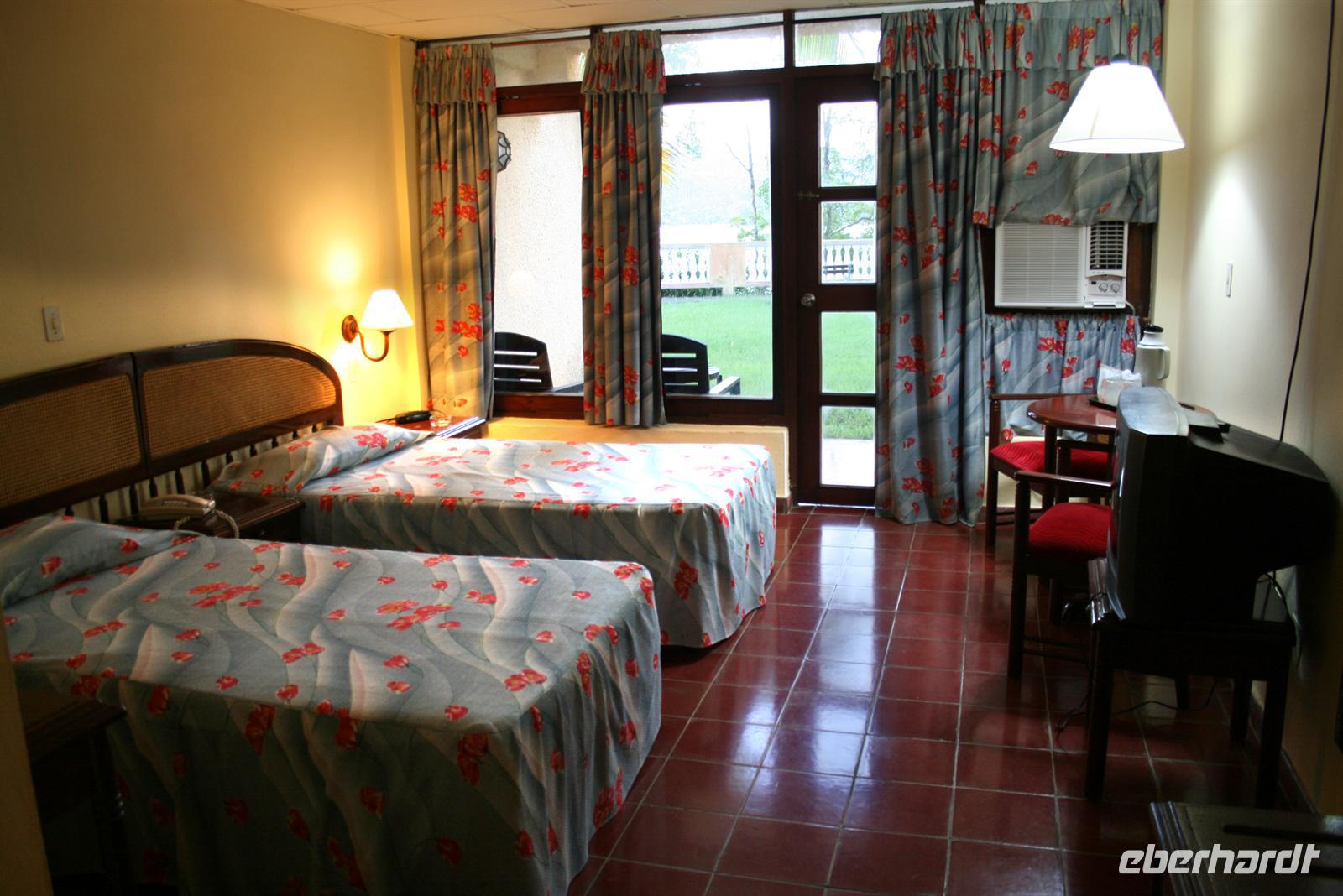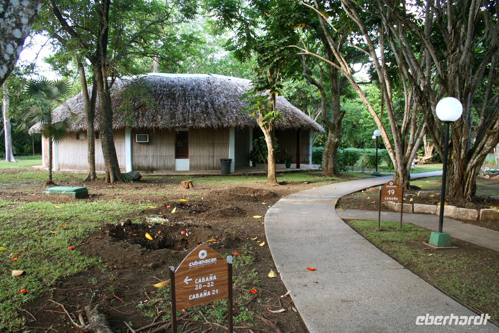 Gegen 15.00 Uhr gelangen wir zu unserem Hotel für die heutige Nacht. Die weitläufige Hotelanlage „La Granjita“ liegt etwa 2 Kilometer von Santa Clara entfernt und besteht aus verschieden großen Bungalows und Rundhütten mit Palmenblattdächern. Es gibt kleine Rundhütten, die ein Doppelzimmer darstellen und größere Rundhütten, in denen 4 bis 5 Doppelzimmer untergebracht sind. Die Bungalows sind ausgestattet mit Dusche/WC, Shampoo, TV, Telefon und Klimaanlage. (Hier kann es kleine Tiere/Eidechsen und Insekten im Zimmer geben, denn es ist eine parkähnliche Anlage)