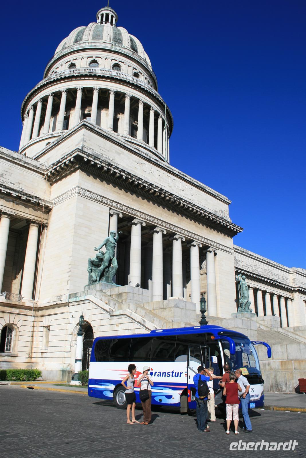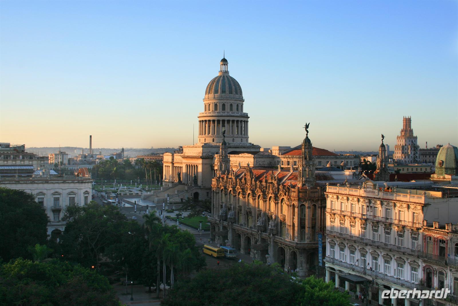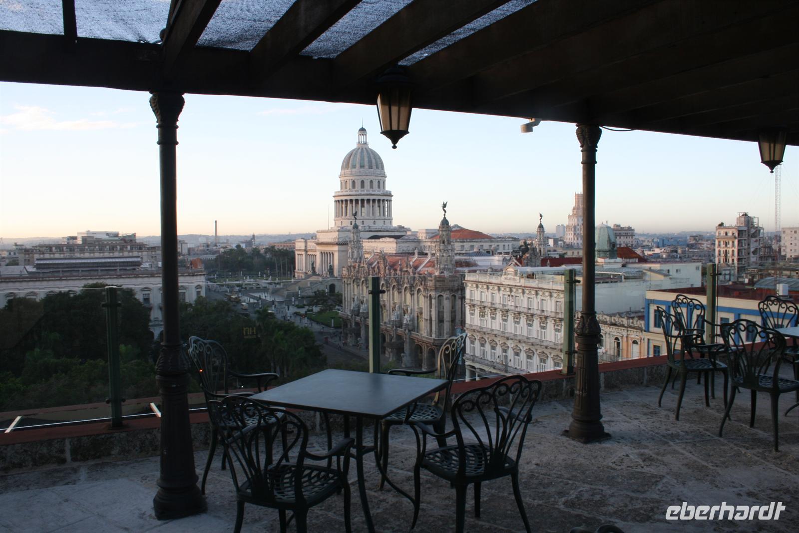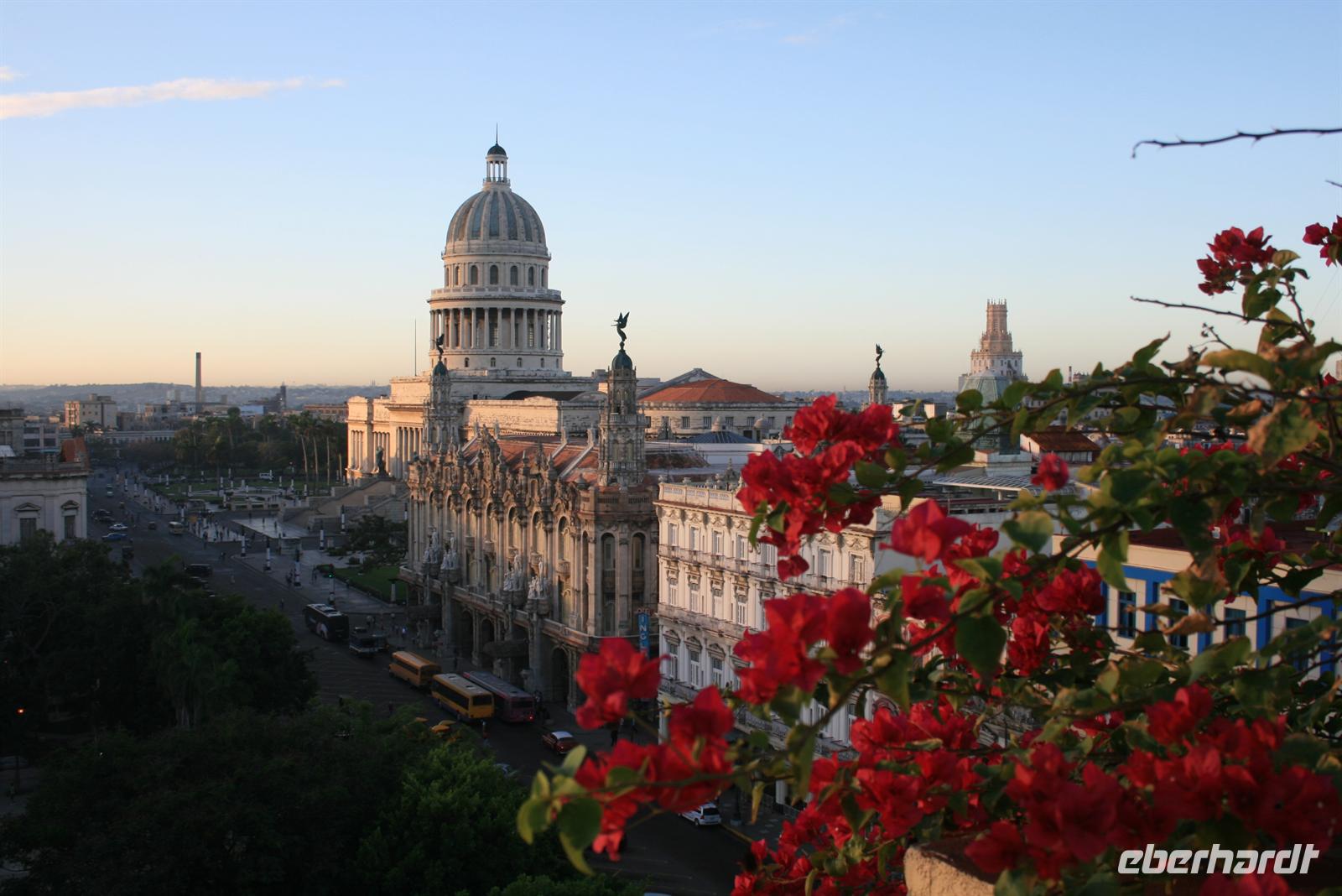 An der Küstenstraße warten schon drei Oldtimer, in denen wir nun eine Stadtrundfahrt durch Havanna unternehmen. Entlang des Malecons, der Küstenstraße, fahren wir in das reiche Villenviertel Havannas, in dem es zahlreiche Botschaften gibt. Außerdem besuchen wir einen grünen Park am Stadtrand und das berühmte 5-Sterne-Hotel „Nacional“, in dem schon viele bekannte Persönlichkeiten zu Gast waren. Hier werden wir am nächsten Tag auch die Tanzshow „Parisien“ besuchen. Die Oldtimer-Rundfahrt dauert etwa 2 Stunden. Gegen 17.00 Uhr fahren uns die Oldtimer direkt zu unserem Hotel „NH Parque Central“ in der Innenstadt. Die Zimmer des 5-Sterne-Hotels sind ausgestattet mit Bad mit Badewanne, Dusche und WC, Shampoo, Bademantel, Fön, TV, Telefon, Safe, Minibar und Klimaanlage. Das Hotel liegt nur 300 Meter vom Capitol Havannas entfernt. Von der Dachterrasse mit Swimmingpool und Café genießen wir einen tollen Blick über die Innenstadt und das Capitol.