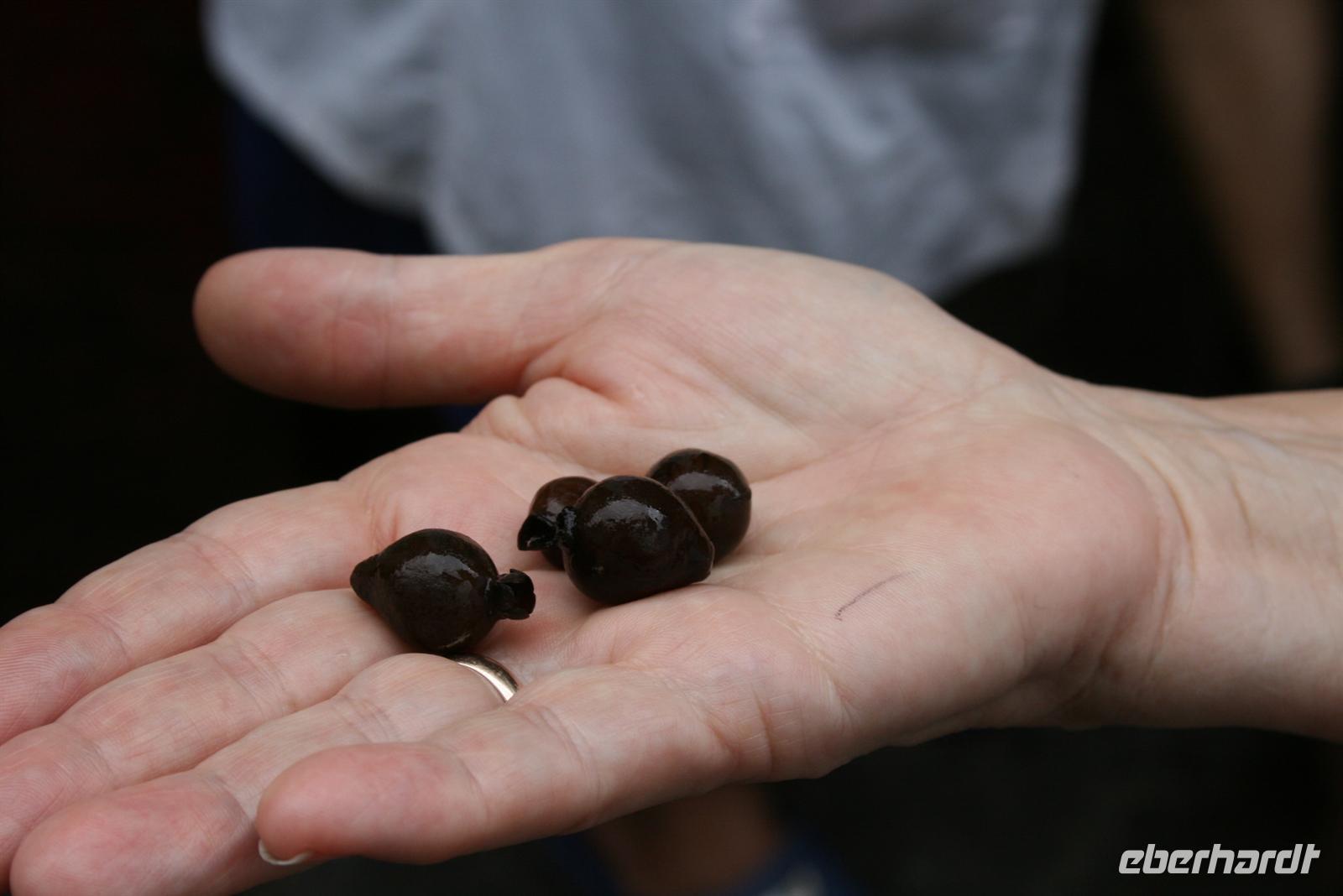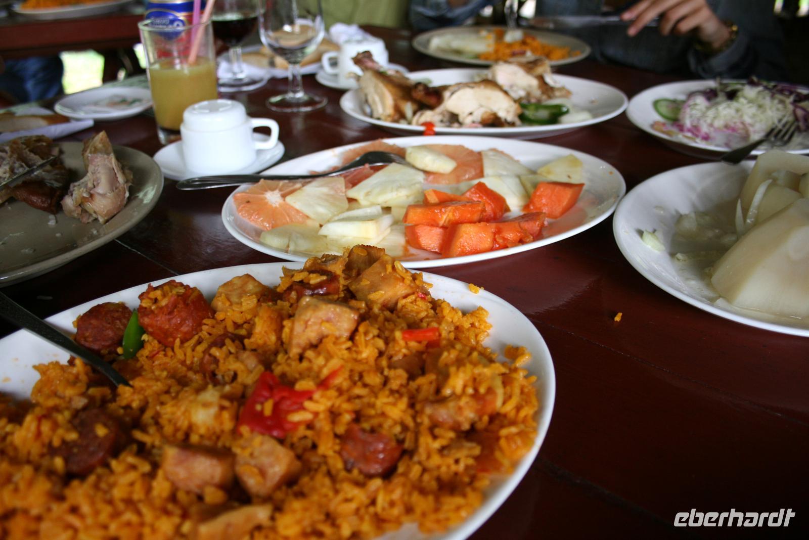 Schließlich gehen wir bei der Regenwald-Lodge an Land und einige von uns probieren einen Cocktail aus Grapefruitsaft und Rum, der direkt aus der Grapefruit getrunken wird - lecker und sehr erfrischend! In der Lodge sind wir nun zum Mittagessen eingeladen. Bei kubanischer Live-Musik lassen wir uns Spanferkel, Gemüsebeilagen und einen typischen Gemüse-Eintopf schmecken.