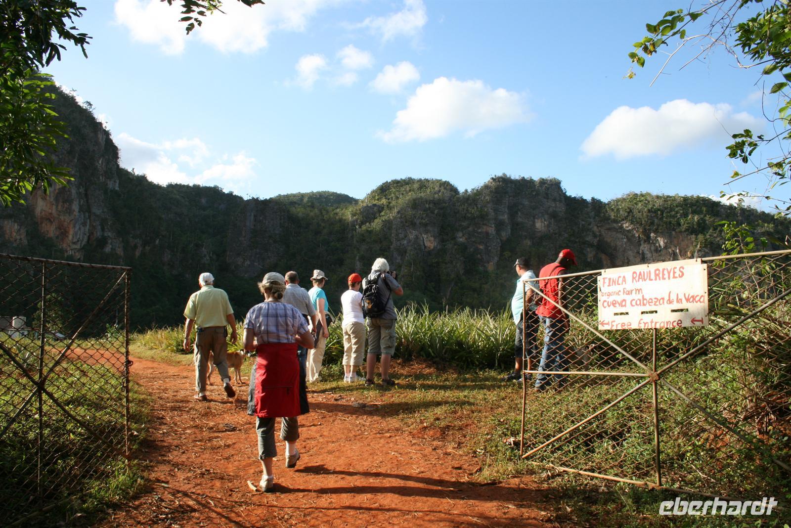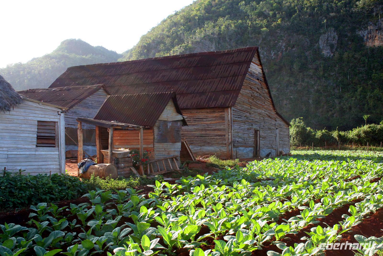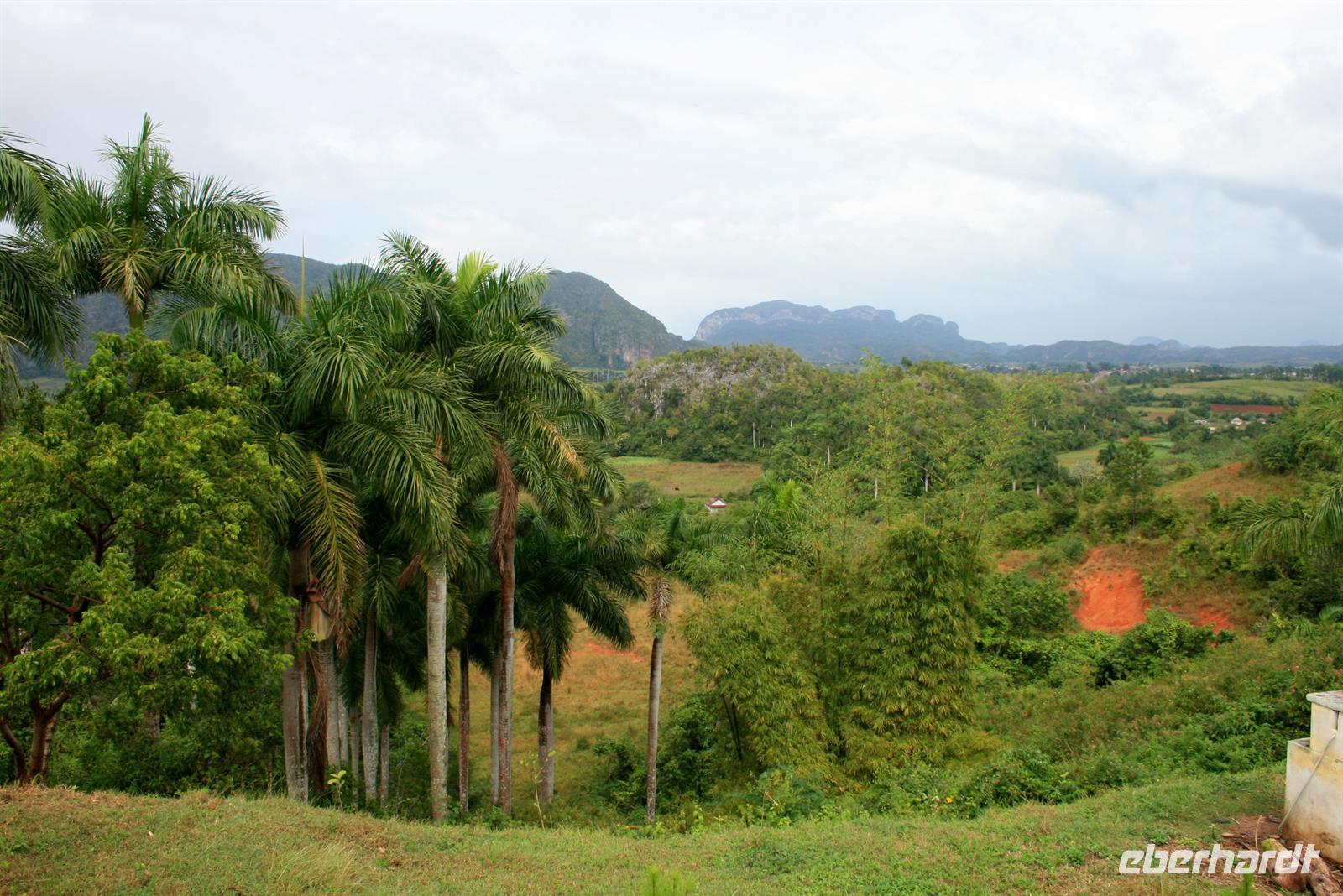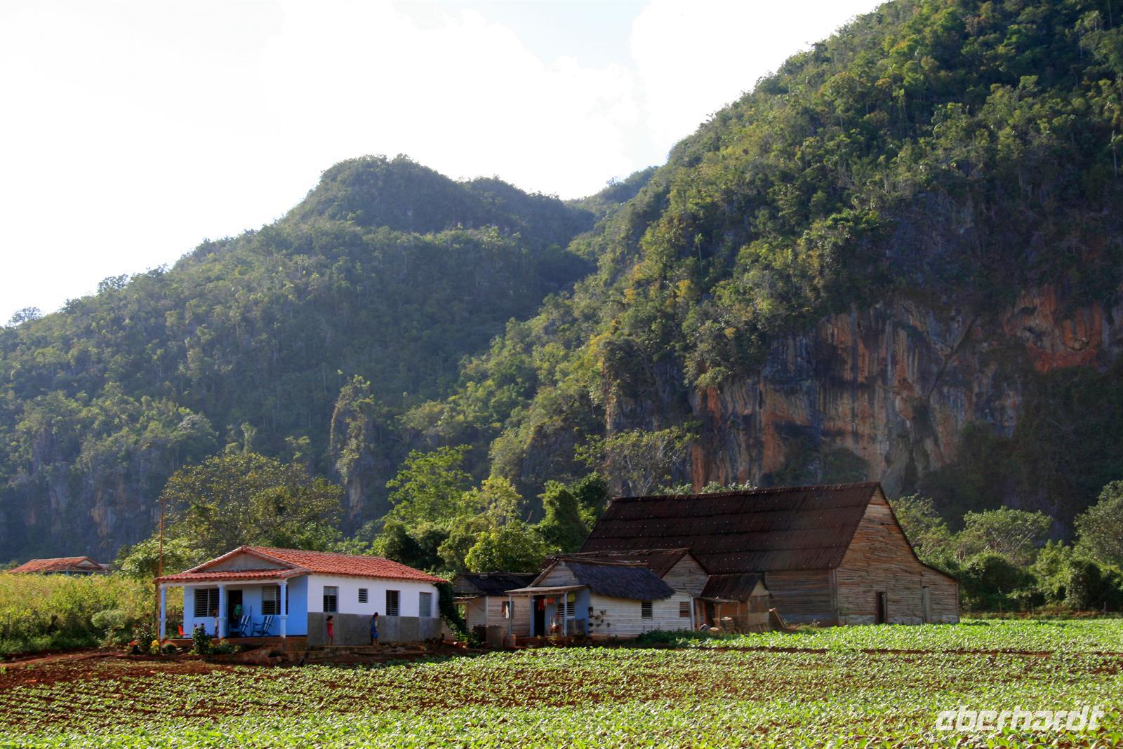 Auf der Landstraße geht es weiter in das wunderbar grüne Vinales-Tal. Leider ist das Wetter heute nicht so gut. Es ist zwar warm (30°C), aber es gibt einige Regenschauer, sodass eine Regenjacke unbedingt zu empfehlen ist - auch jetzt in der Trockenzeit. Die Luftfeuchte ist ebenfalls sehr hoch. Das Vinales-Tal besteht aus grünen Weide- und Ackerbauflächen sowie den typischen Karstfelsen, wie es sie auch in Vietnam und China zu sehen gibt. Berühmt ist die Region für den Tabakanbau - früher auch als „Aschenbecher“ Kubas bezeichnet. Aber auch Kaffee, Obst und Gemüse gedeihen hier prächtig.