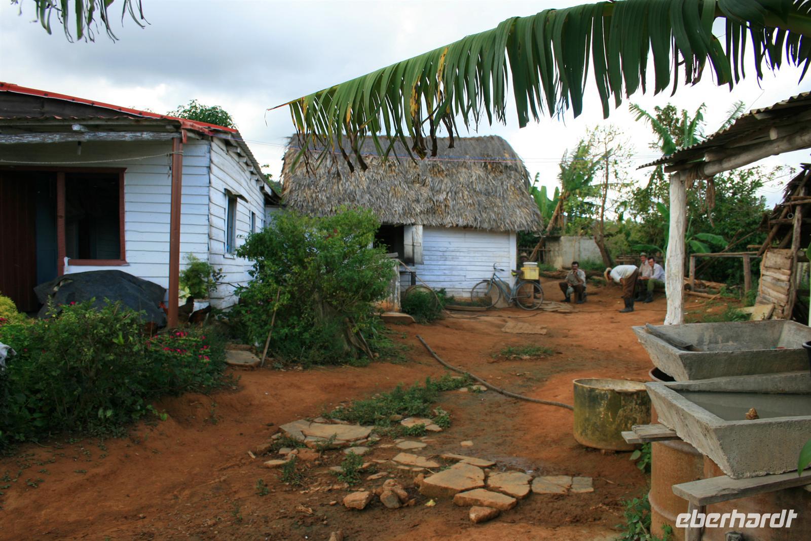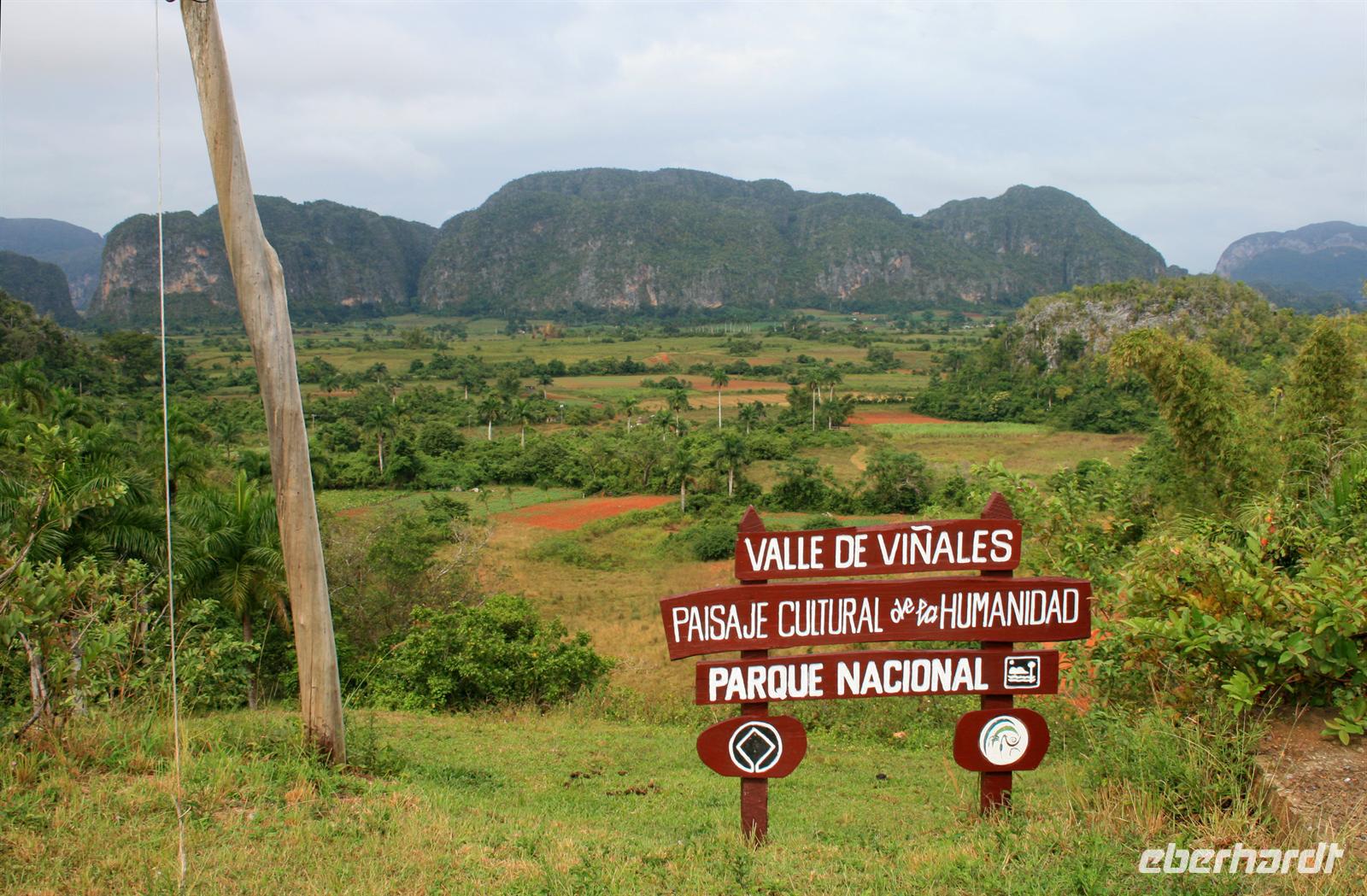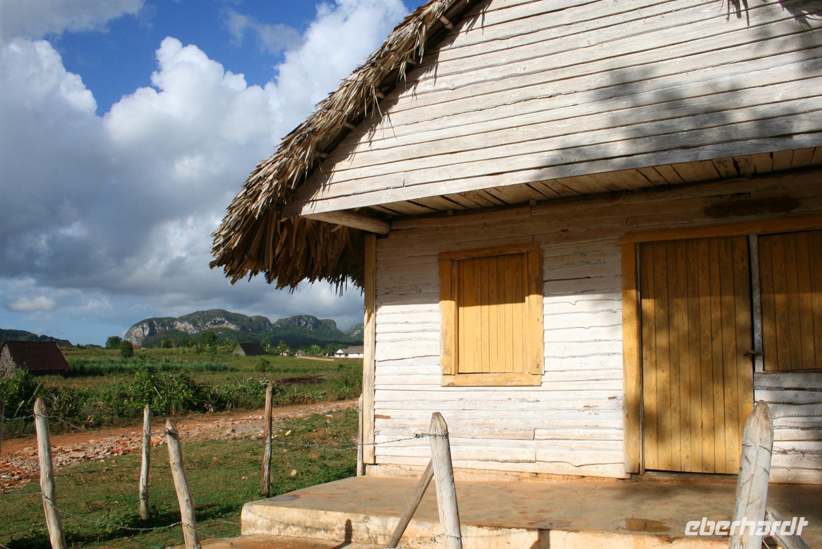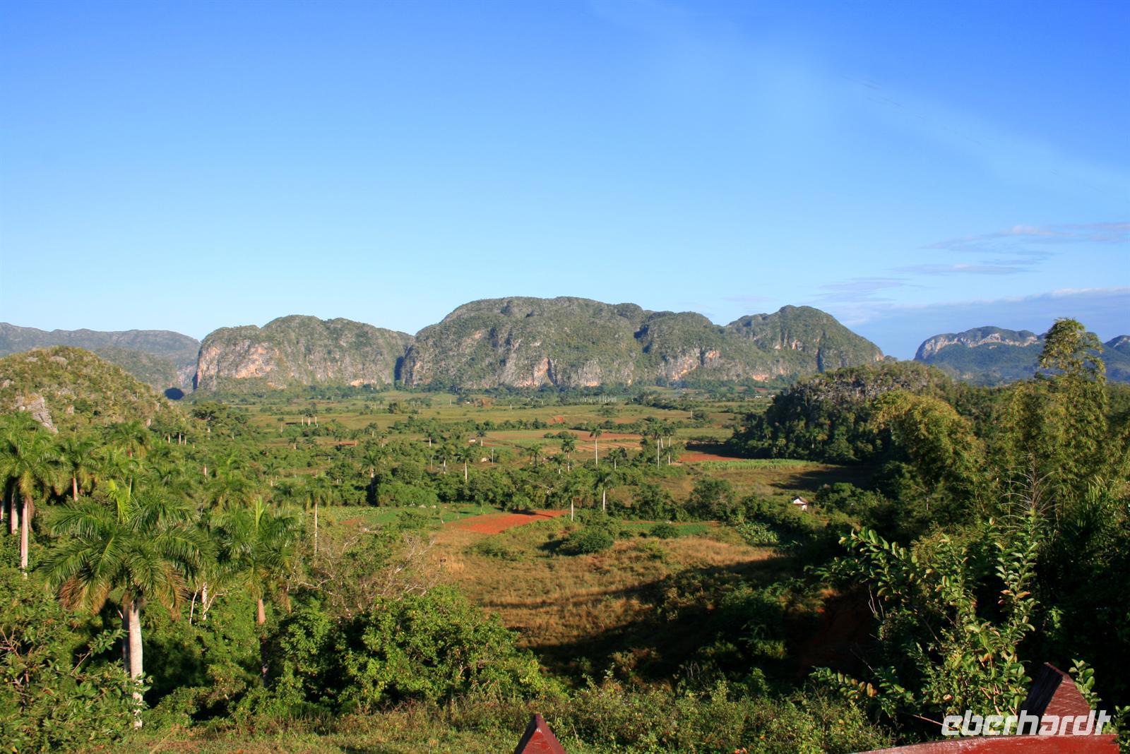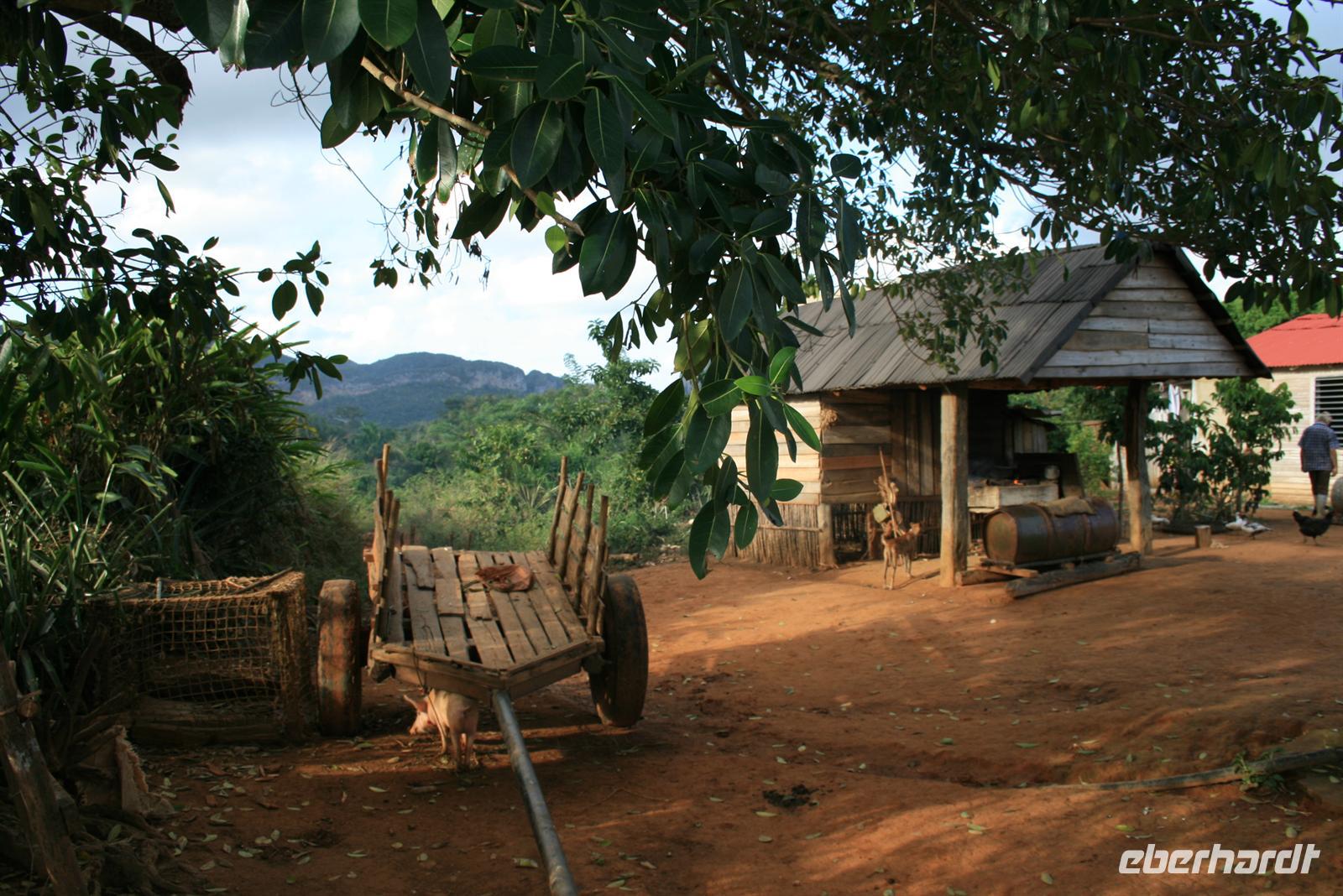 Auf der Landstraße geht es weiter in das wunderbar grüne Vinales-Tal. Leider ist das Wetter heute nicht so gut. Es ist zwar warm (30°C), aber es gibt einige Regenschauer, sodass eine Regenjacke unbedingt zu empfehlen ist - auch jetzt in der Trockenzeit. Die Luftfeuchte ist ebenfalls sehr hoch. Das Vinales-Tal besteht aus grünen Weide- und Ackerbauflächen sowie den typischen Karstfelsen, wie es sie auch in Vietnam und China zu sehen gibt. Berühmt ist die Region für den Tabakanbau - früher auch als „Aschenbecher“ Kubas bezeichnet. Aber auch Kaffee, Obst und Gemüse gedeihen hier prächtig.