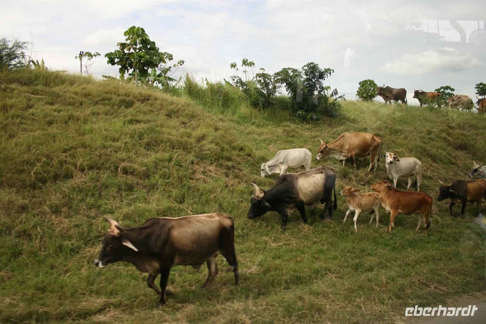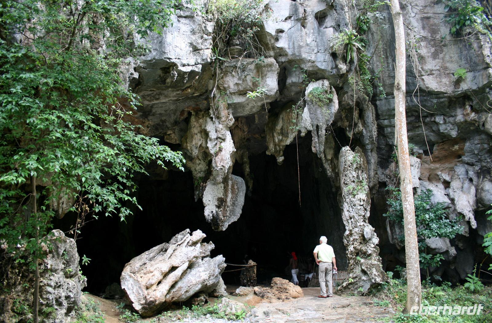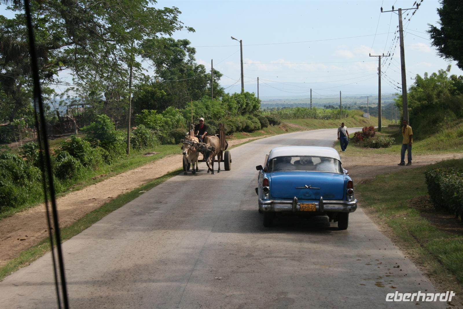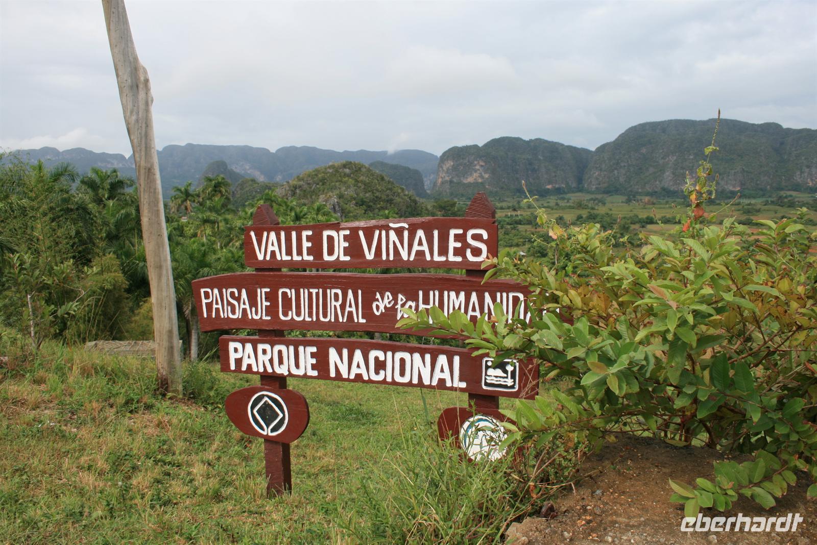 Auf der Landstraße geht es weiter in das wunderbar grüne Vinales-Tal. Leider ist das Wetter heute nicht so gut. Es ist zwar warm (30°C), aber es gibt einige Regenschauer, sodass eine Regenjacke unbedingt zu empfehlen ist - auch jetzt in der Trockenzeit. Die Luftfeuchte ist ebenfalls sehr hoch. Das Vinales-Tal besteht aus grünen Weide- und Ackerbauflächen sowie den typischen Karstfelsen, wie es sie auch in Vietnam und China zu sehen gibt. Berühmt ist die Region für den Tabakanbau - früher auch als „Aschenbecher“ Kubas bezeichnet. Aber auch Kaffee, Obst und Gemüse gedeihen hier prächtig.